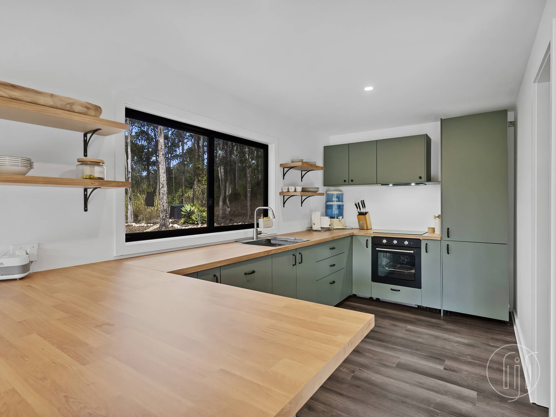 The kitchen is modern in its design with timber look benchtops, glass hotplates and under bench oven. There is good cupboard space, open pantry shelving and a spacious breakfast bar.