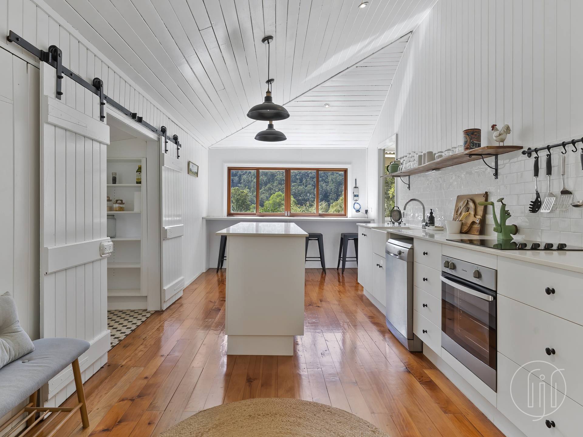 The kitchen has been thoughtfully designed with a large centre island bench, spacious walk-in butler’s pantry, stainless steel appliances including dishwasher, electric hotplates and under bench oven, and bench seating in front of the windows that highlights the view like a picture frame.