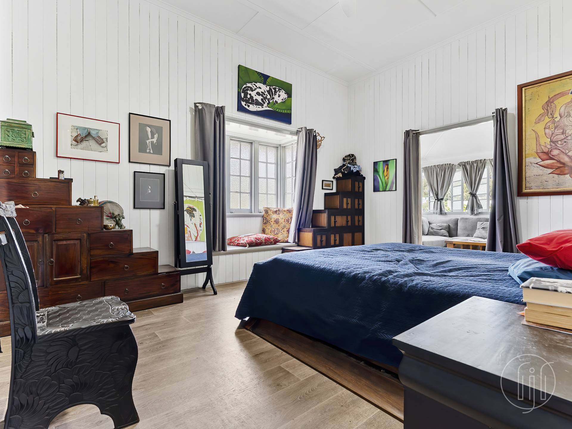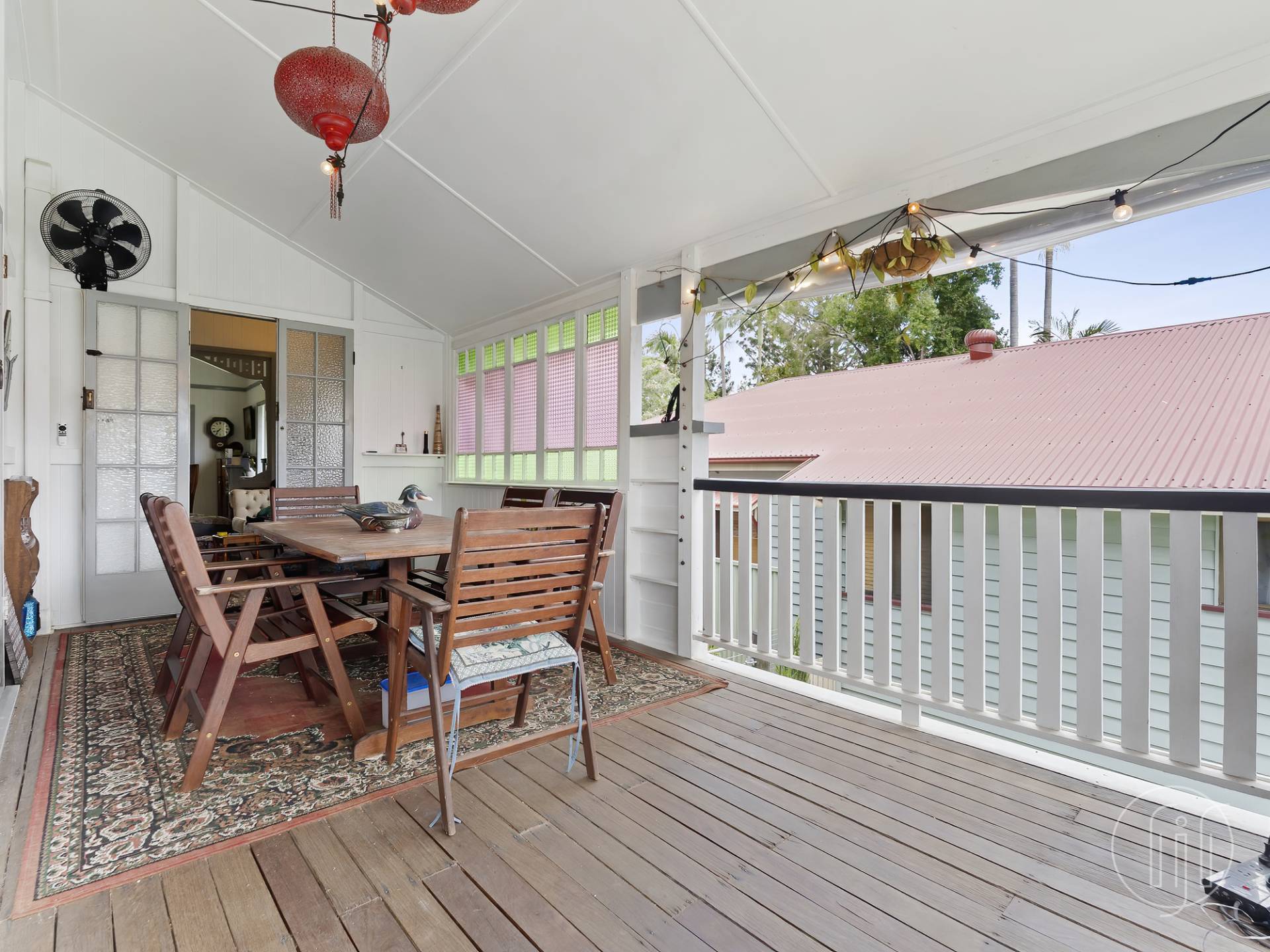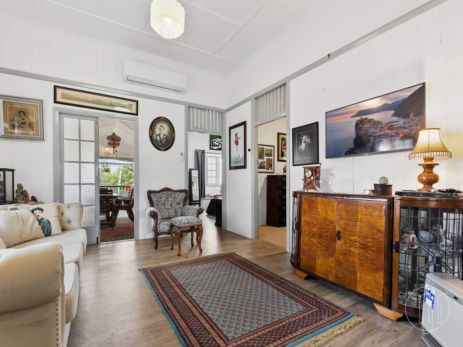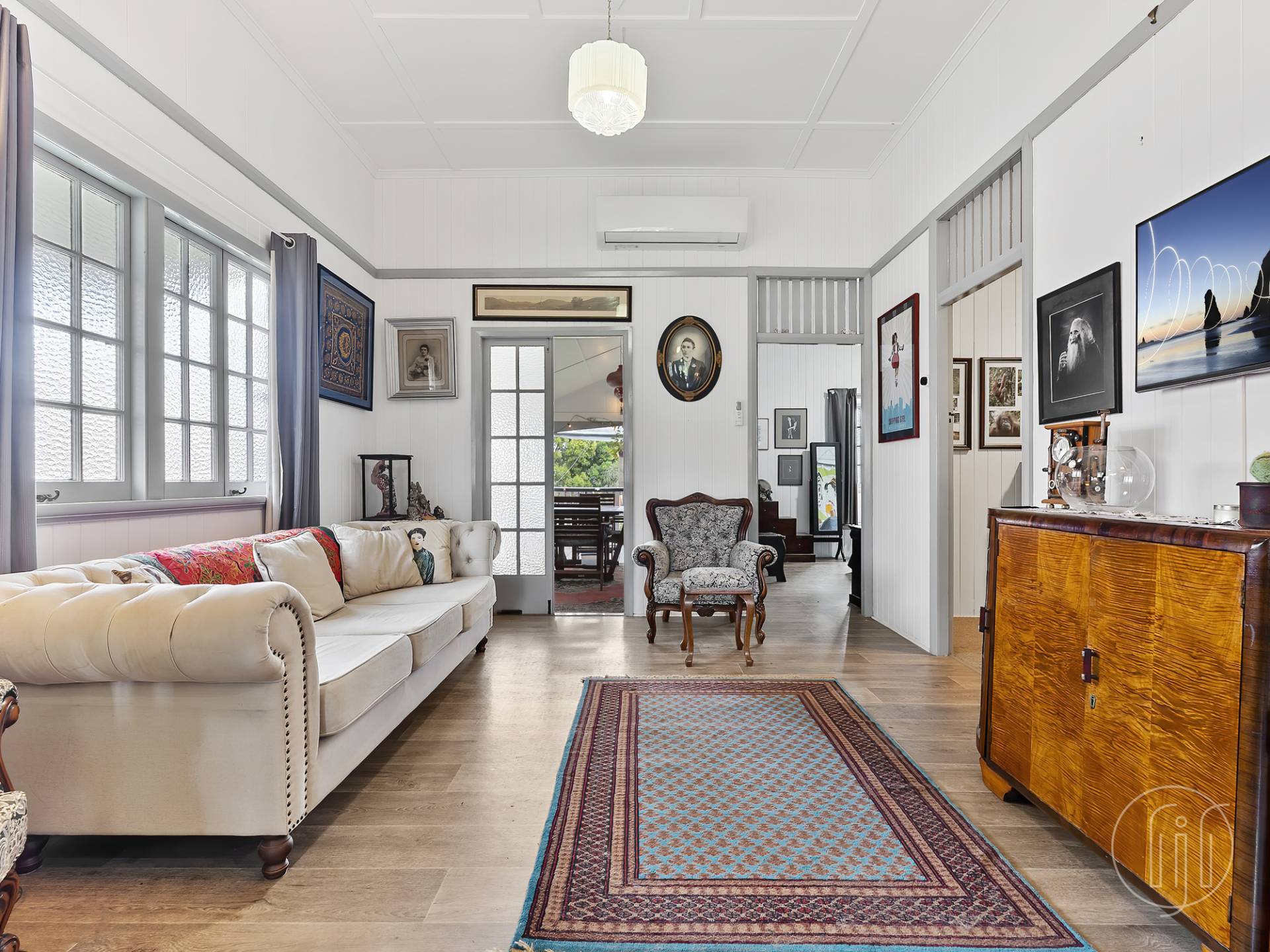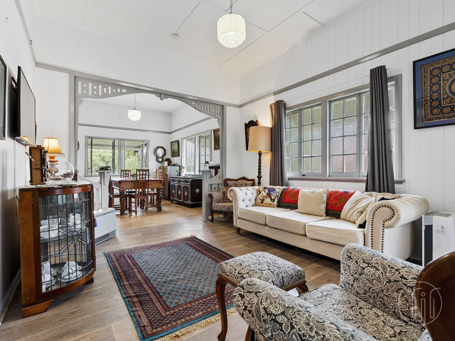 Step inside through classic casement doors into the inviting lounge, complete with reverse-cycle air conditioning, before flowing seamlessly through to the dining space, where double casement windows allow natural light to pour in. High ceilings, original period trims and VJ walls feature throughout the home, preserving the elegance and warmth Queenslanders are loved for.