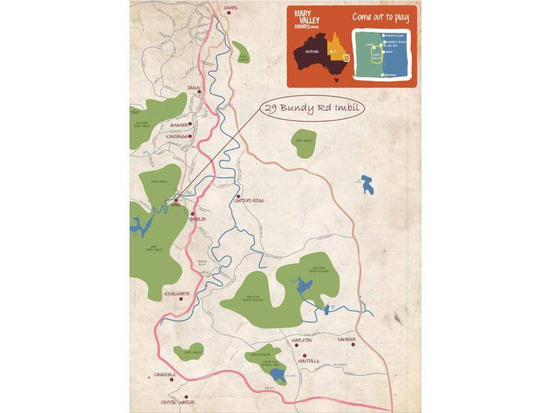 Imbil is in MARY VALLEY COUNTRY, 30 minutes from Gympie and 45 minutes from the coast at Noosa. It has easy access to the up-graded highway and is 2 hours from the centre of Brisbane.