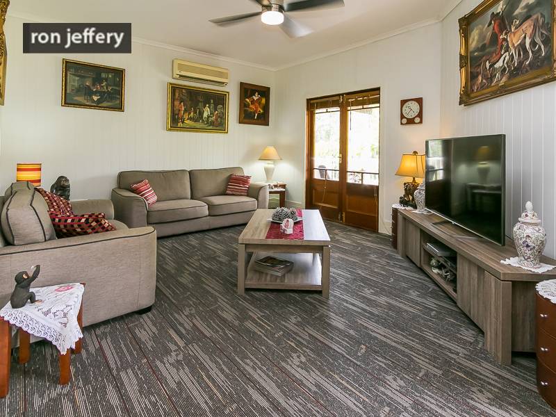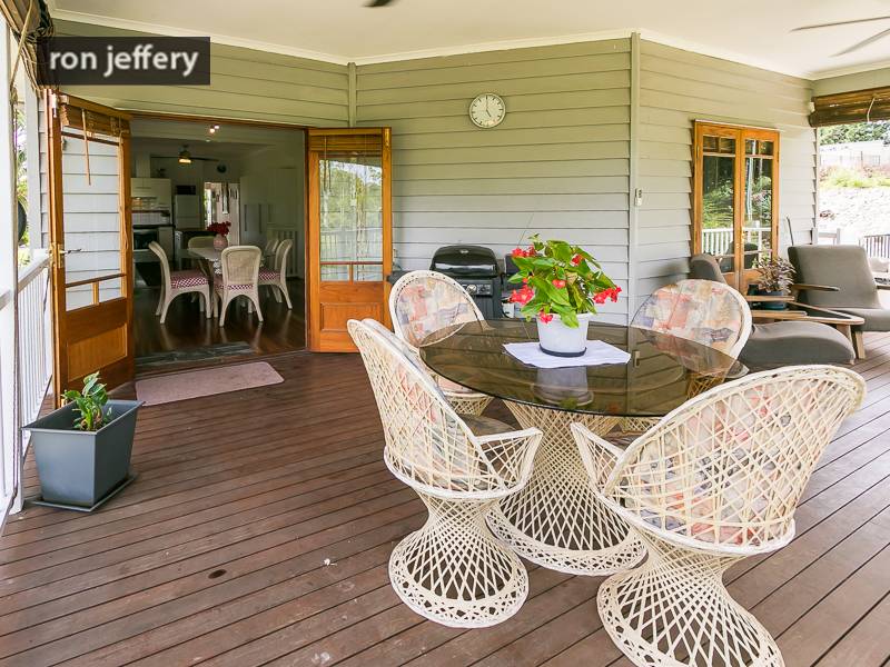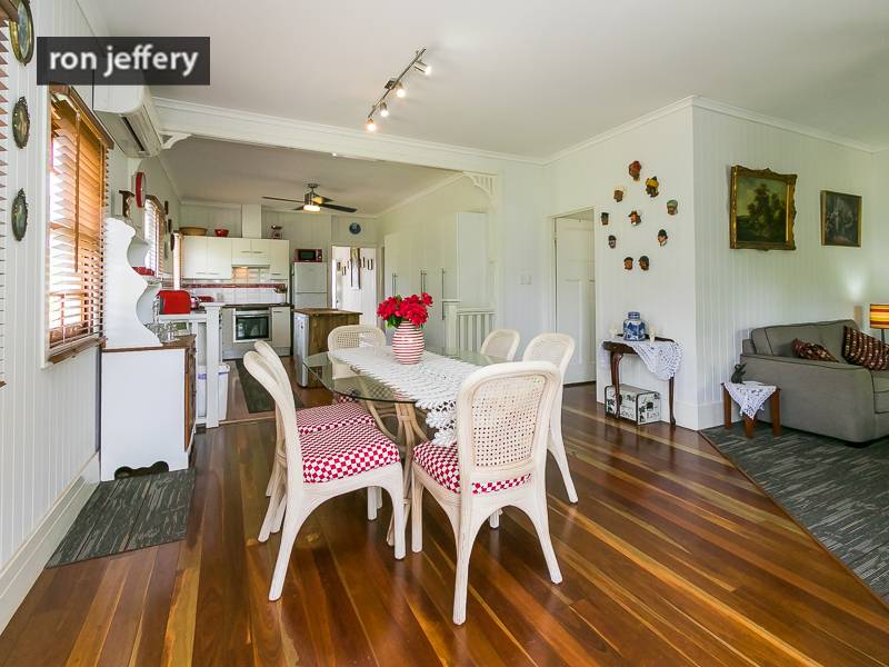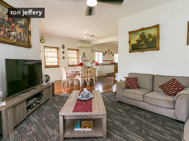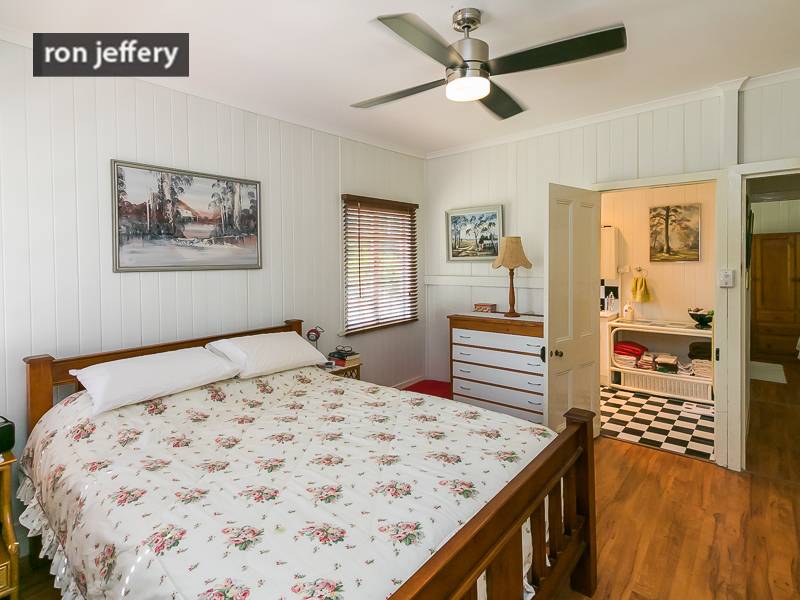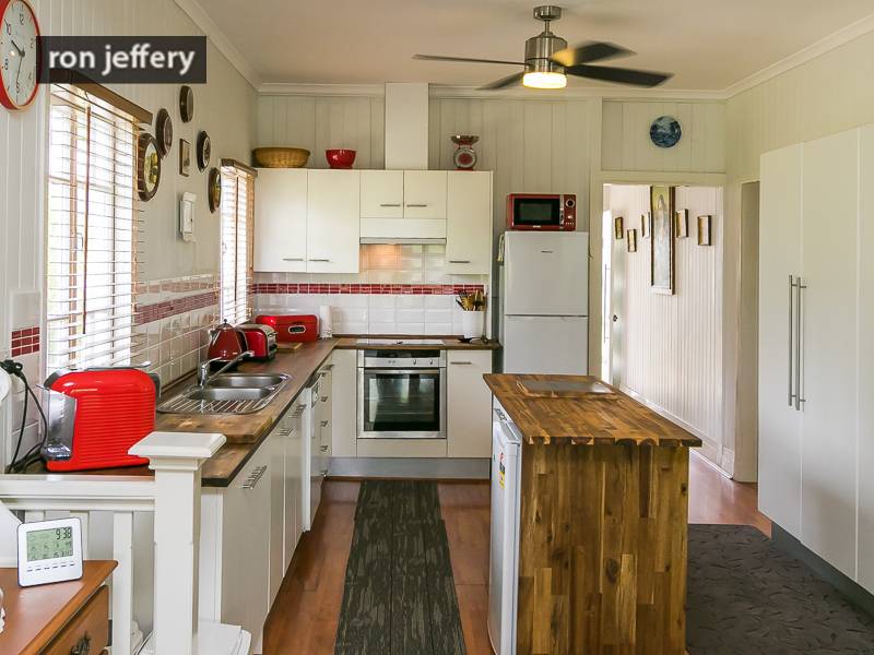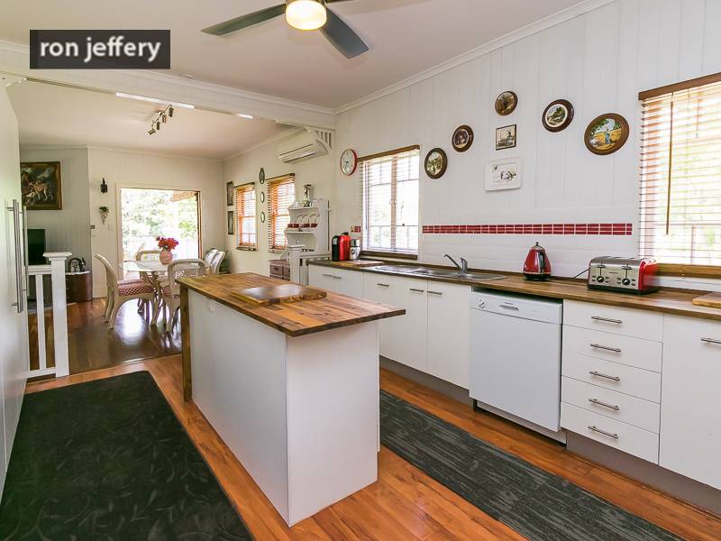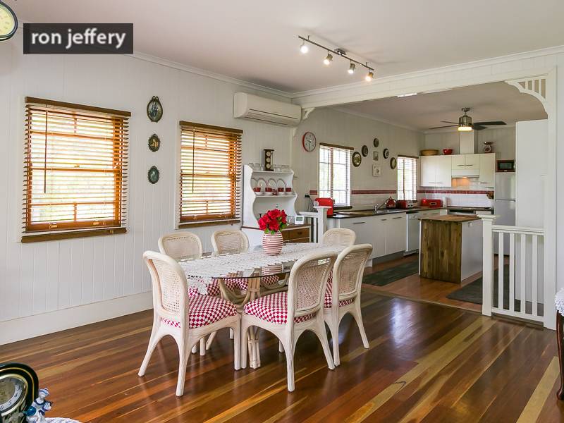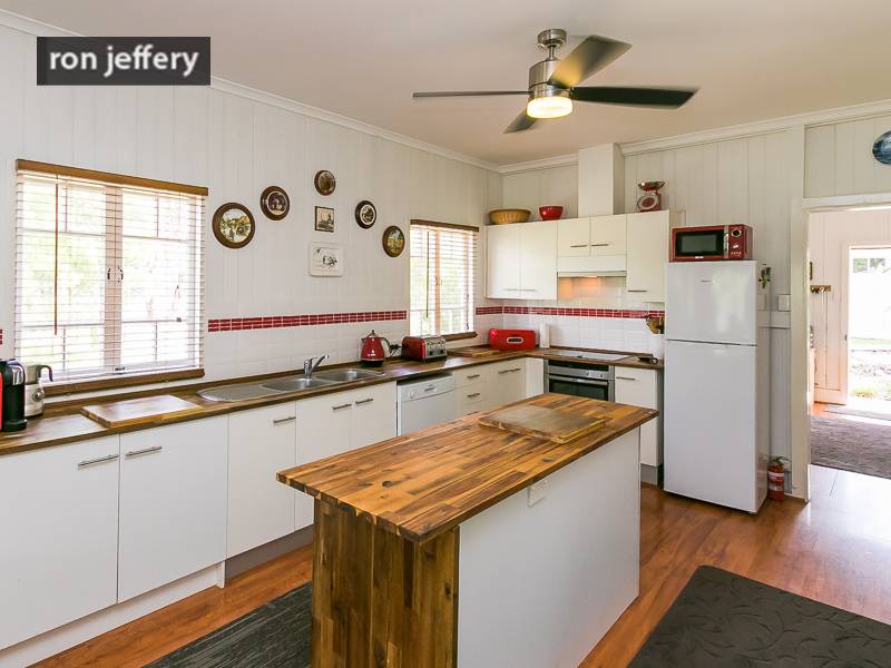 You enter the weatherboard home via a wide, covered deck. A great place to take in the rural surrounds. The dining room, with its polished timber floors, separates the carpeted lounge room from the modernised kitchen. The living areas feature timber walls, high ceilings and air conditioning. There are ceiling fans everywhere!