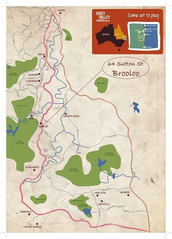 Sutton St Brooloo is just 5 minutes from all the services at Imbil. Just an outer suburb really. Number 64 is a vacant 2,745 m2 lot that already has a levelled house site. It is in a no-through-road section of Sutton St, so it is private and quiet. Large residential lots are rare, so don’t delay or it might be gone.