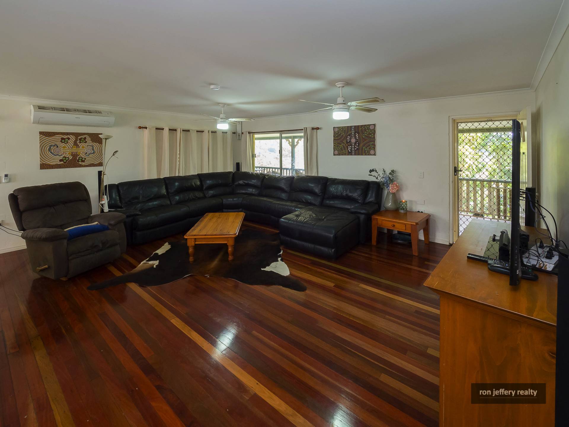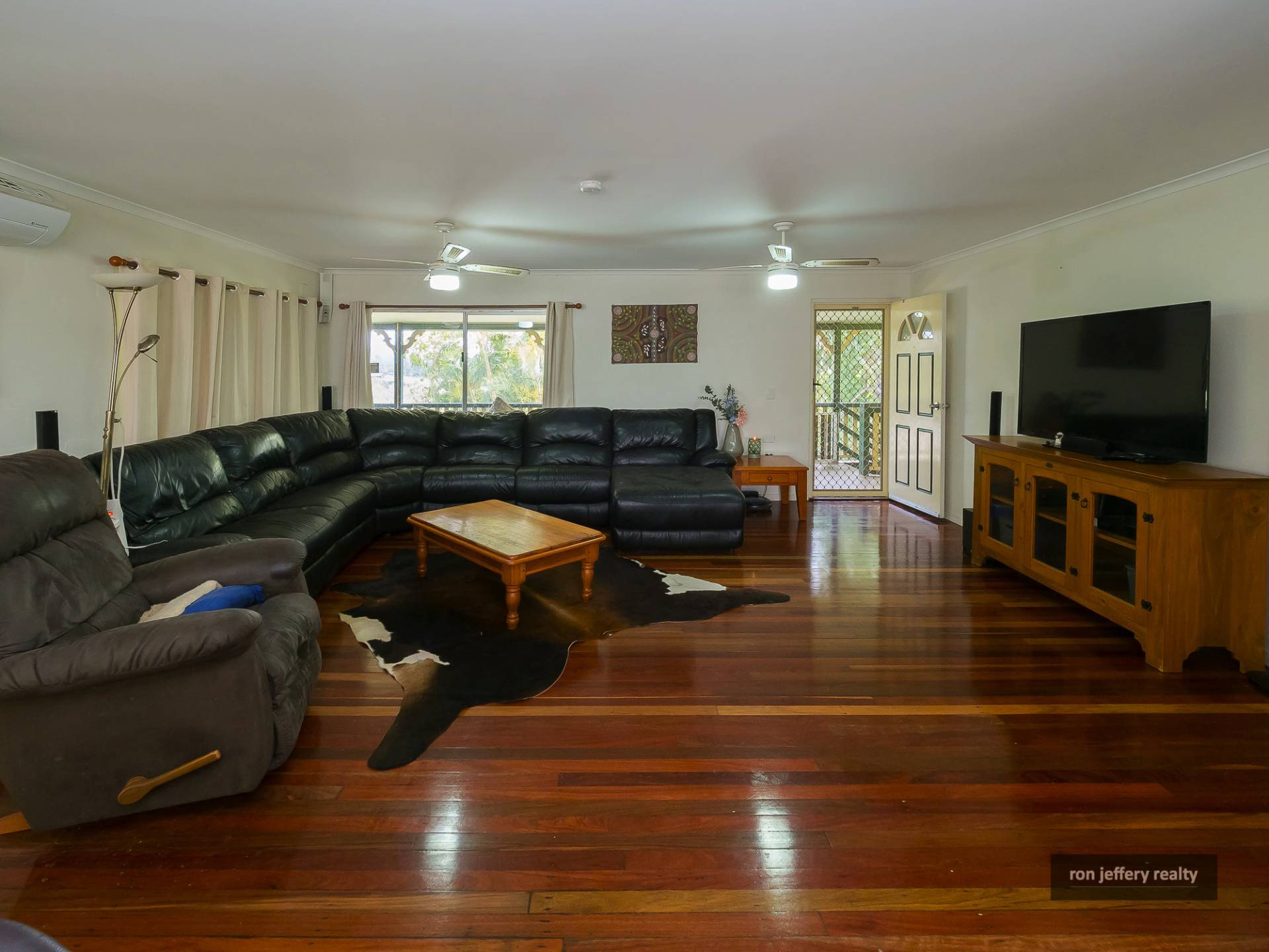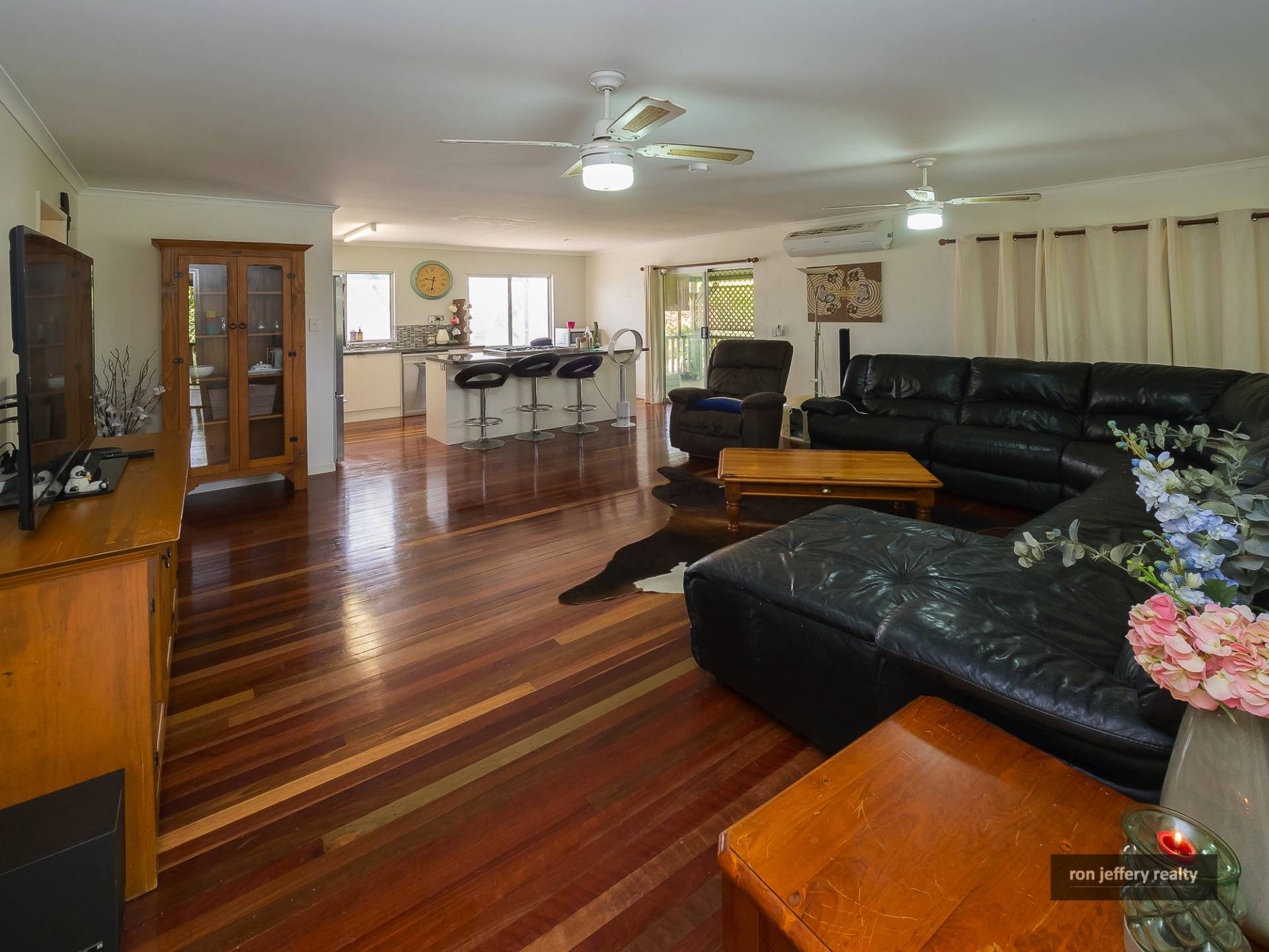 Upstairs, there is a wide veranda on two sides of the home offering extensive views and plenty of entertainment options. You enter the home straight into a large open plan living room with polished timber floors and air conditioning. In fact, there are timber floors right through the home.