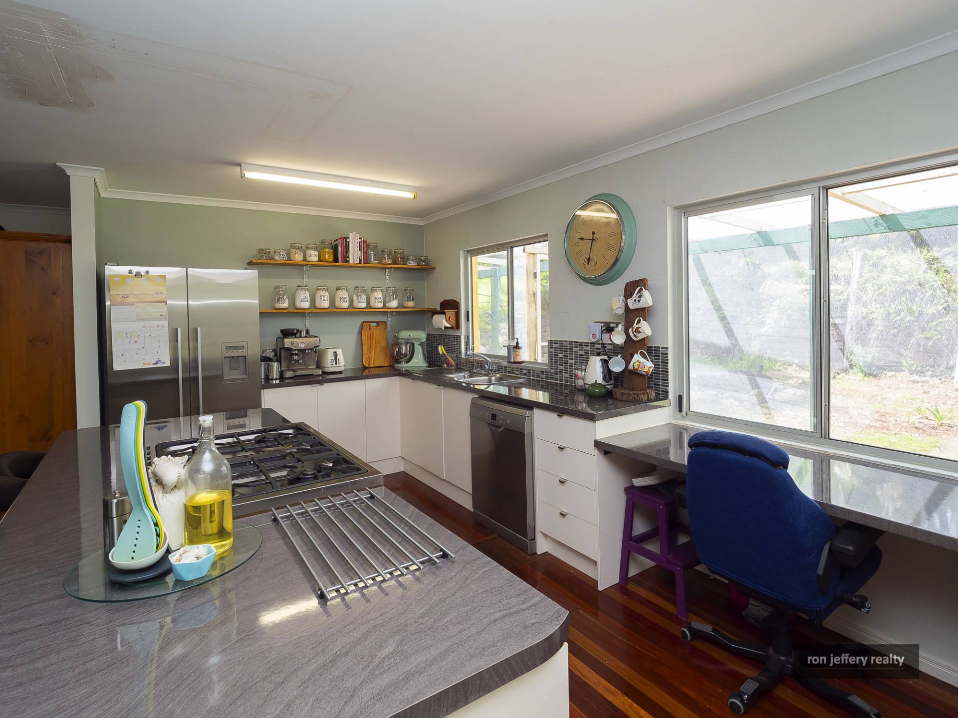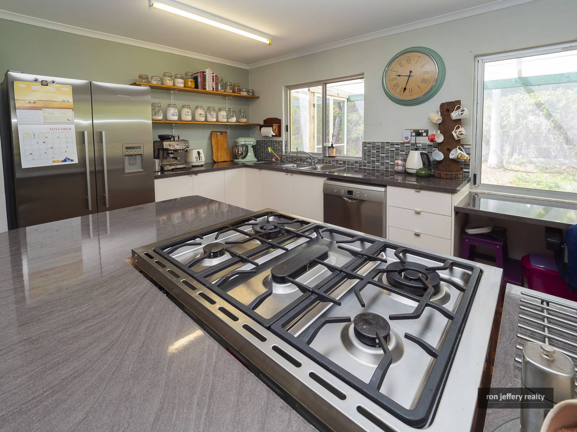 The island bench, home to a freestanding stainless steel, 5 burner gas stove, is the focal point of a recently updated kitchen. Attractive open display shelving, soft close doors & drawers, a dishwasher and writing nook are other features in this chef’s kitchen.