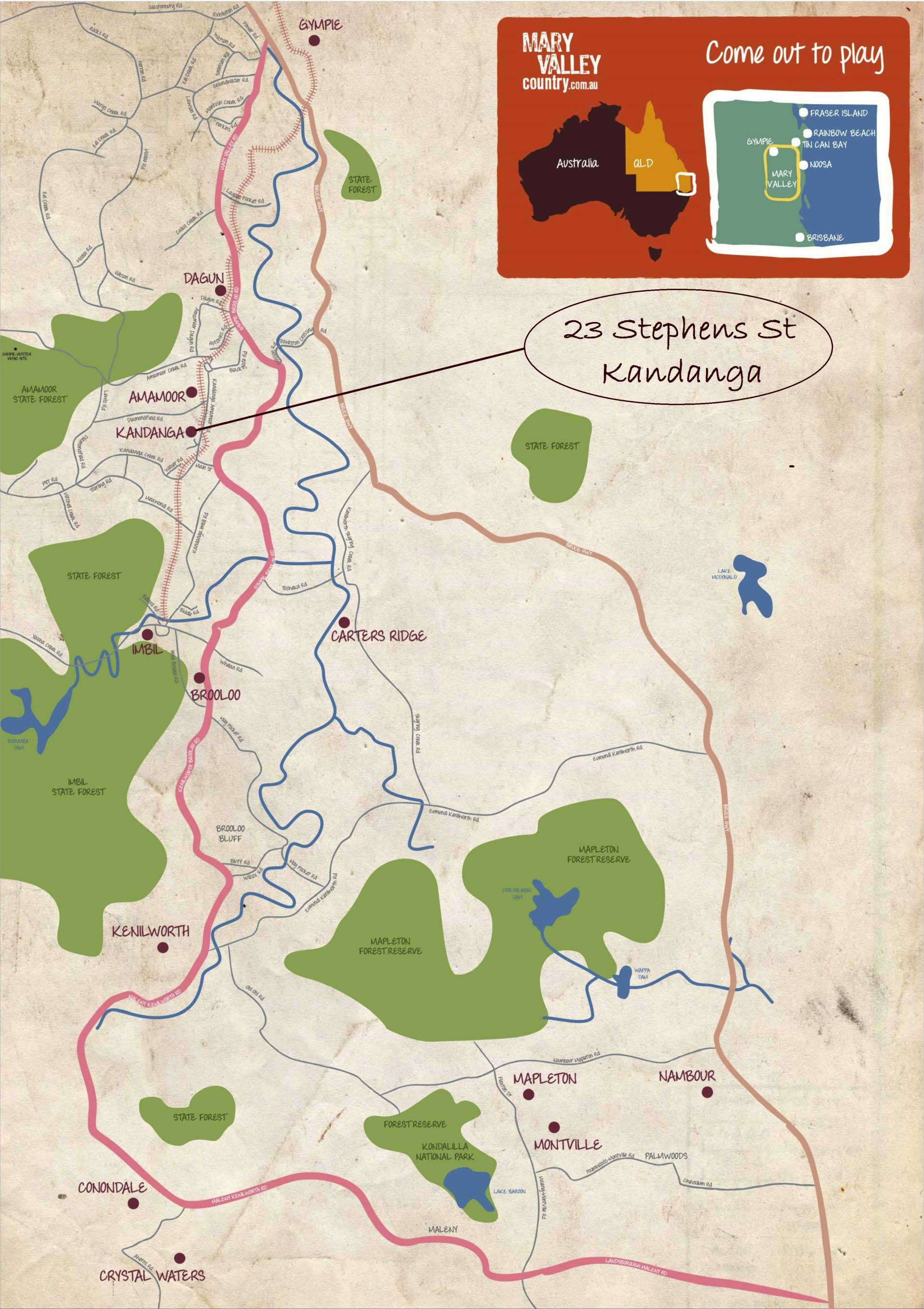 Kandanga is around 20 minutes from Gympie, 40 minutes from the coast at Noosa and under 10 minutes from the new freeway, on your way to anywhere.