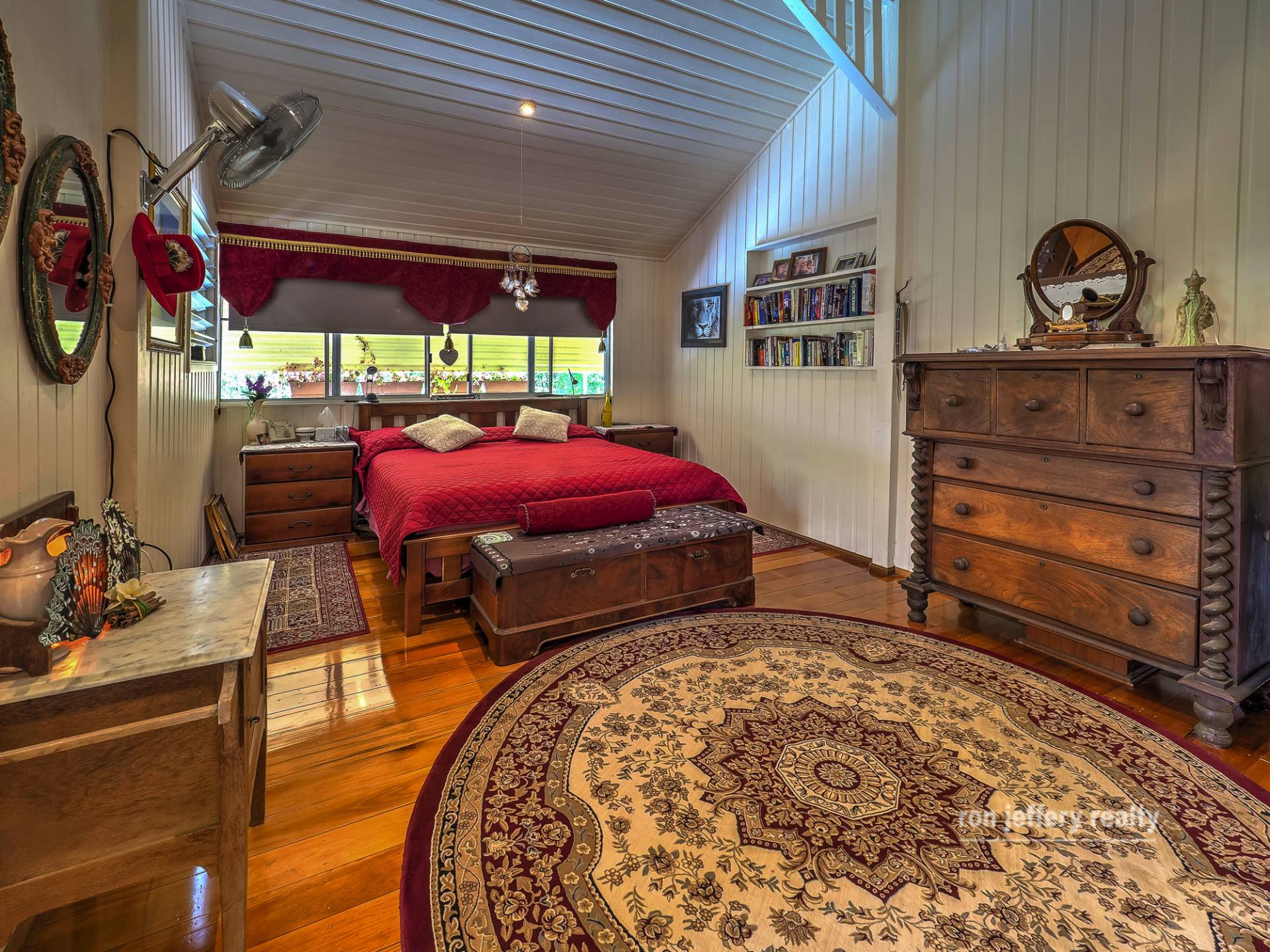 There are 4 bedrooms, a study and a sleep-out. However, one bedroom is currently set up as a media room and the sleep-out is being used as a craft room. The main bedroom is more than spacious and bedrooms 1 and 2 continue the Queenslander theme. The bathroom features some great timber work!