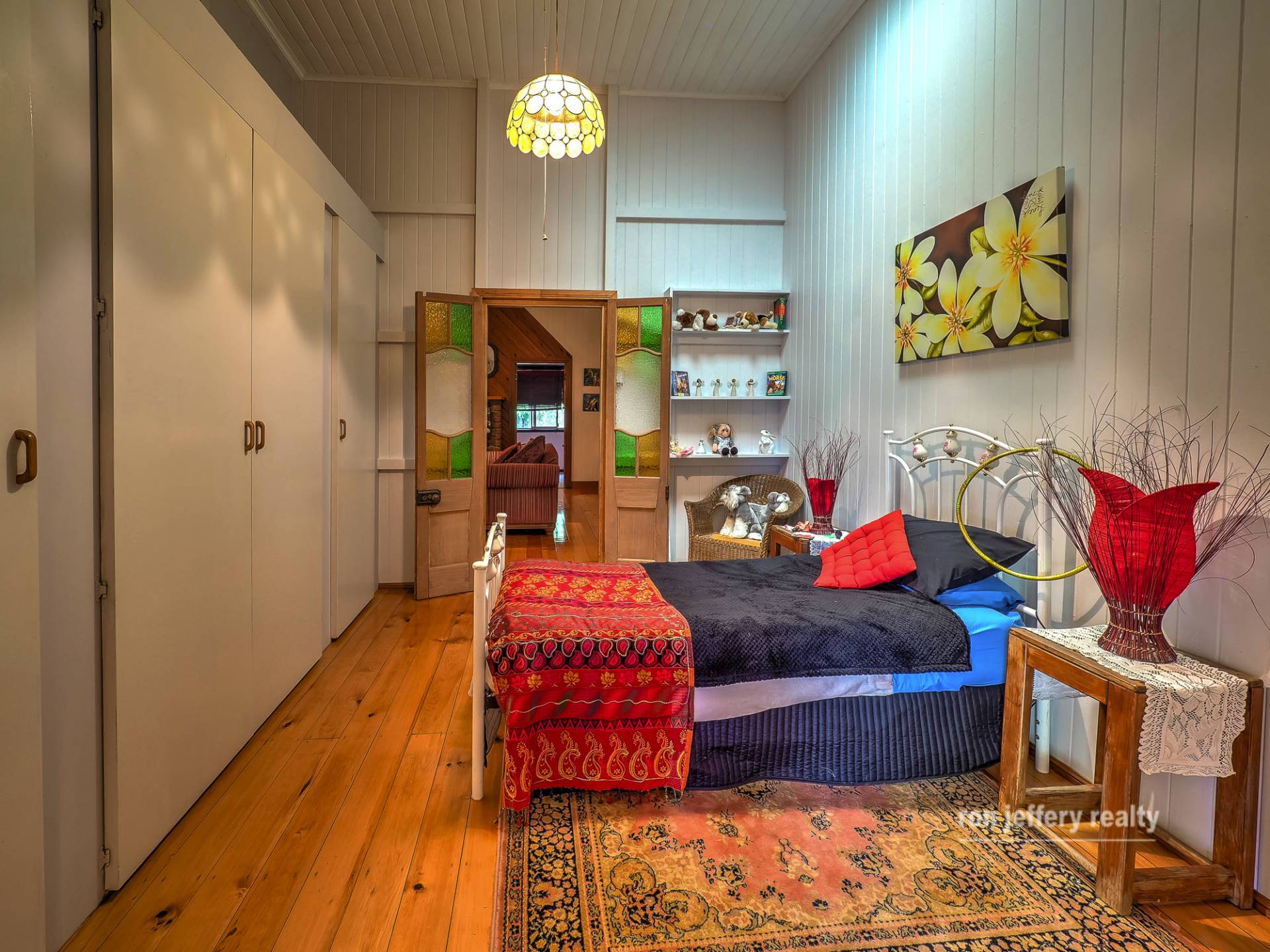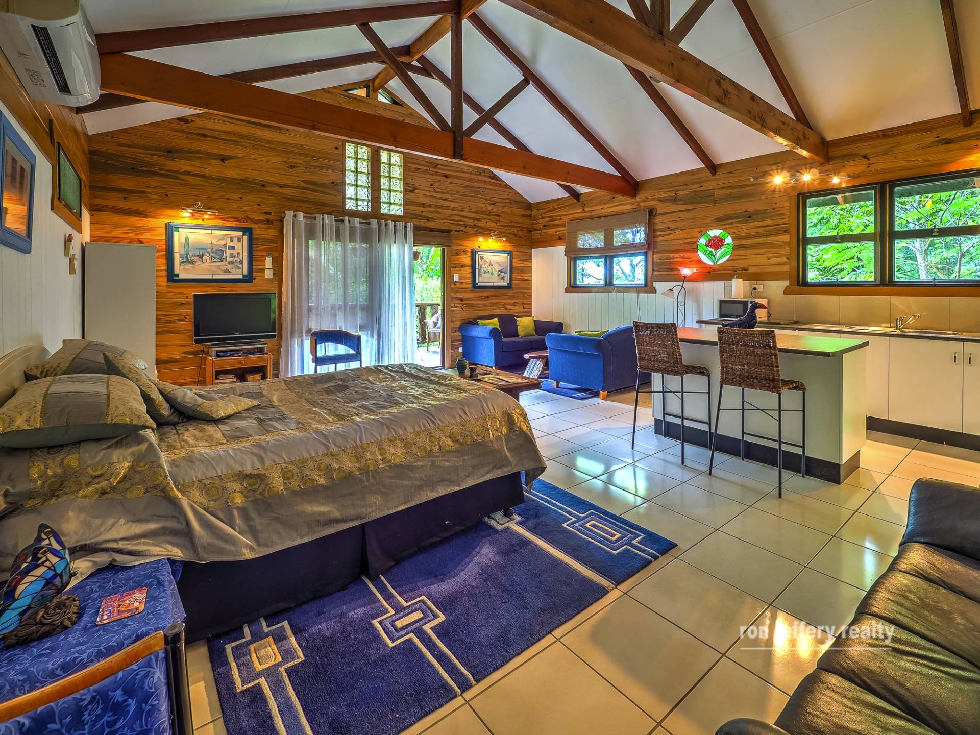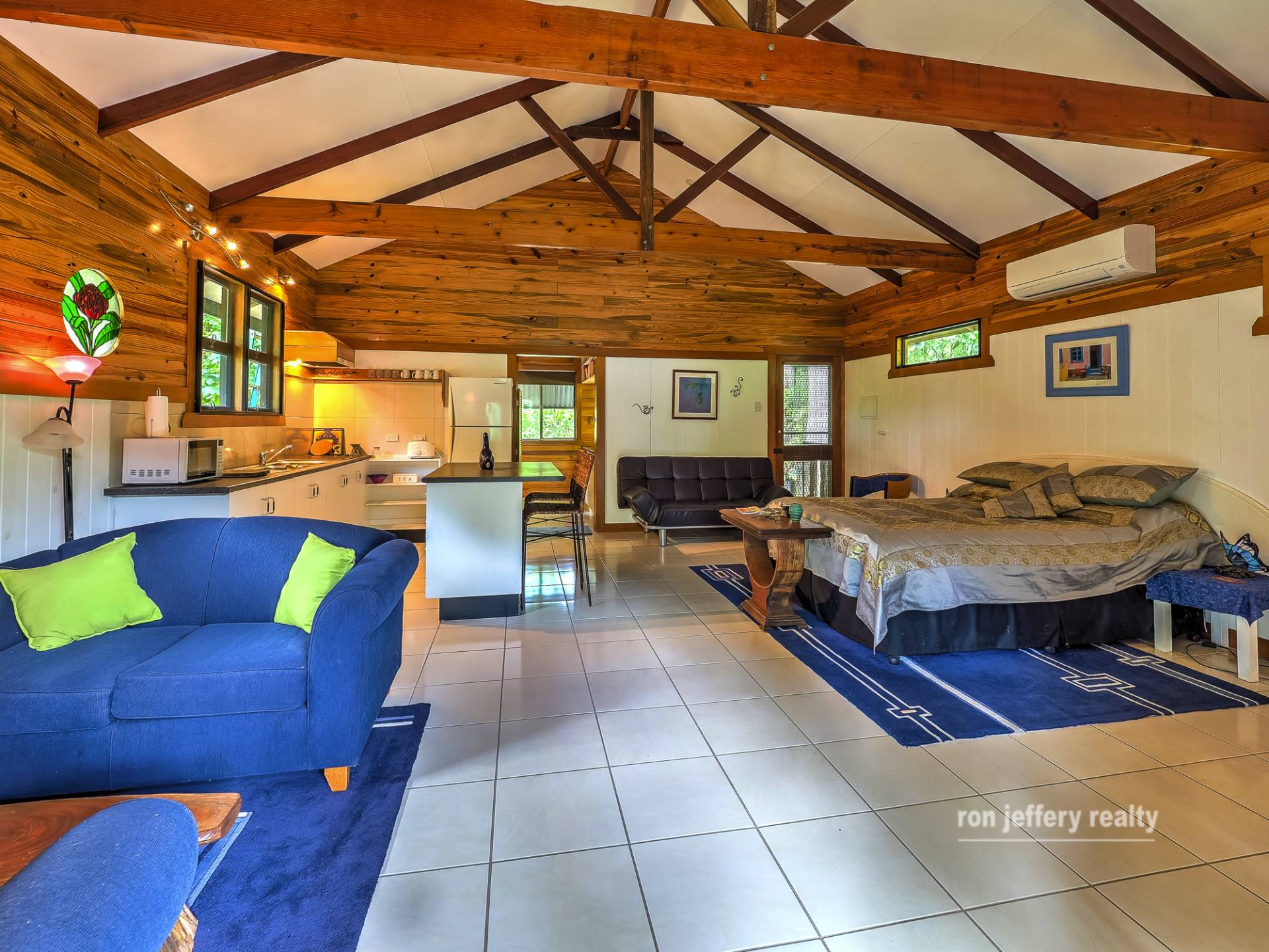The main house is a Queenslander, with a twist. The huge A-frame carport entry disguises the Queenslander shape. You enter a country kitchen with plenty of timber features. It’s a rustic kitchen that wraps around you. However, the living room is the true centre of the home and is straight out of the Queenslander rule book. High ceilings, polished timber floors, VJ walls & ceiling and period trims that give semi-separation to the lounge and dining areas. It’s cosy in the winter, and cool in the summer.