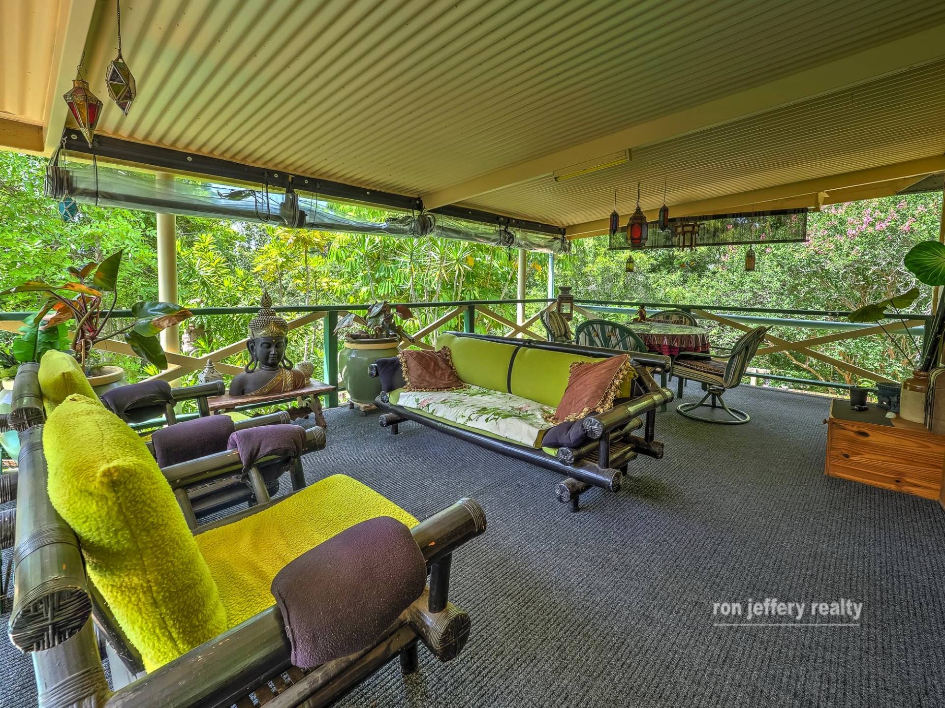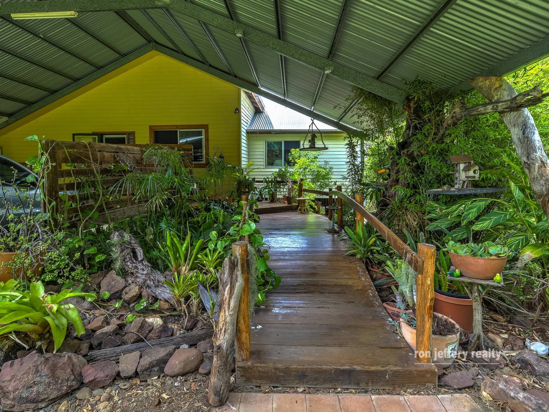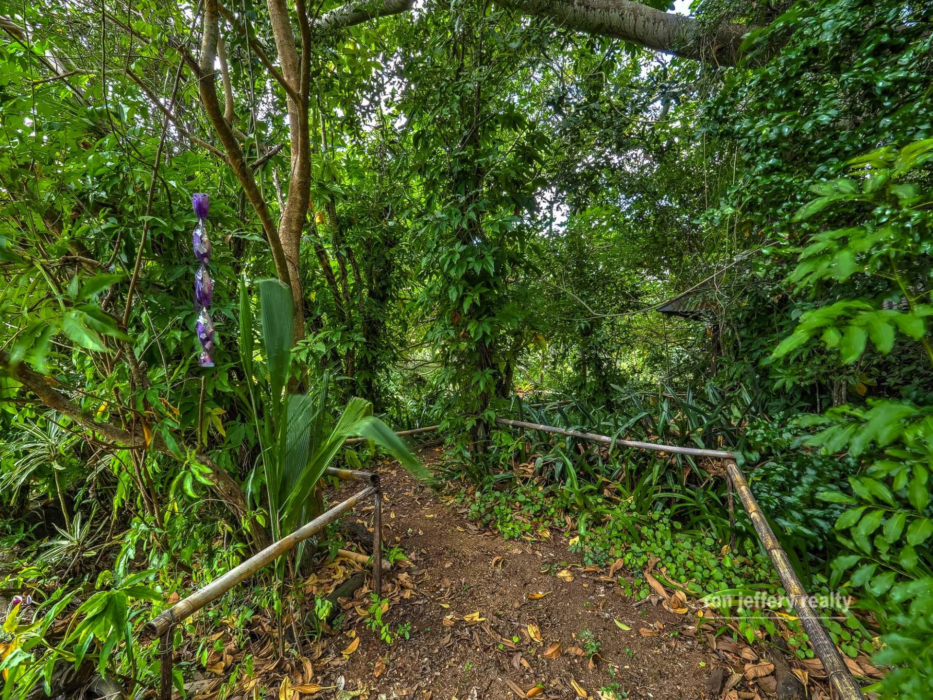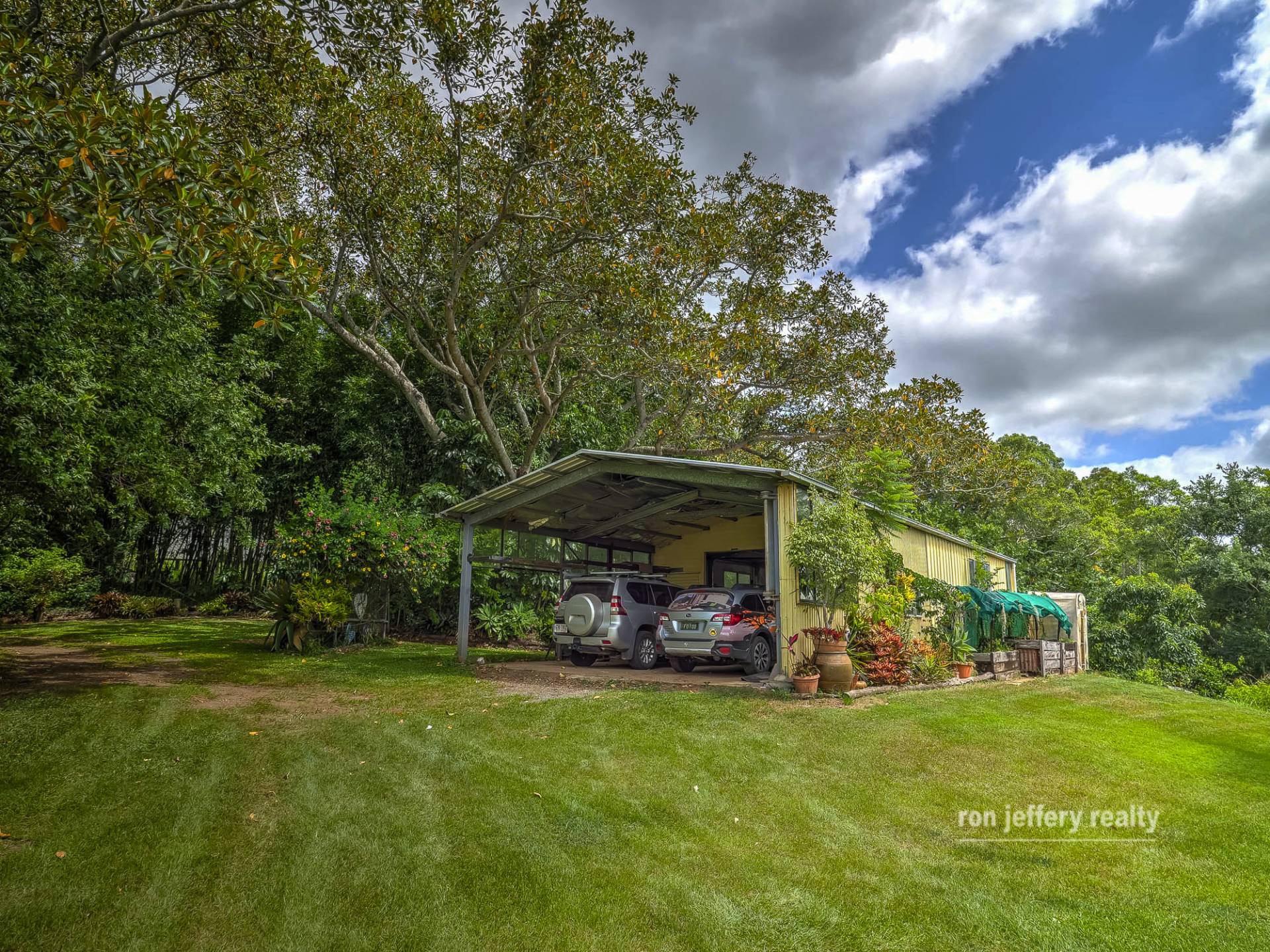 Outbuildings include a 3-bay enclosed double garage, the attached 2 bay double carport, plus the carport at the house. The trees and gardens are well established, with lots of pathways to discover and enjoy. The lawns are easy to maintain and you can either allow the gardens look after themselves or continue to put your stamp on it and extend.