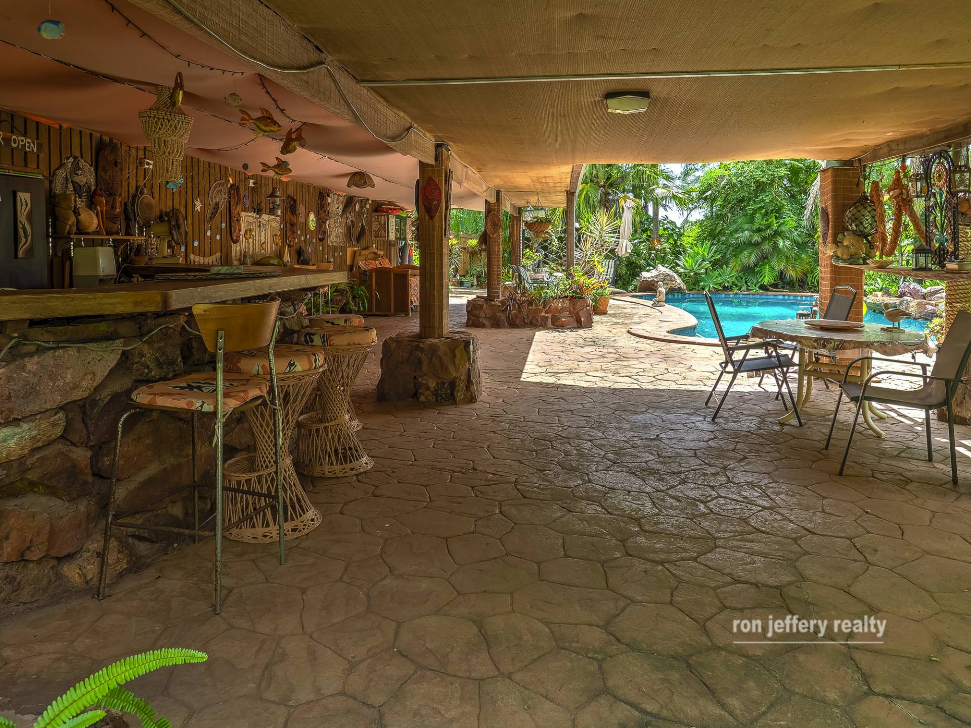 The covered rear veranda extends the living space, duplicating the lounge and dining areas, but out in the fresh air. Pull down blinds control the weather and the outlook over the pool is fantastic! The fully tiled swimming pool is the central point for a great entertaining area, complete with a bar and plenty of shade.