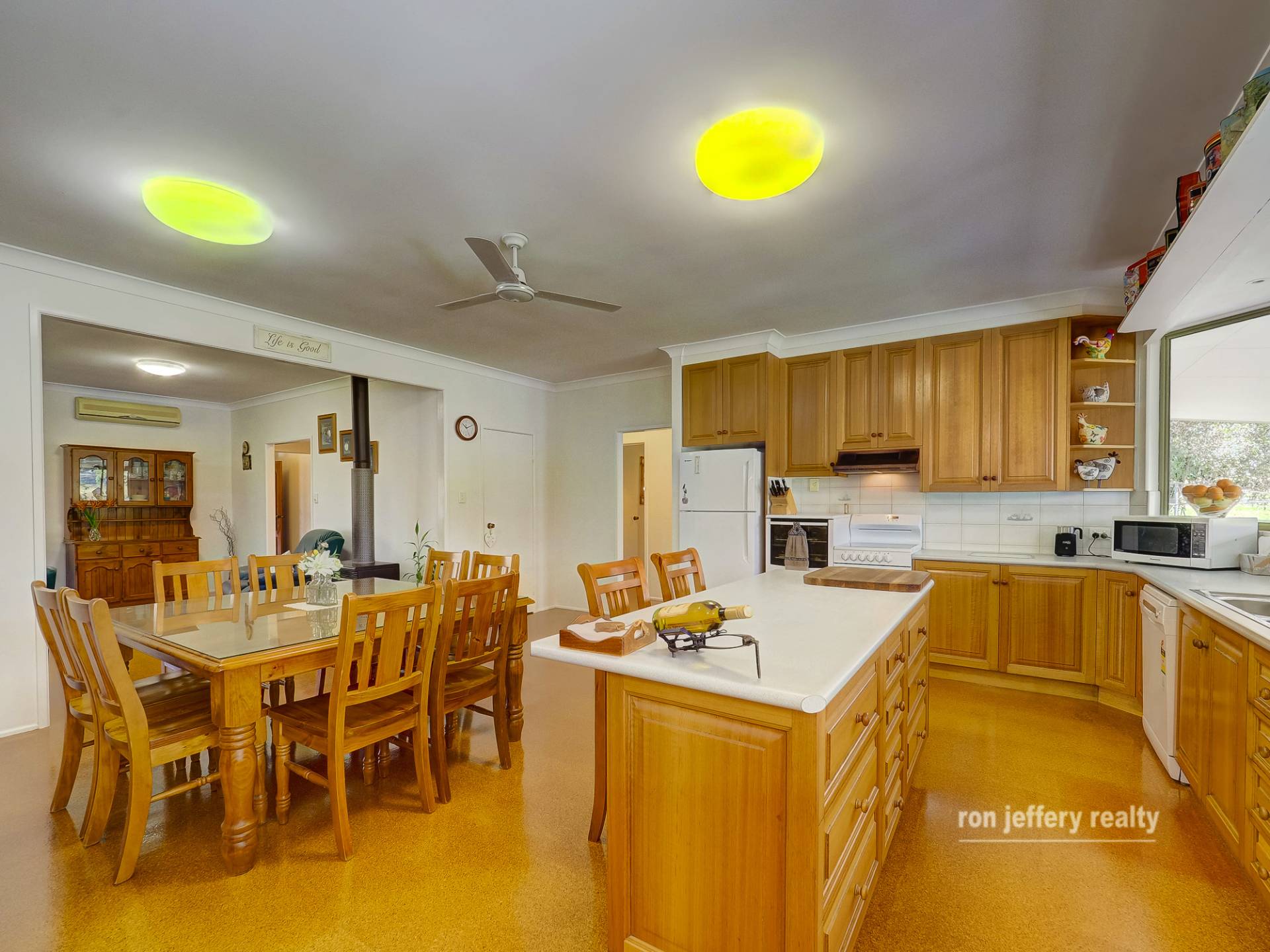 THE HOME: Internally, the entry hall gives access to every room in a home that features cork tiled floors throughout. The lounge has air conditioning, slow combustion heating, sliding door access to the side veranda and is semi-separated from the kitchen/family room. Now this is a country kitchen – eat-in style! The timber kitchen has plenty of bench space, an island bench with a breakfast bar, and a walk-in pantry. It overlooks the rear entertaining area and the lake sized dam. There are 4 bedrooms and two bathrooms.