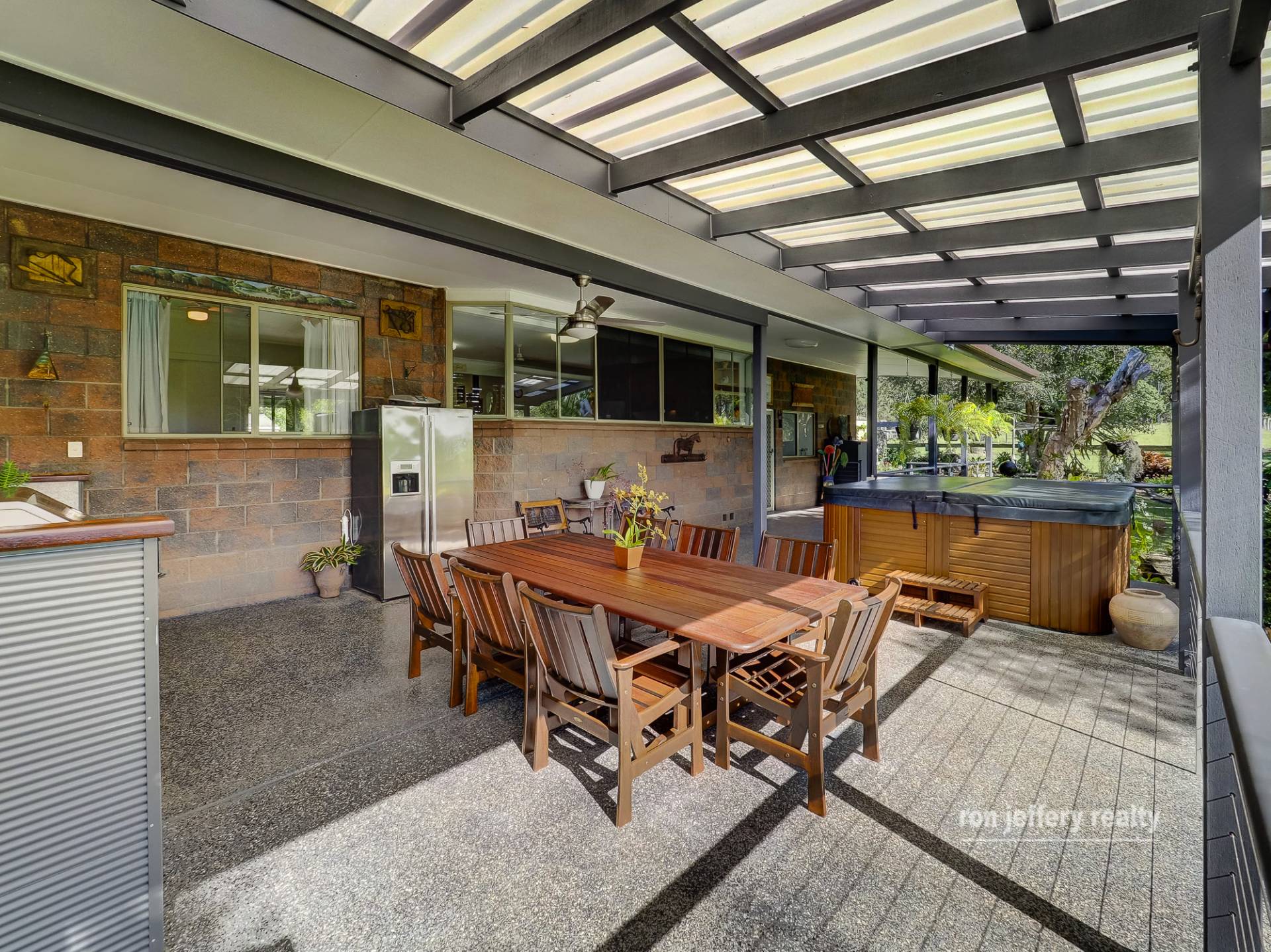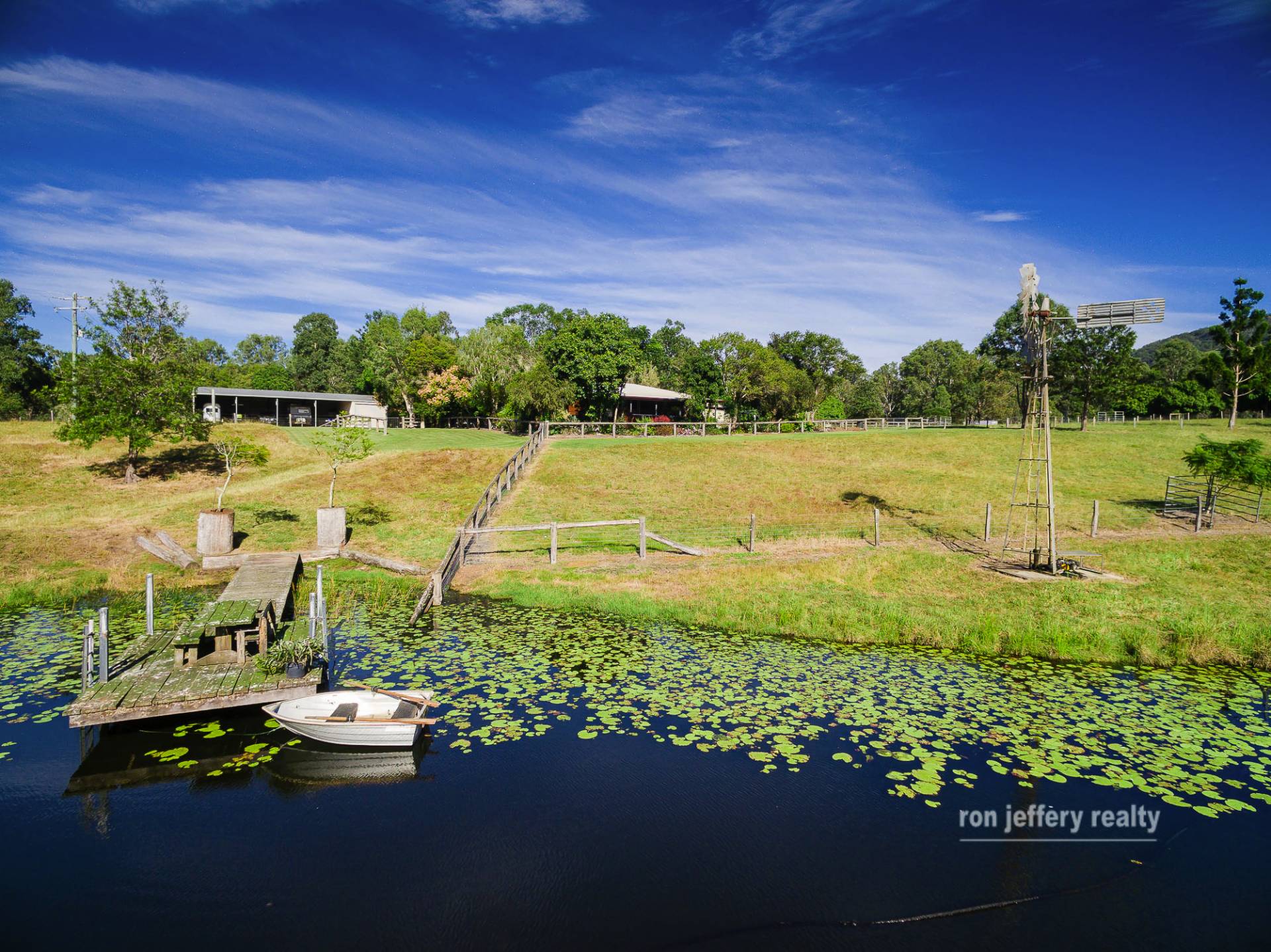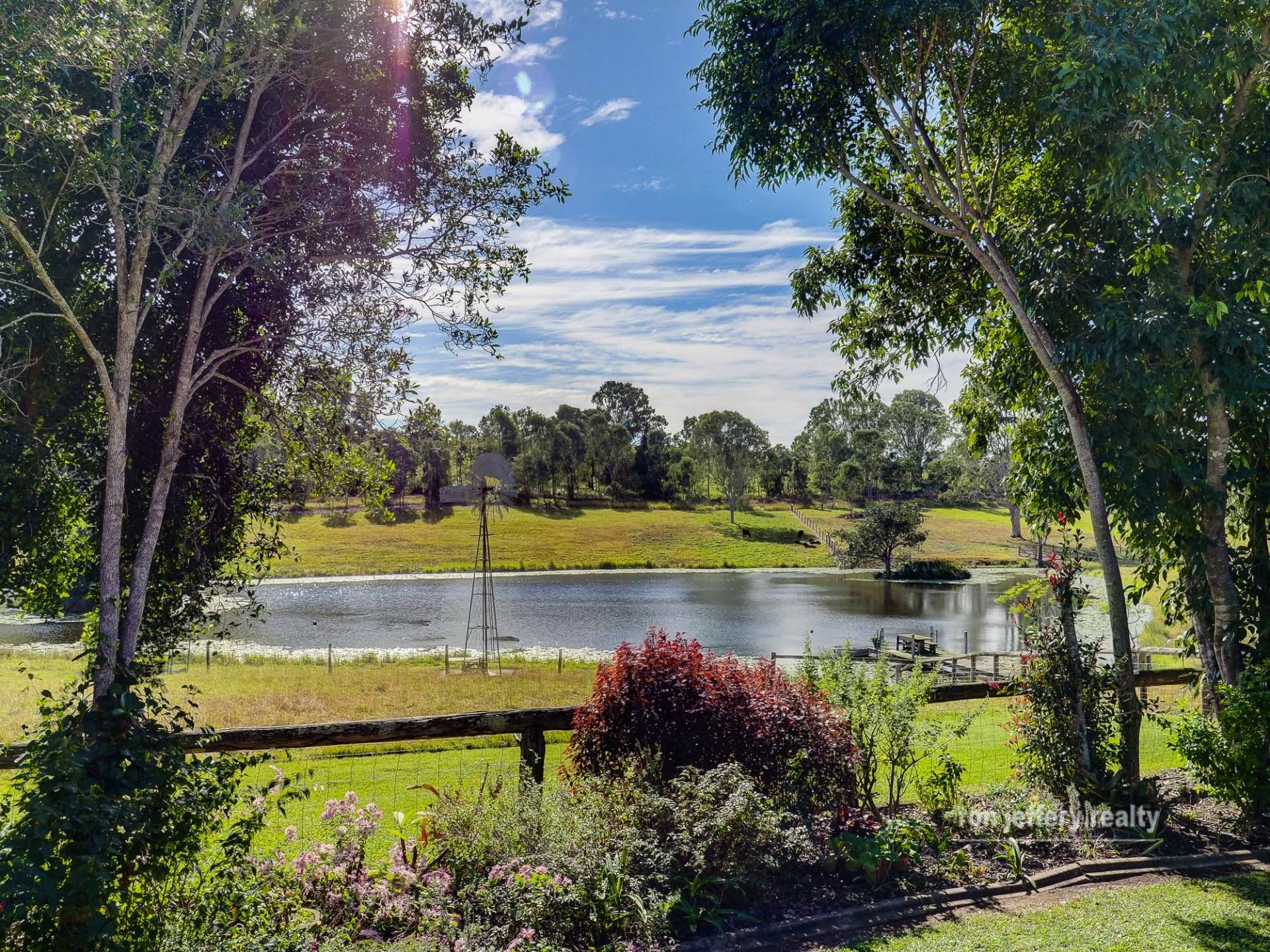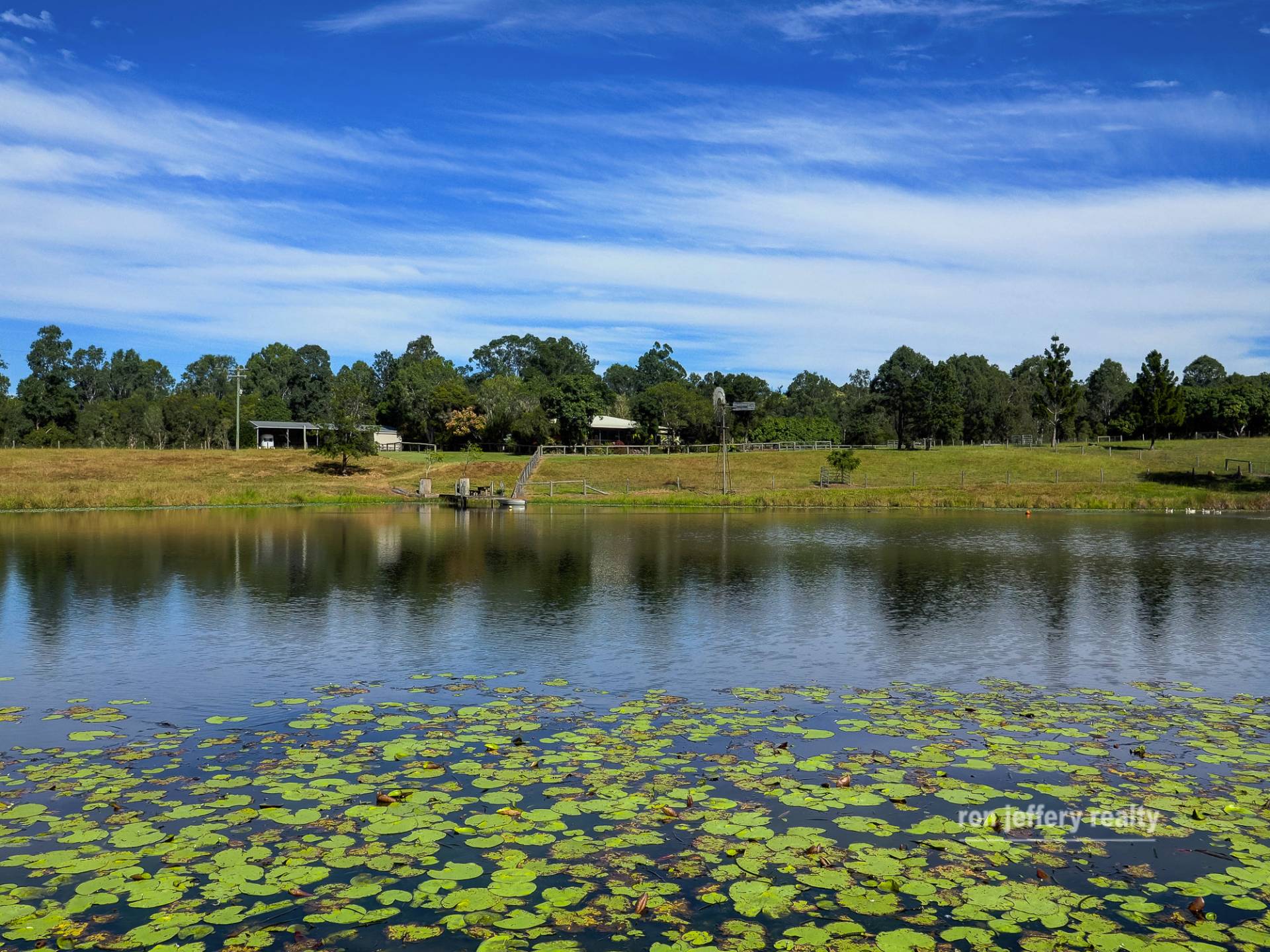 Externally, you are drawn to the rear covered, north-facing entertaining area. A long list of features here includes, a complete outdoor kitchen, a spa tub and the amazing view over your own lake sized dam, complete with a jetty and windmill. This area can really take a crowd!