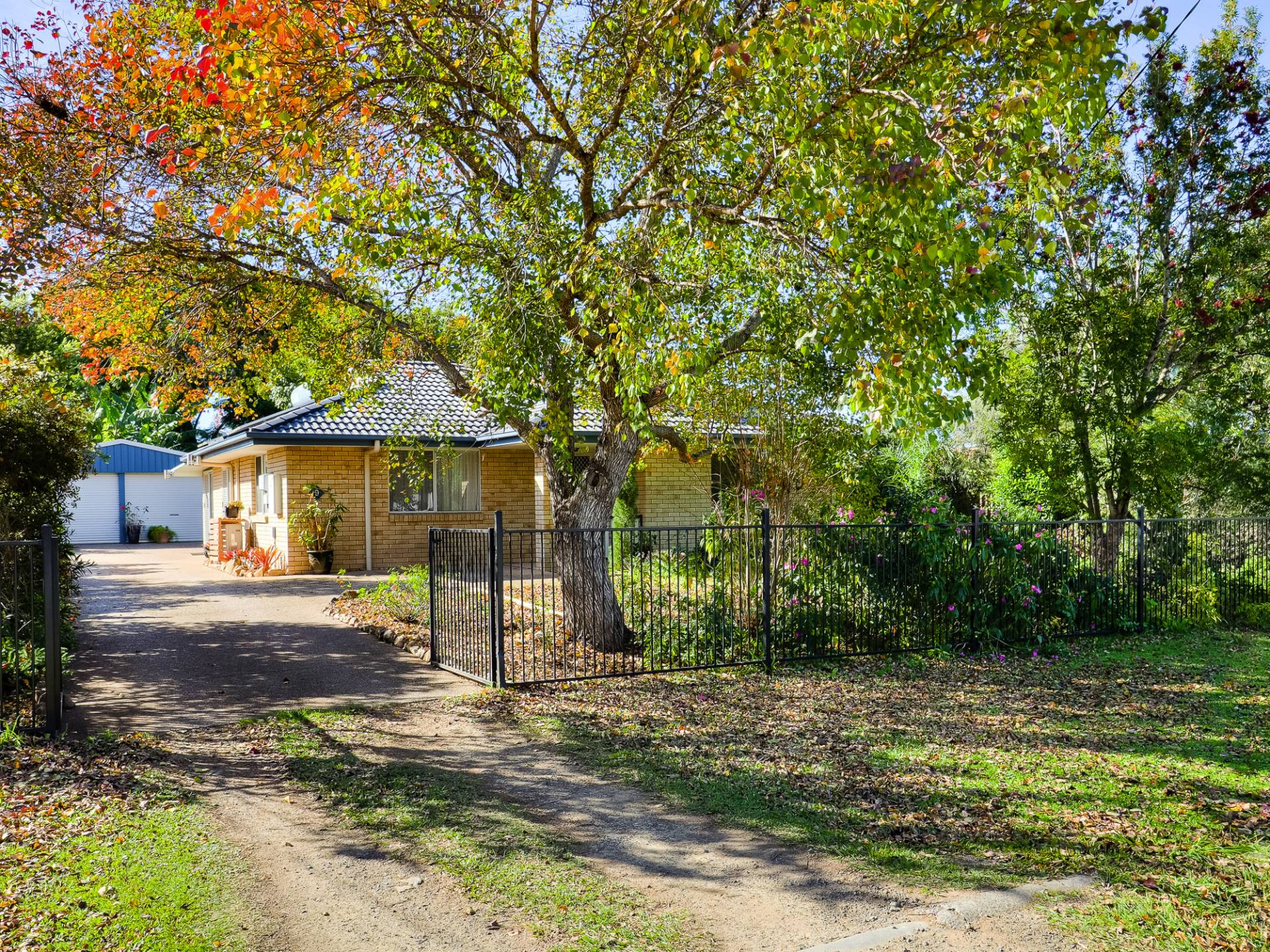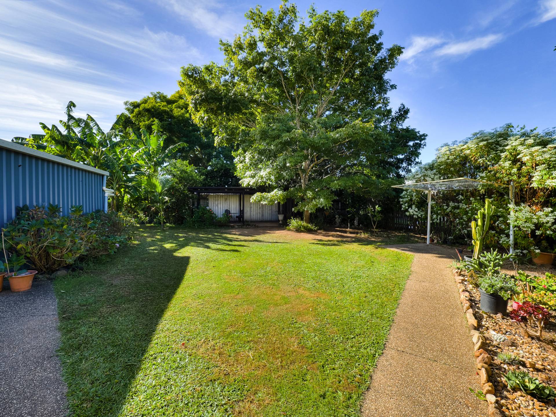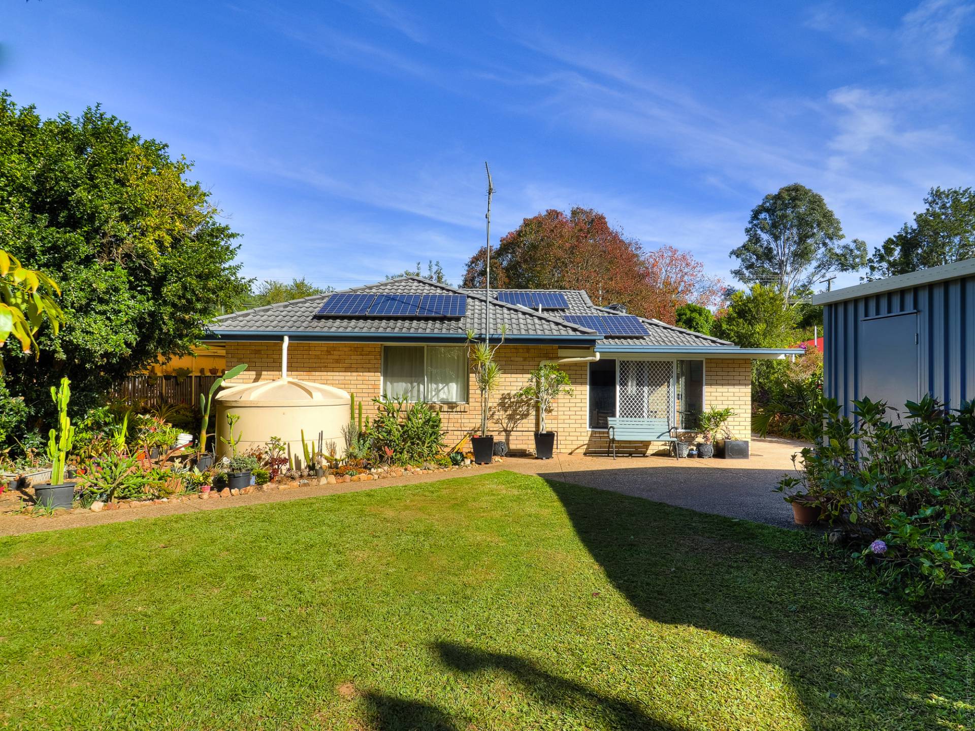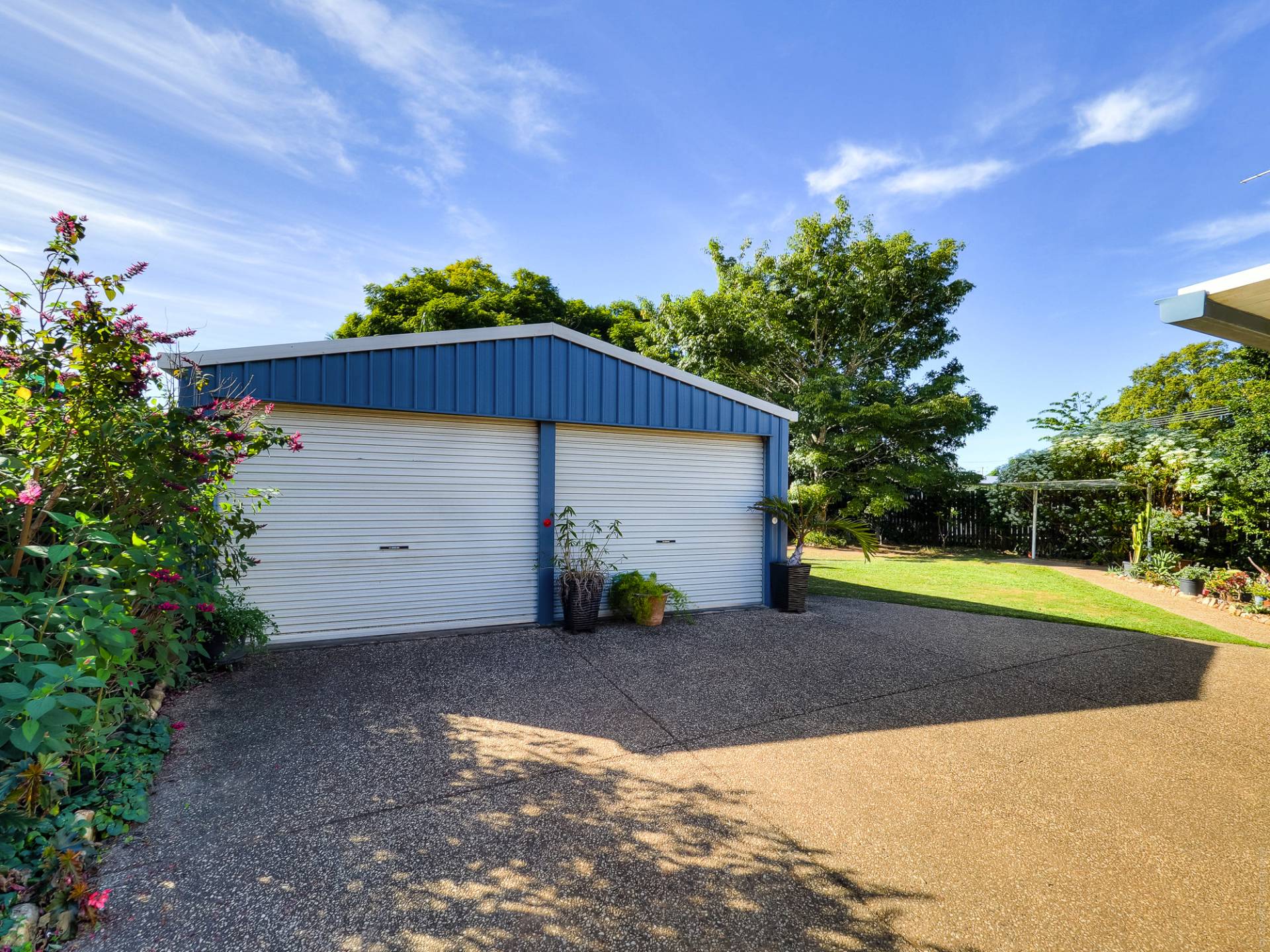 The block is fully fenced and fully established. From the street, a concrete driveway leads past the house to a Colorbond double garage. The yard is well laid out, with concrete pathways through well-maintained lawns. There are veggie gardens, fruit trees, a chook yard and a fernery. A garden shed at the back of the yard complements the double garage storage.
