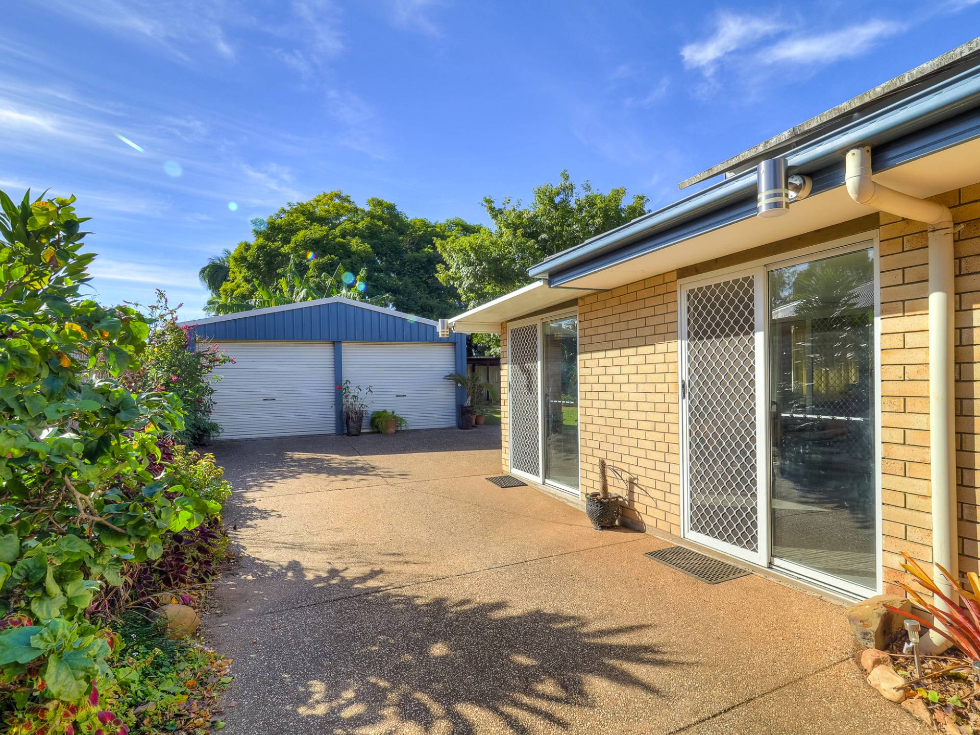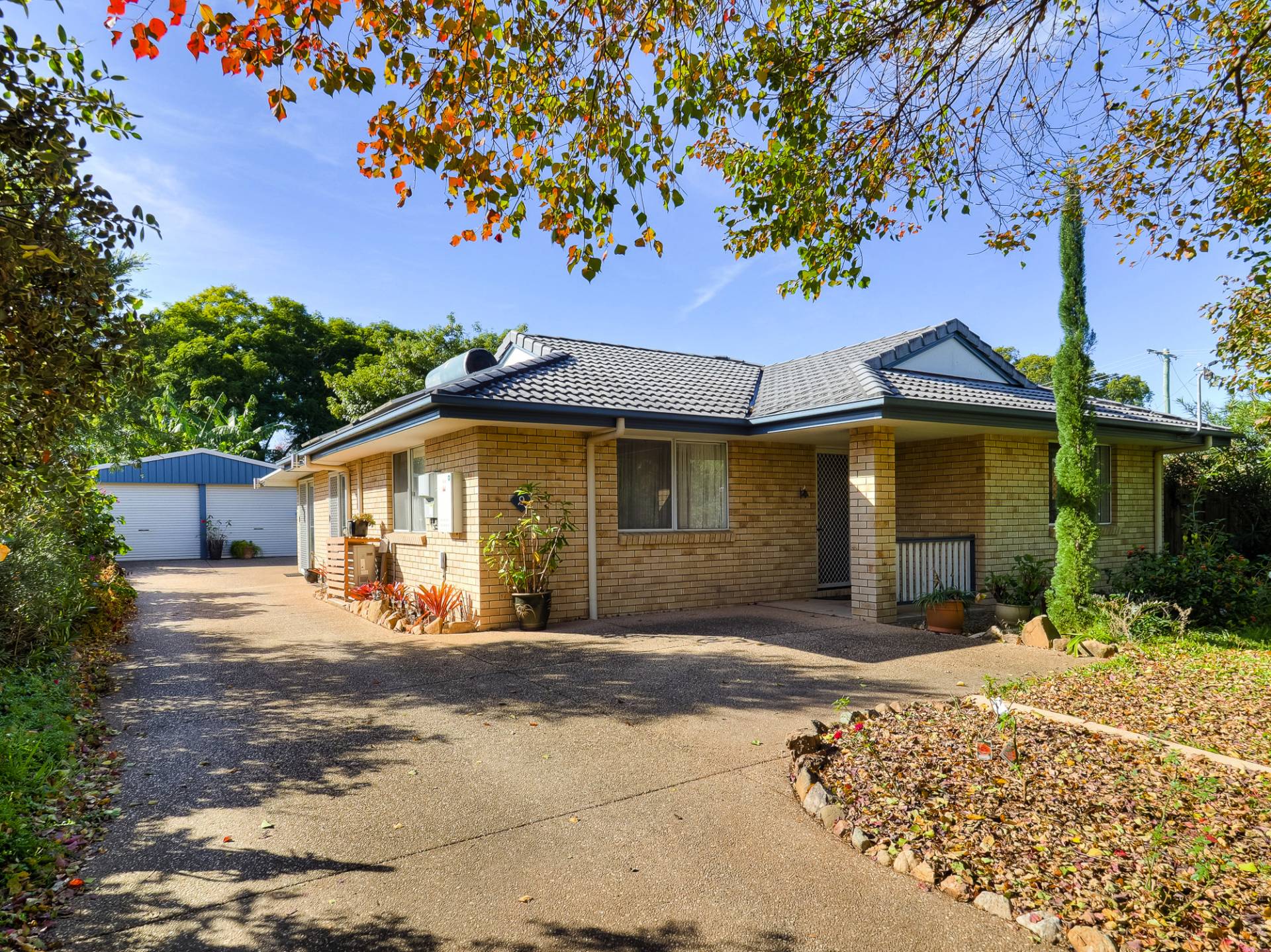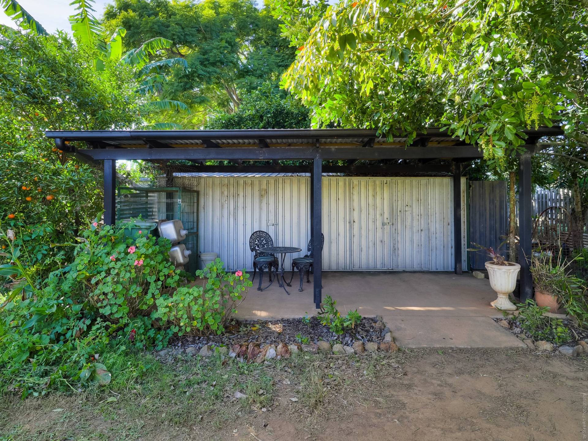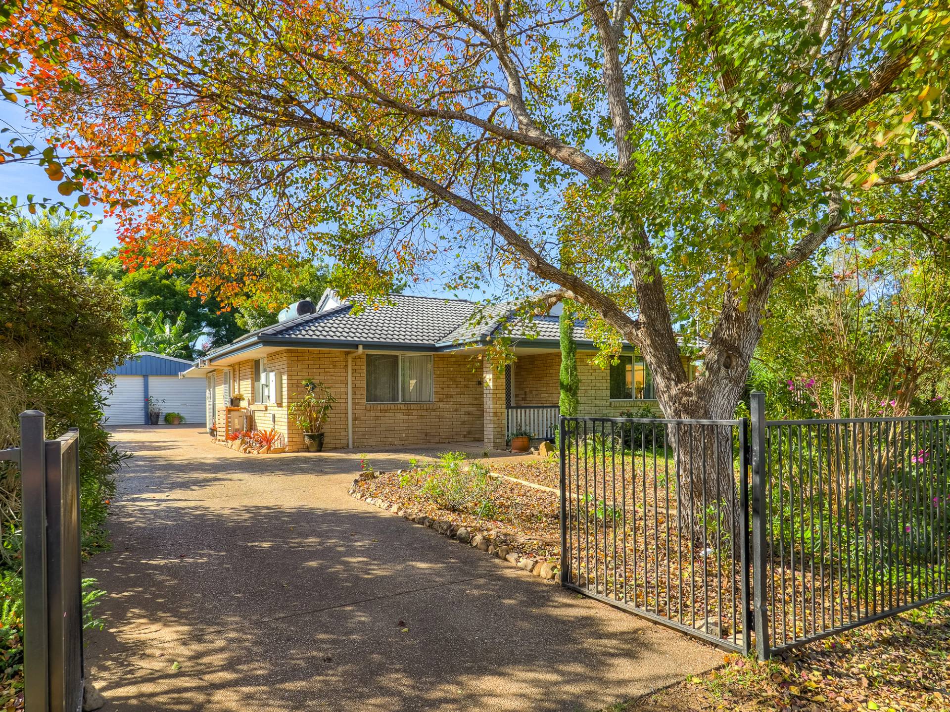 The block is fully fenced and fully established. From the street, a concrete driveway leads past the house to a Colorbond double garage. The yard is well laid out, with concrete pathways through well-maintained lawns. There are veggie gardens, fruit trees, a chook yard and a fernery. A garden shed at the back of the yard complements the double garage storage.