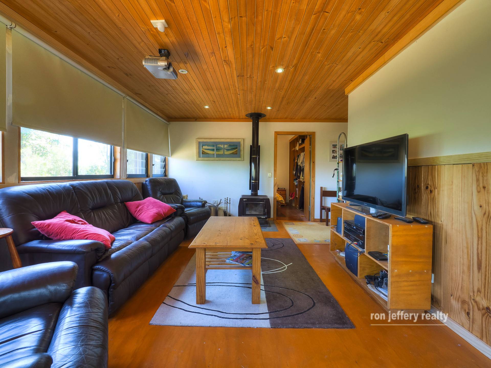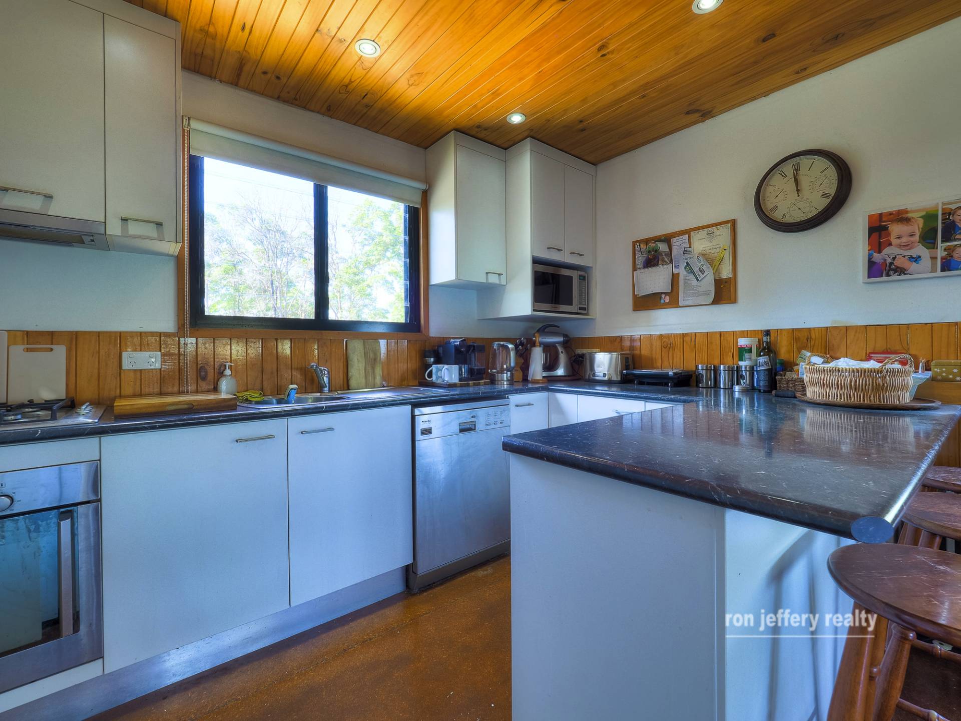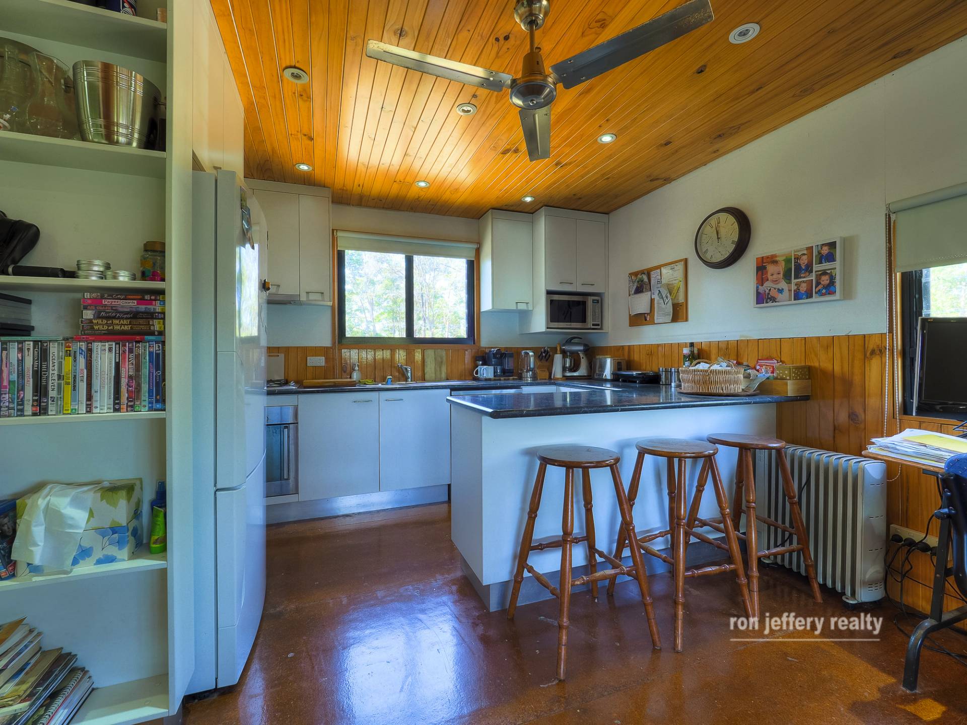The cute weekender is spacious with semi open plan living areas that feature timber lined ceilings and plenty of glass to bring in the light and offer the view. The lounge room has a slow combustion heater while the kitchen has a gas cooktop, dishwasher and a breakfast bar. There are two bedrooms, both with built-in shelving, and one bathroom.