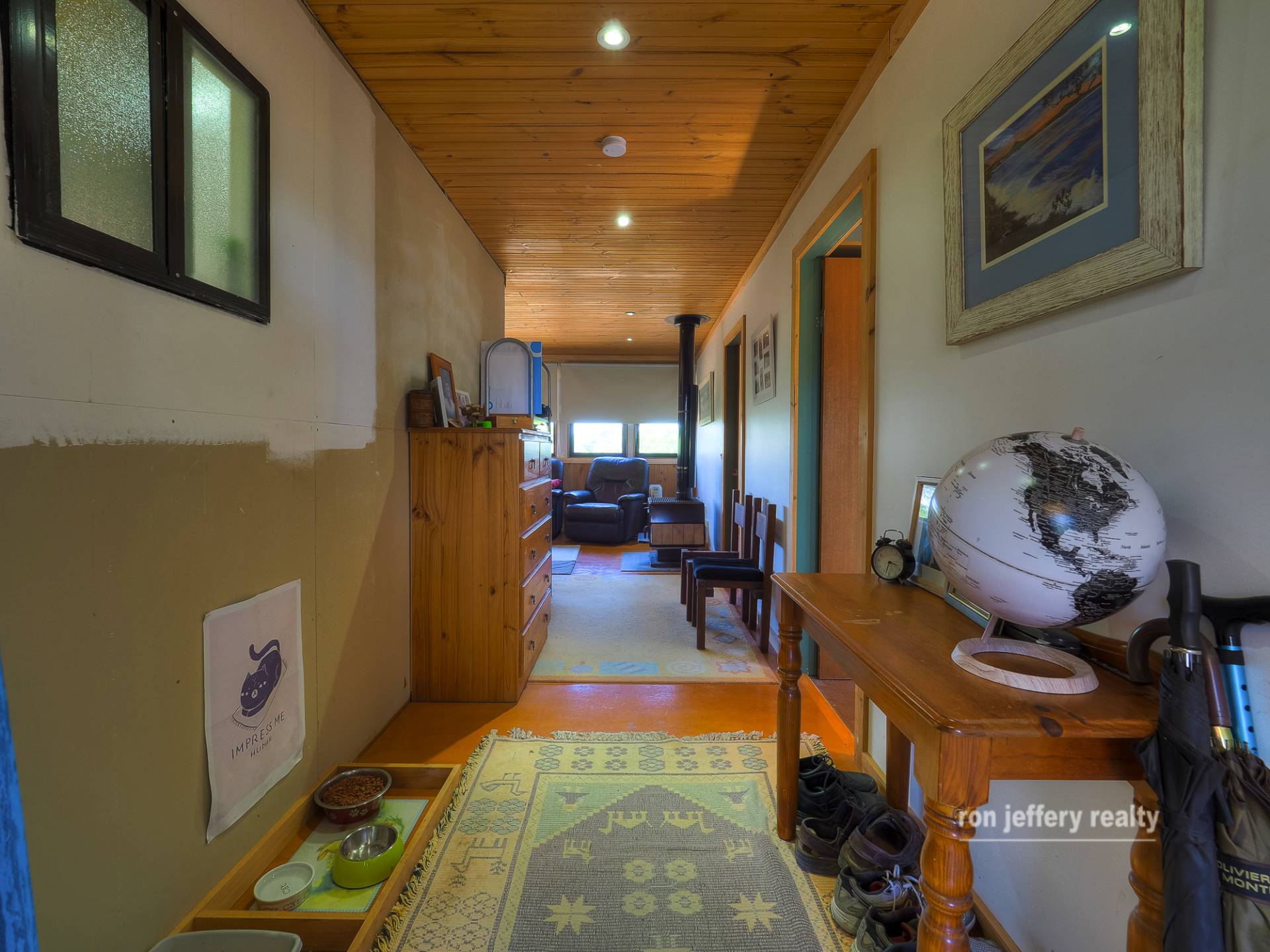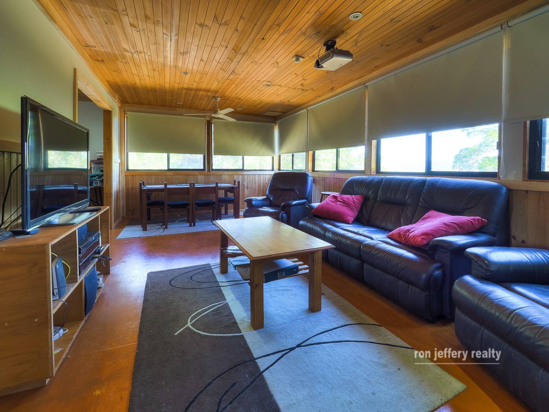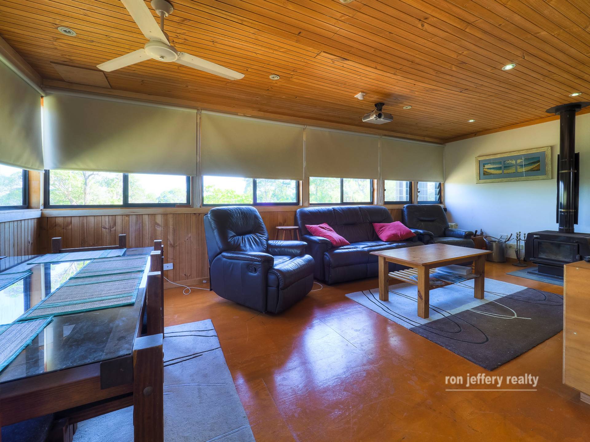The cute weekender is spacious with semi open plan living areas that feature timber lined ceilings and plenty of glass to bring in the light and offer the view. The lounge room has a slow combustion heater while the kitchen has a gas cooktop, dishwasher and a breakfast bar. There are two bedrooms, both with built-in shelving, and one bathroom.