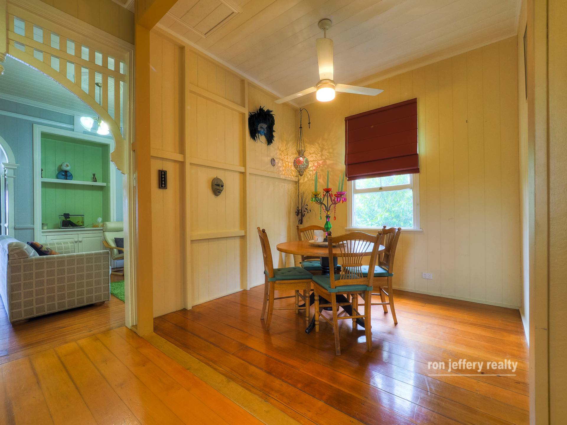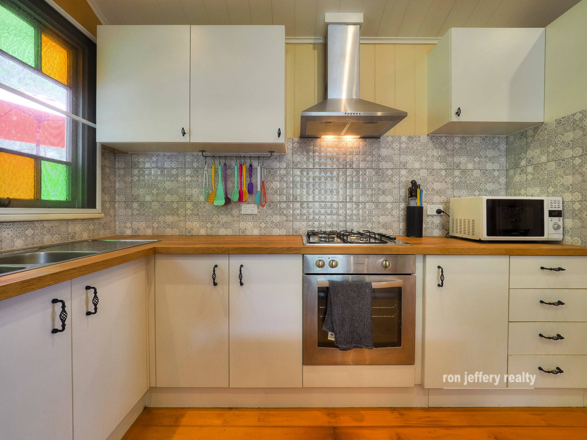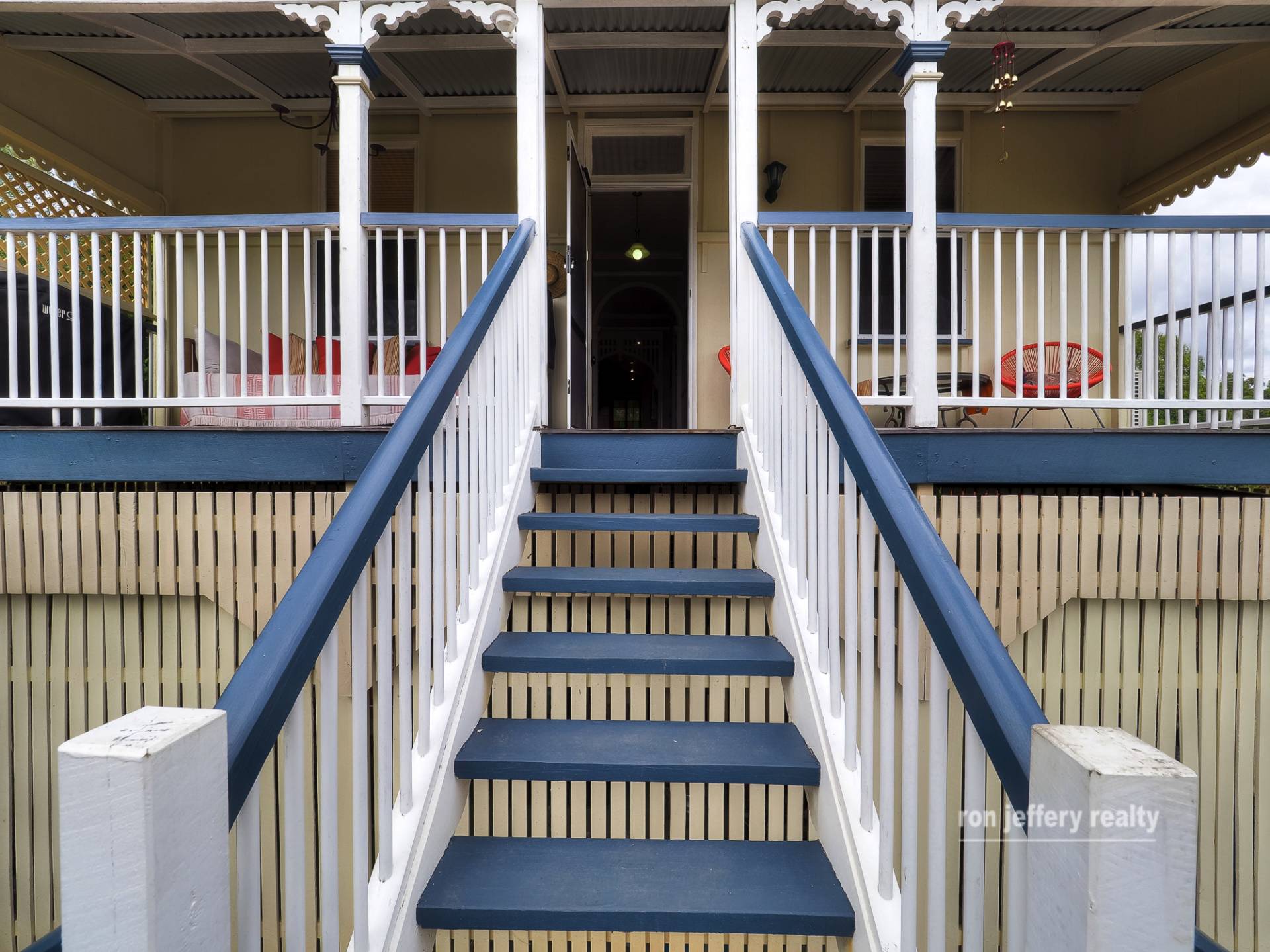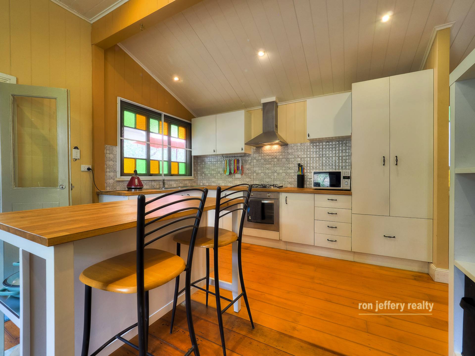 The butterfly front stairs lead to a veranda with a great northerly view. Entry to the house is via a central hallway leading to an air-conditioned sitting room. The house displays the classic Queenslander features of polished timber floors, high ceilings, VJ walls and ceilings, double-hung windows, coloured glass and period trim. Apart from the lounge/sitting room, there is a separate dining room, that could be converted back to a fourth bedroom, and a generous sized kitchen. The updated kitchen has timber benchtops, gas cooking, plenty of storage and a free-standing island bench. There are 3 bedrooms, all with built-in robes, 2 air conditioned. The bathroom is almost brand new.