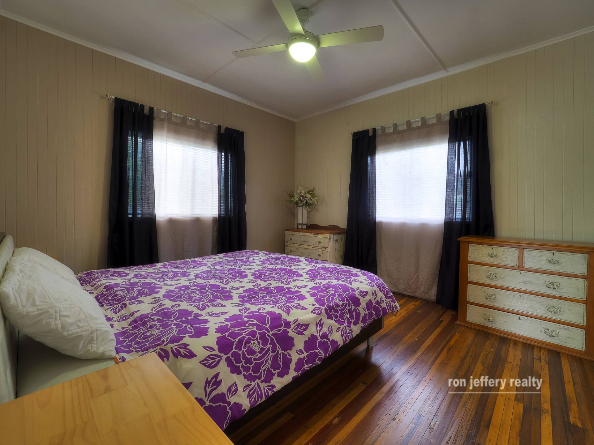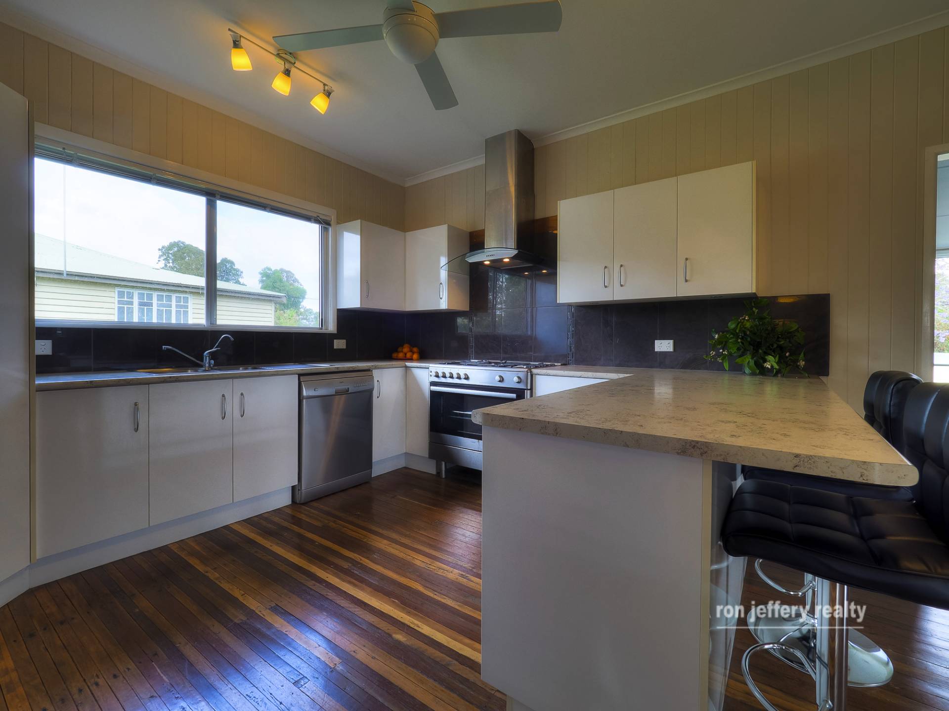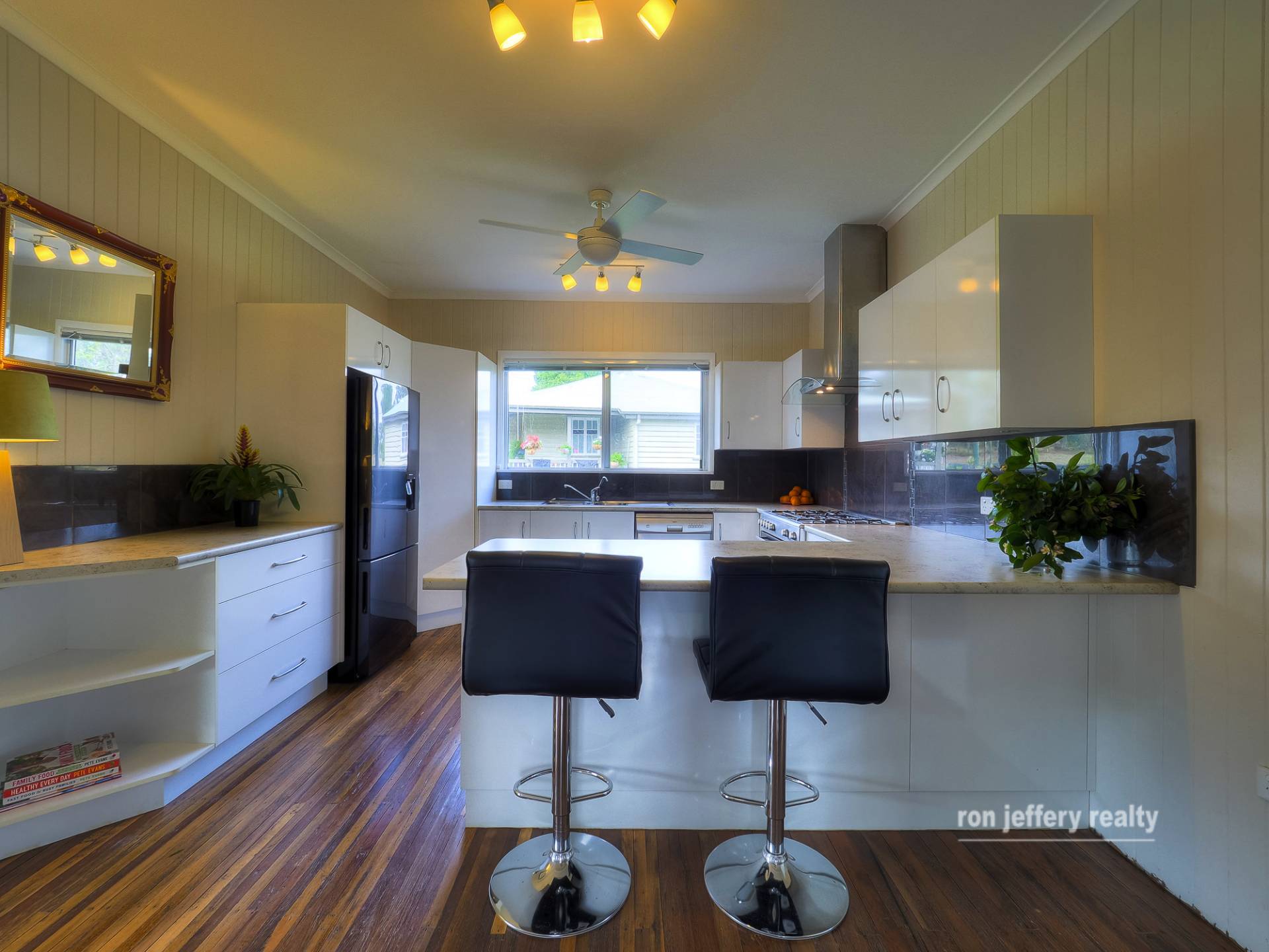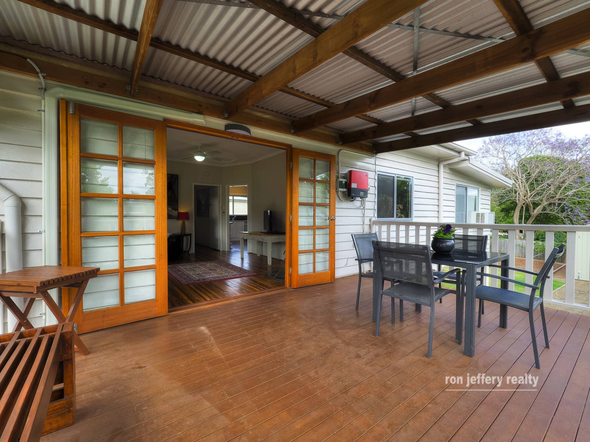 The front stairs deliver you to a living room that combines the original loungeroom and the enclosed veranda. The room has both air conditioning and slow combustion heating, the usual Queenslander features like polished timber floors and VJ walls, and has double door access to the covered side deck.