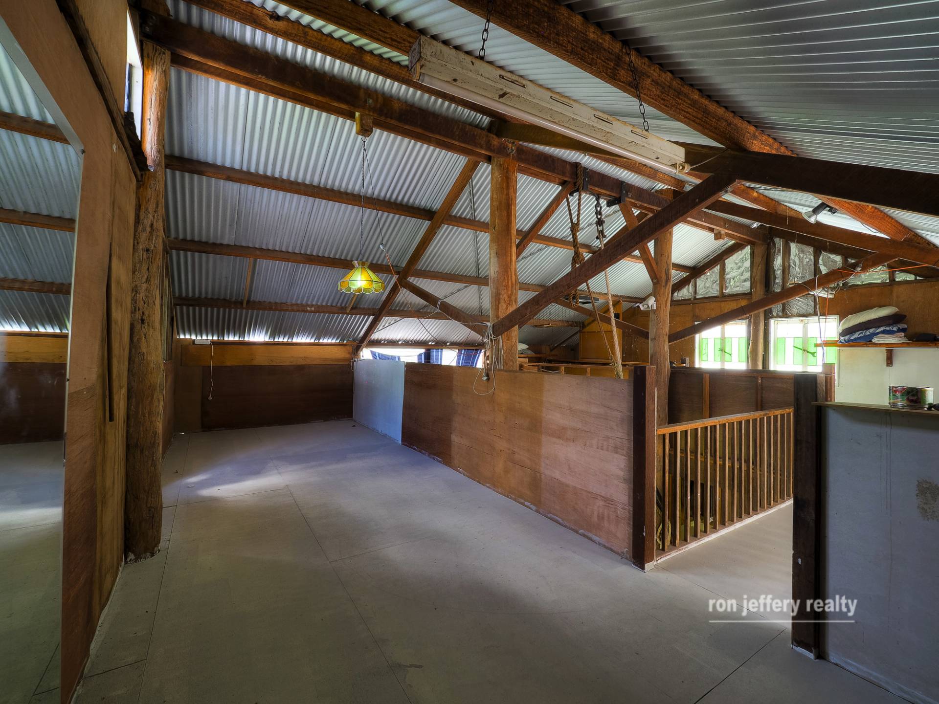 There is quirky and then there is beyond quirky … this house is the second one! The house seems to have evolved, and it still is. Inside, the main room has a double storey cathedral ceiling, supported by huge timber poles. There are antique French doors, a large feature open fireplace and a tiled floor. The ceiling is unlined corrugated iron. This room is overlooked by a mezzanine bedroom floor! While the kitchen is mainly setup on the veranda, the slow combustion stove is still inside, off the main room. It’s a cottage, garage, workshop and veranda combo! And, there’s plenty of room for all of those things. Stone retainer walls around the house just add to the setting.