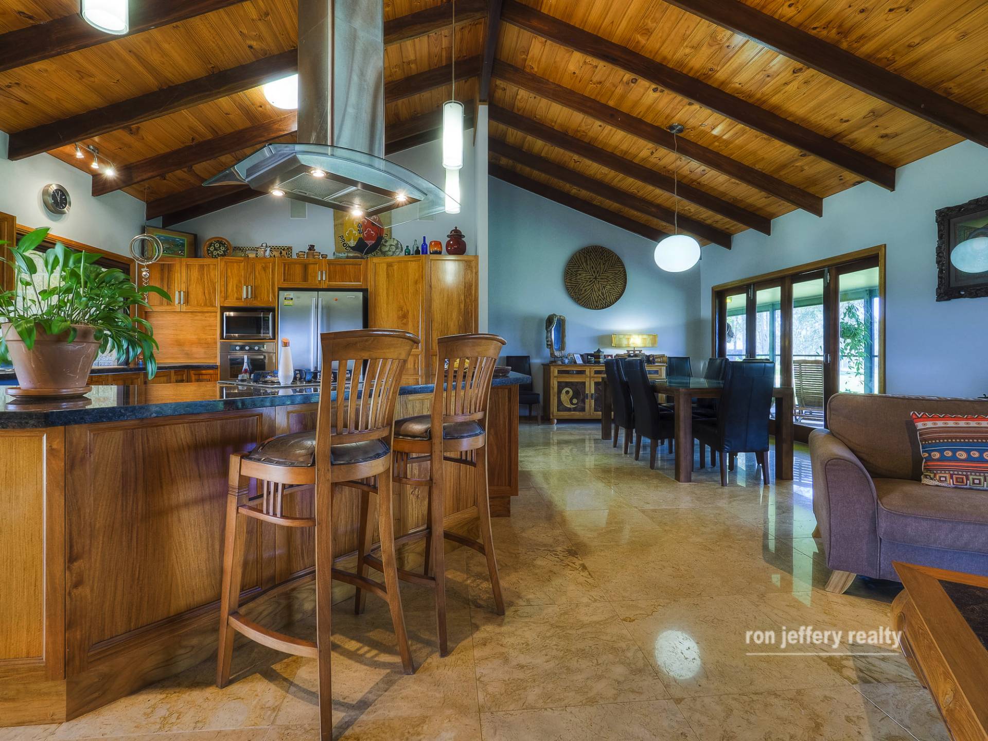 But don’t forget about the homestead – private luxury in established grounds. The extended homestead has multiple living spaces, and we enter the first one, the original loungeroom. It’s now the guest lounge, but it could be the kid’s lounge or the formal lounge. It is air conditioned and has direct access to a screen-enclosed veranda. A hallway connects this living space to the main hub, an open plan room that takes in the kitchen and family room. This casual room has timber-lined cathedral ceilings, marble tiled floors and bi-fold door access to screen-enclosed verandas, on both sides.