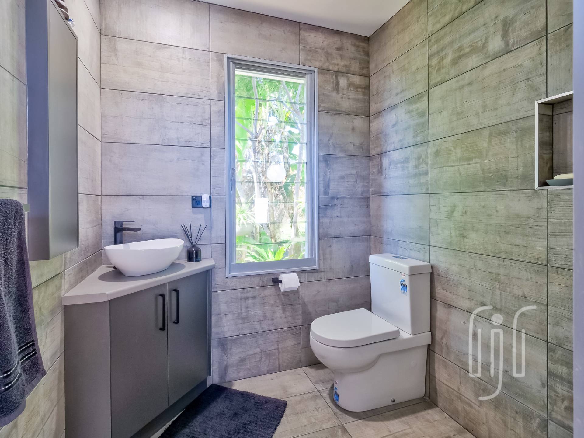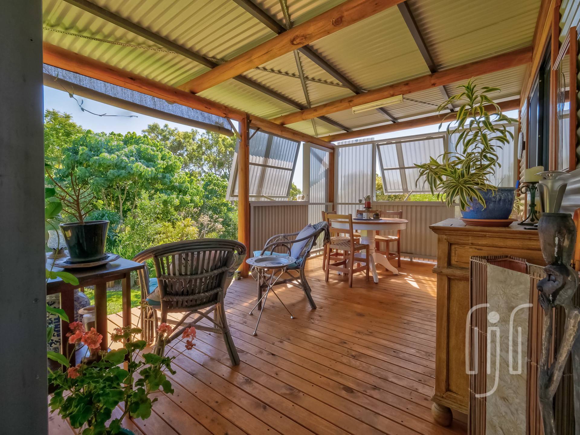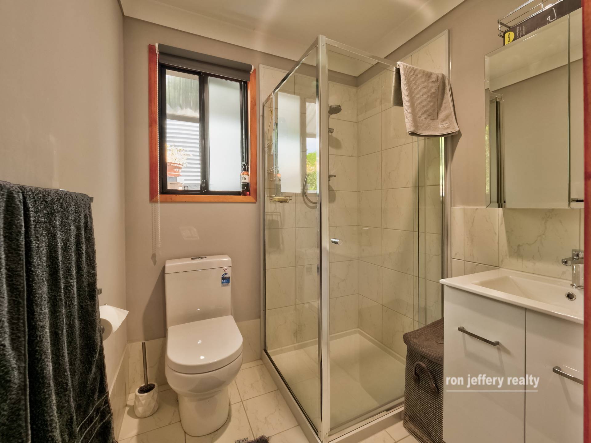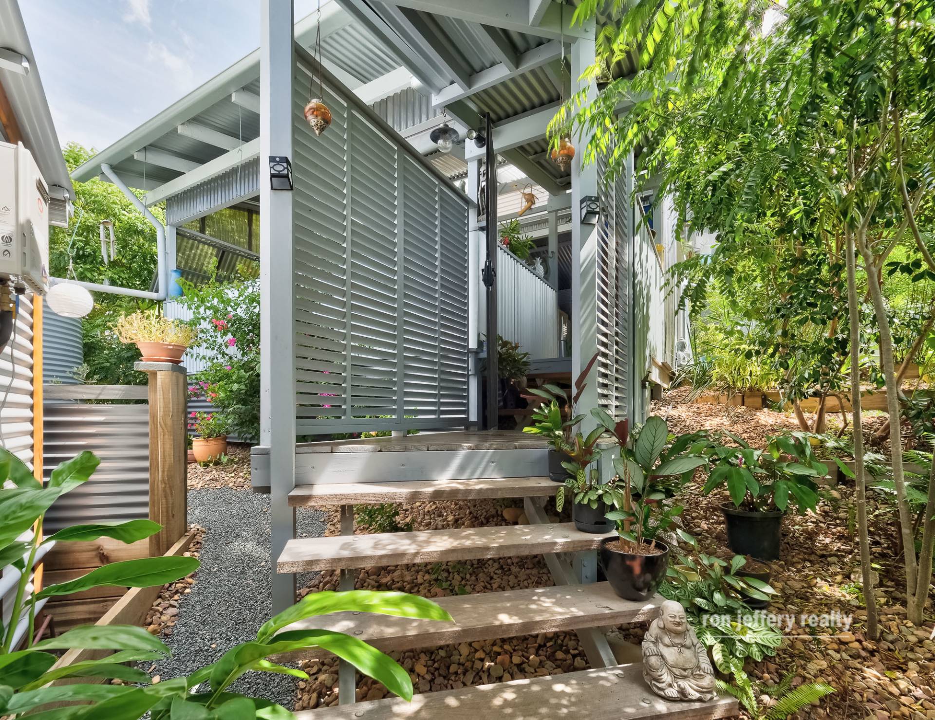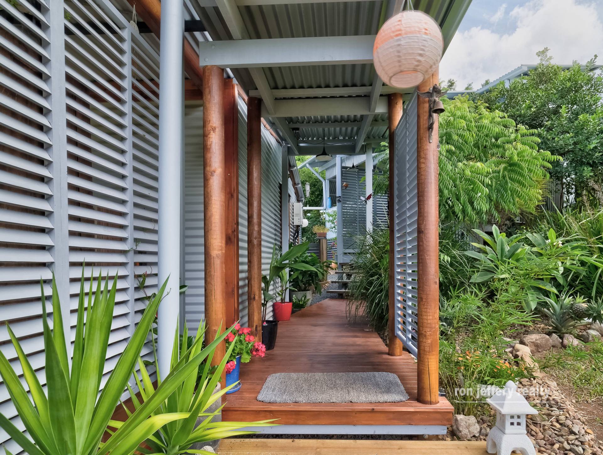 The deck on this level is larger than the first one, but with blinds and shutters to control the weather, it has the same feel. The large bedroom, new modern bathroom and combined kitchen/laundry all have access from this deck. The mature vegetation makes this level very private!
