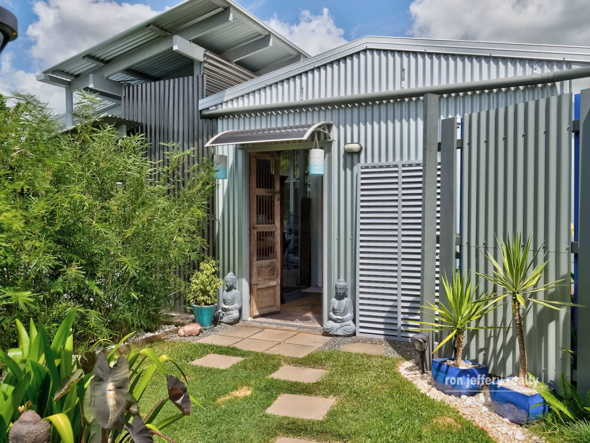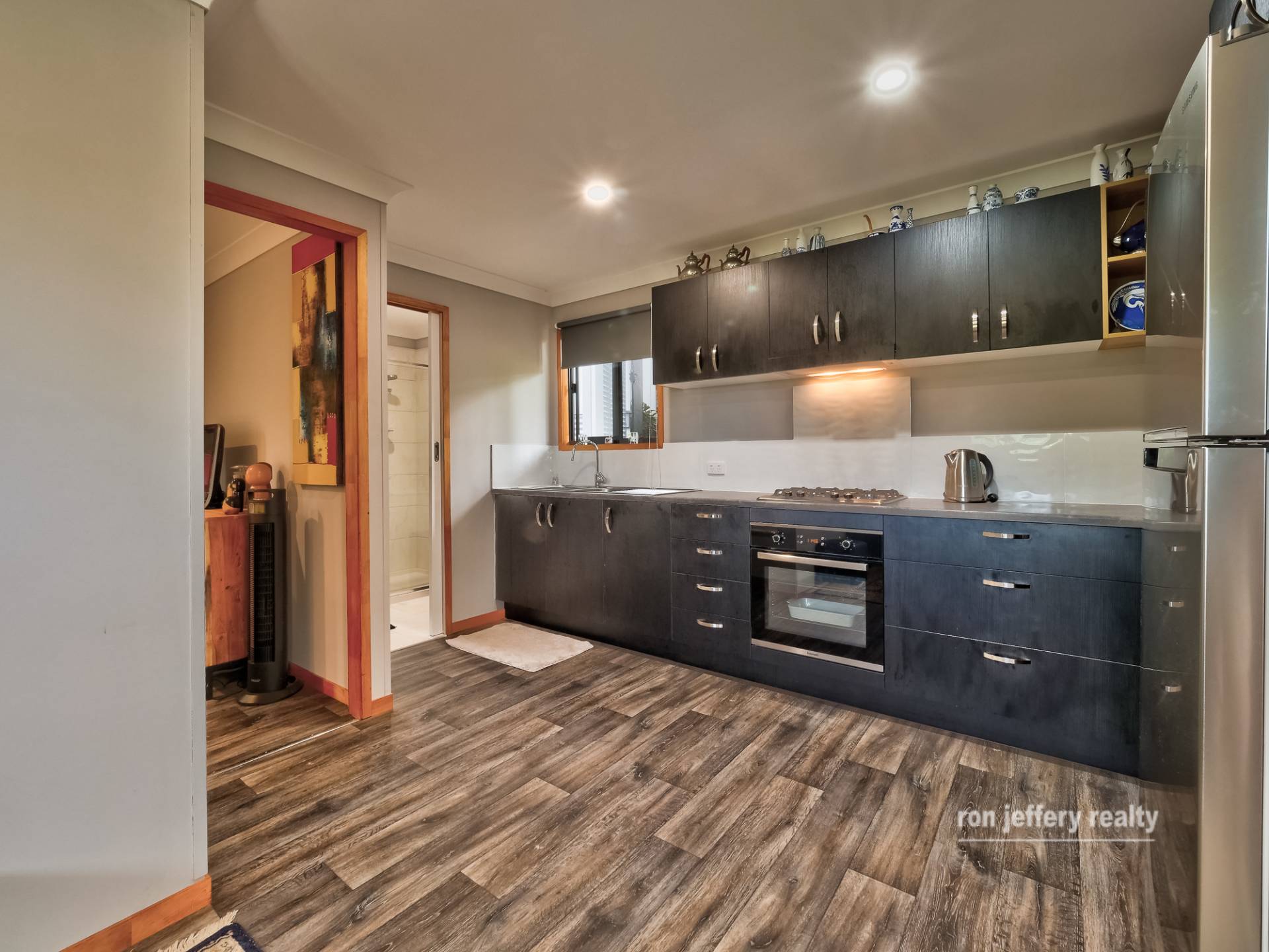The first building is a near new self-contained cabin! You enter via a semi-enclosed front deck with blinds and shutters to control the weather. The cabin is cosy, with one bedroom (with BIR), a fully equipped bathroom and an open plan living area that has the kitchen to one side. There is a gas cooktop, air conditioning and modern finishes.