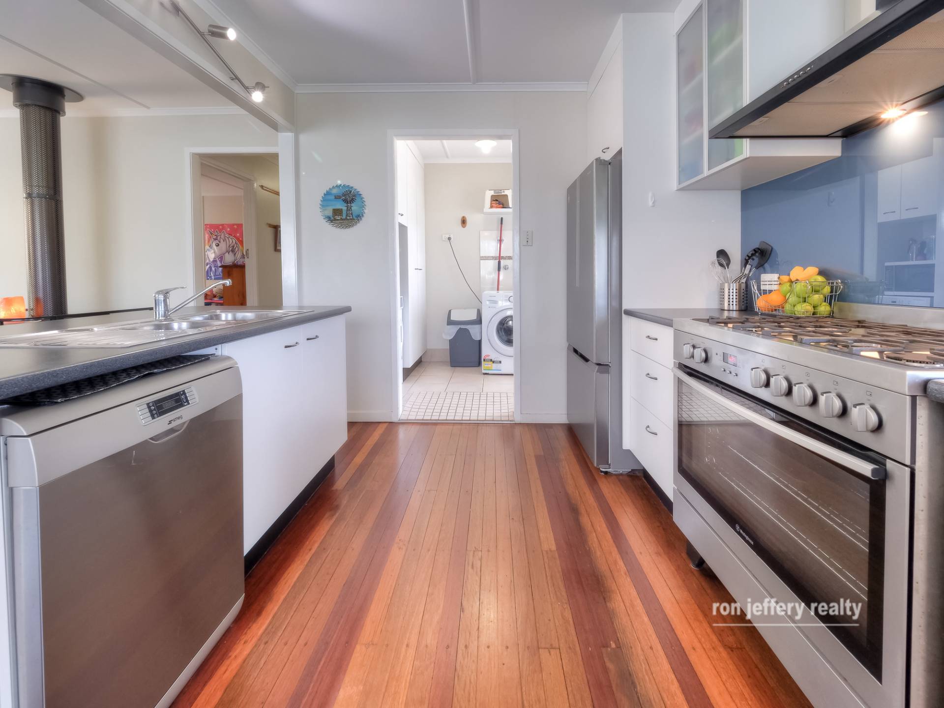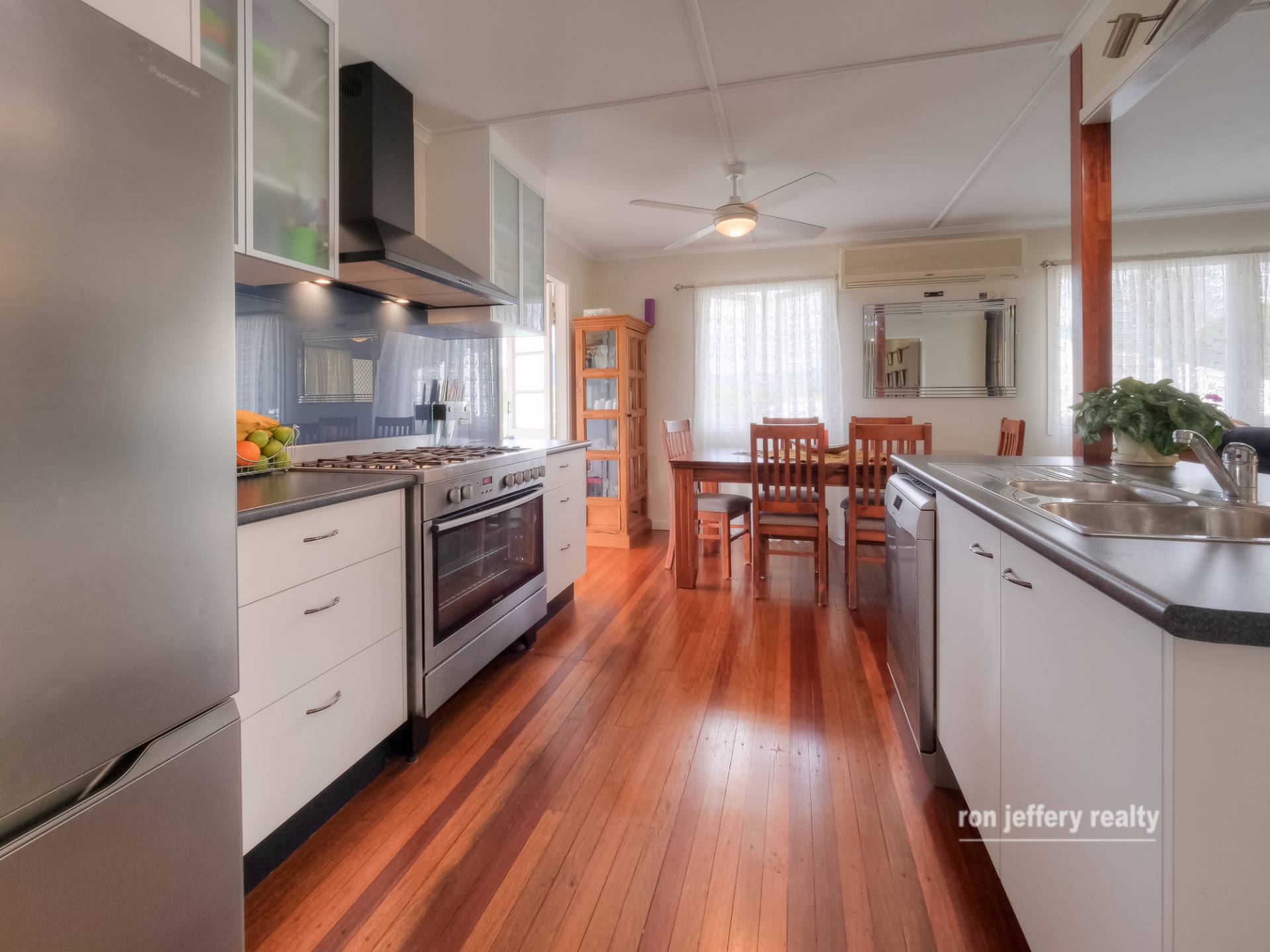From the front stairs, you enter straight into an open plan living room that includes lounge, dining and kitchen. This area has air conditioning and slow combustion heating while the whole house has polished timber floors. The kitchen is separated from the lounge by an island bench that includes a breakfast bar. However, the stainless steel, freestanding 5-burner gas stove, feature splashback & rangehood, are the features.