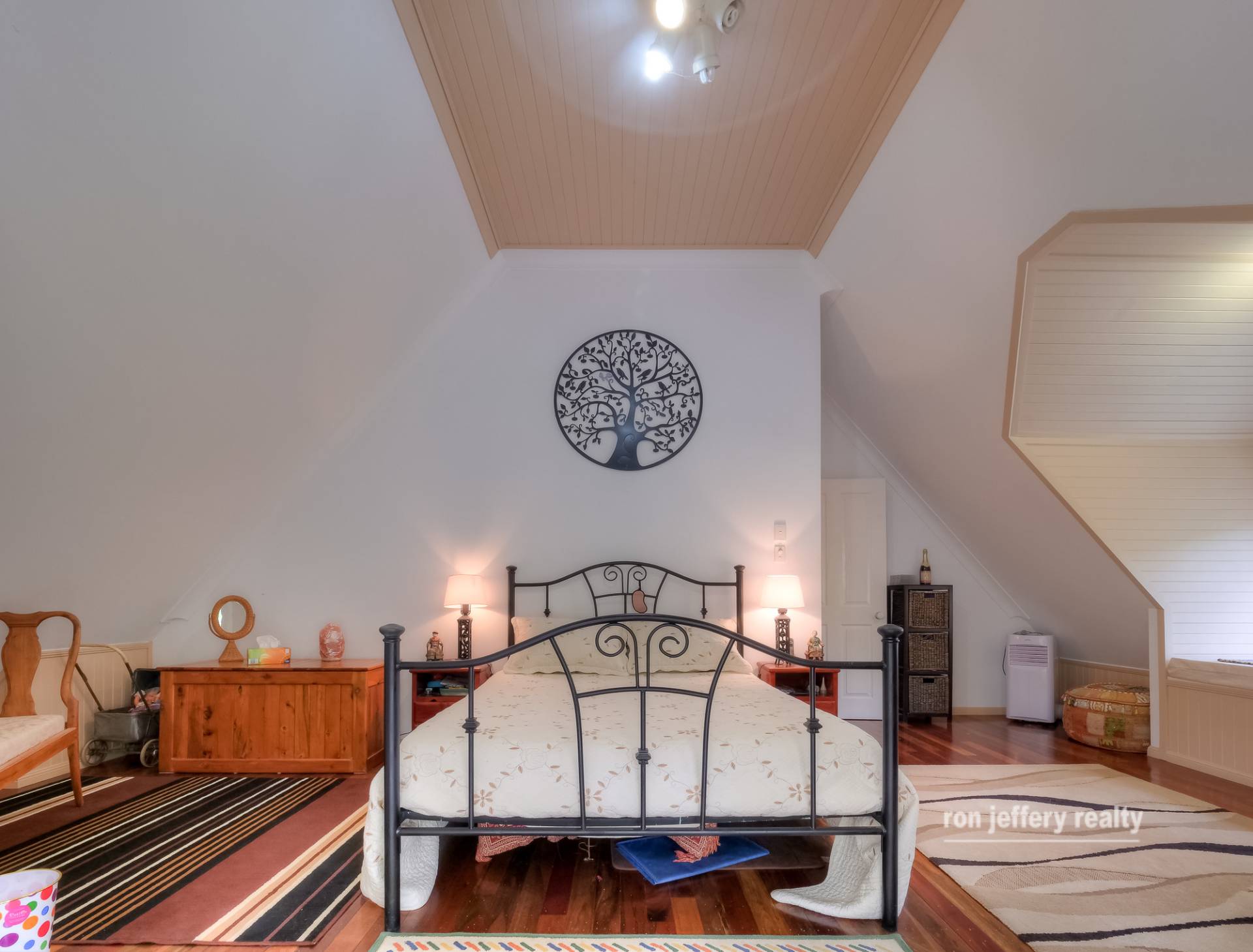Externally, the cypress timber clad home has decked verandas on all sides, with the wide rear veranda the ideal entertaining spot. Internally, you enter a semi open plan living space, set around the internal staircase. Polished timber floors and dado walls are featured right through the home. The lounge and dining rooms are at one end of the living area and, in a kitchen that backs onto the stairwell, you look straight into the outside entertaining area. The slow combustion heater will keep the whole house warm.