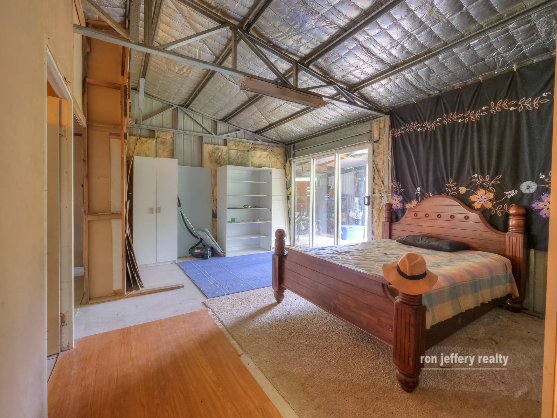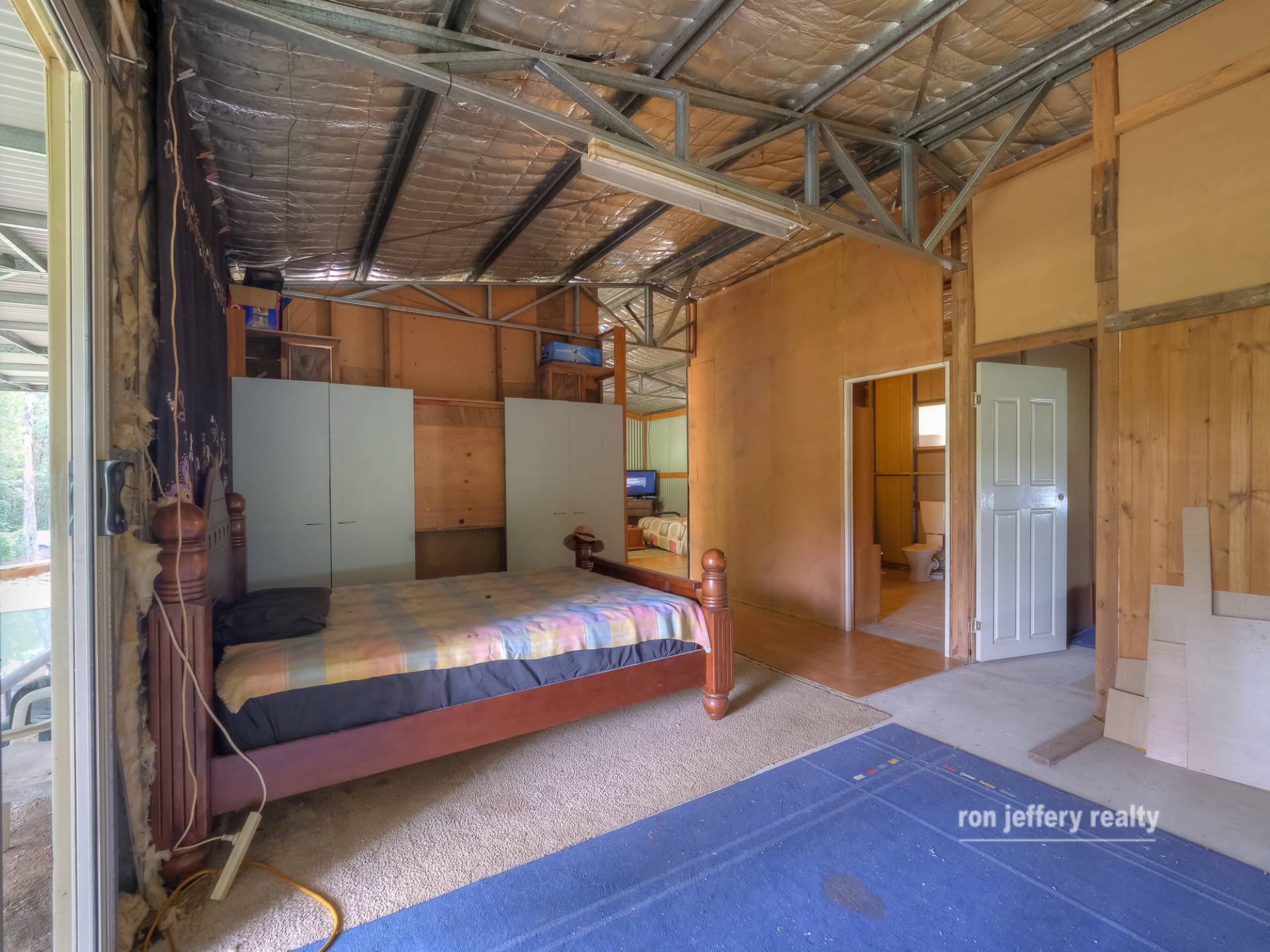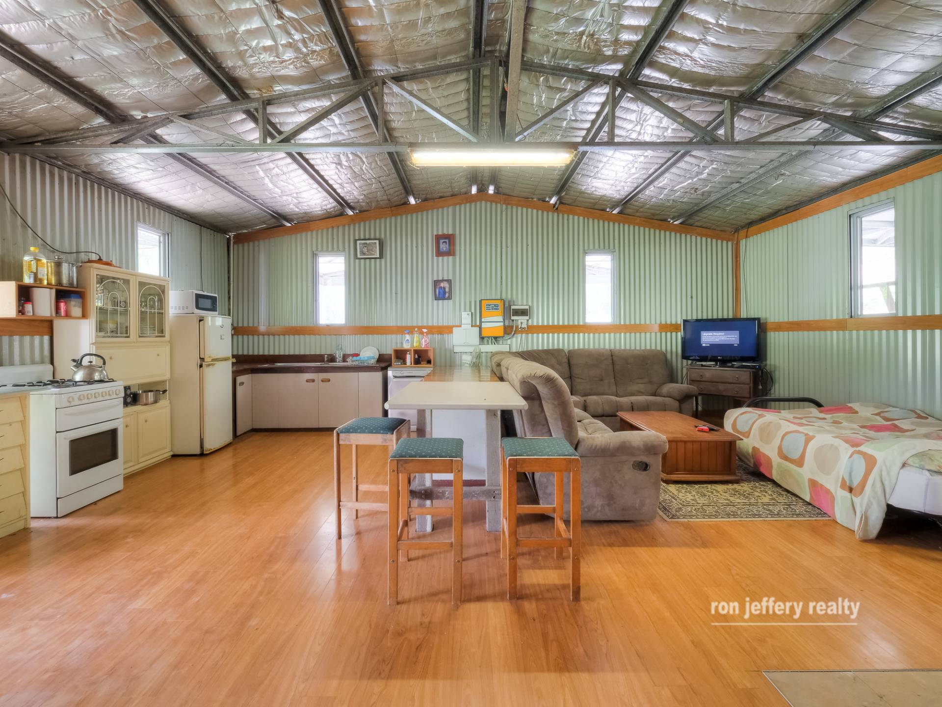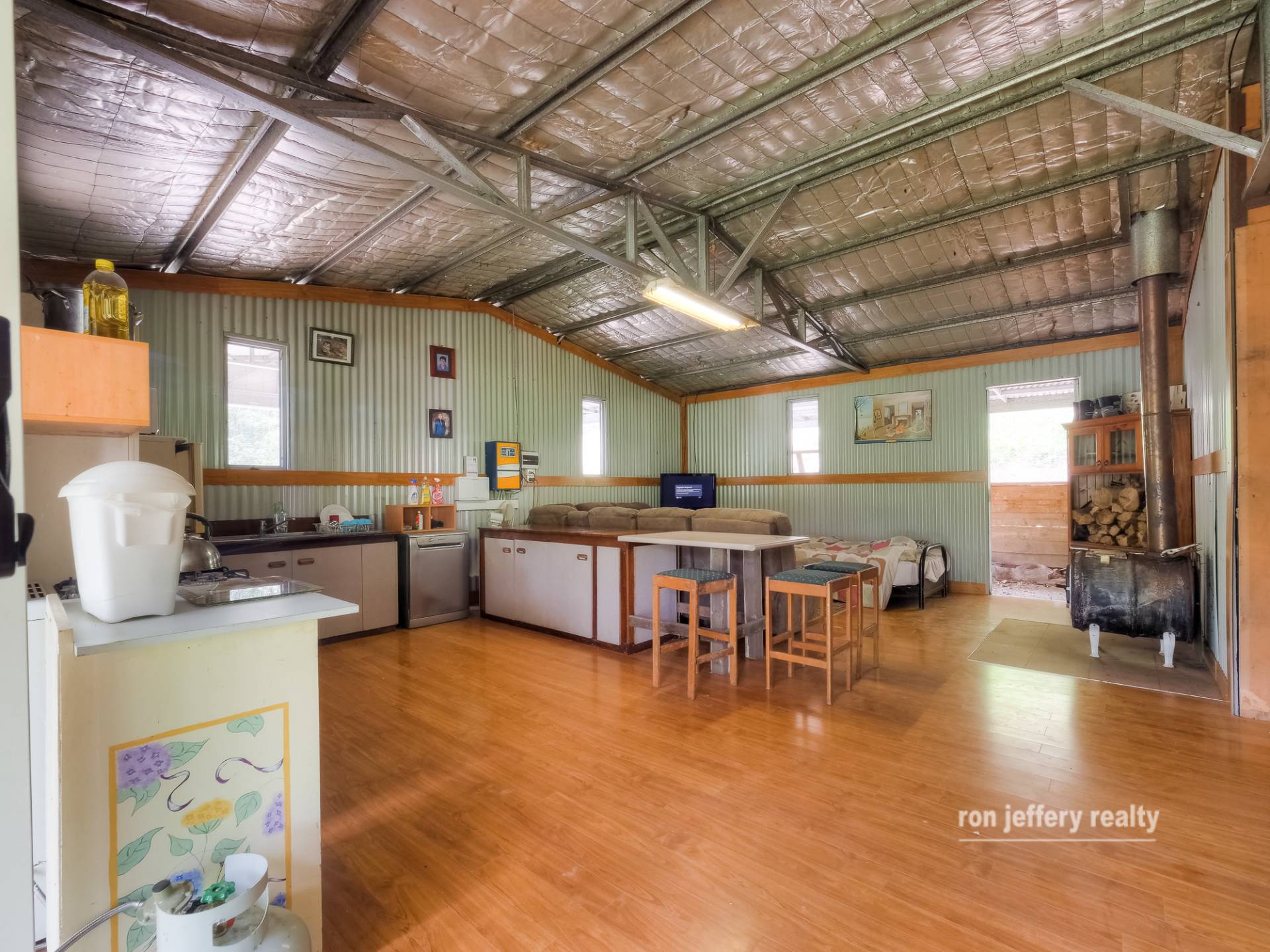 The second dwelling is set away from the first, affording privacy to both. The living area of this one is a very spacious open plan area with the kitchen in the corner and a large slow combustion heater. While this is a larger shed than number one, it requires some finishing to the internal linings on the bedroom end. An attached covered area provides a handy workshop.