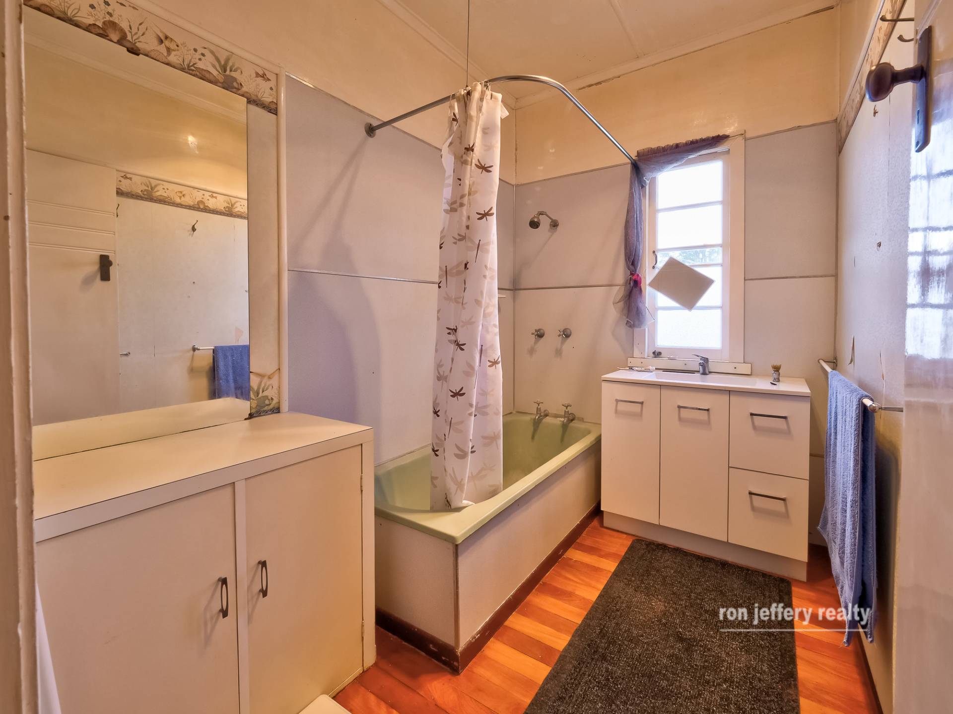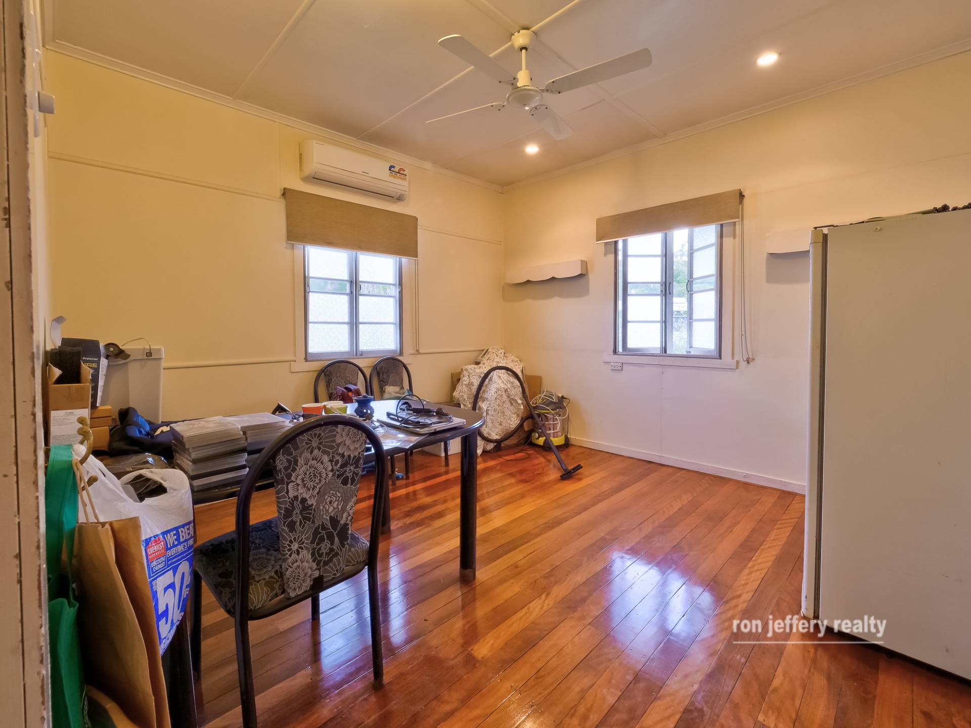 The kitchen is a country style, eat-in kitchen with gas cooking and genuine art deco cupboards. They are a fine example of the era. There are three generous sized bedrooms, all with air conditioning, and one bathroom. Every room in this family sized home is generous in size and features polished timber floors and ceiling fans.