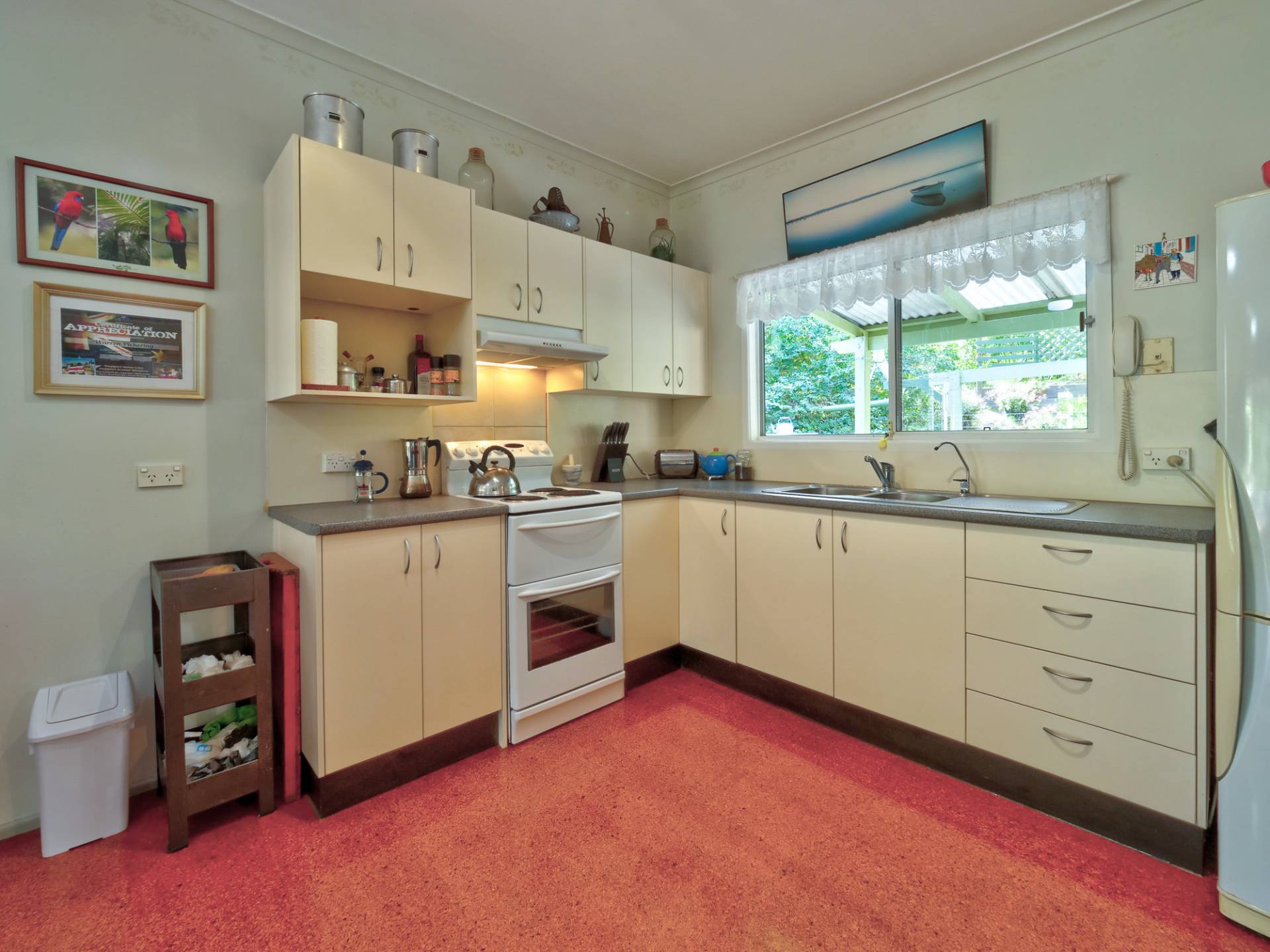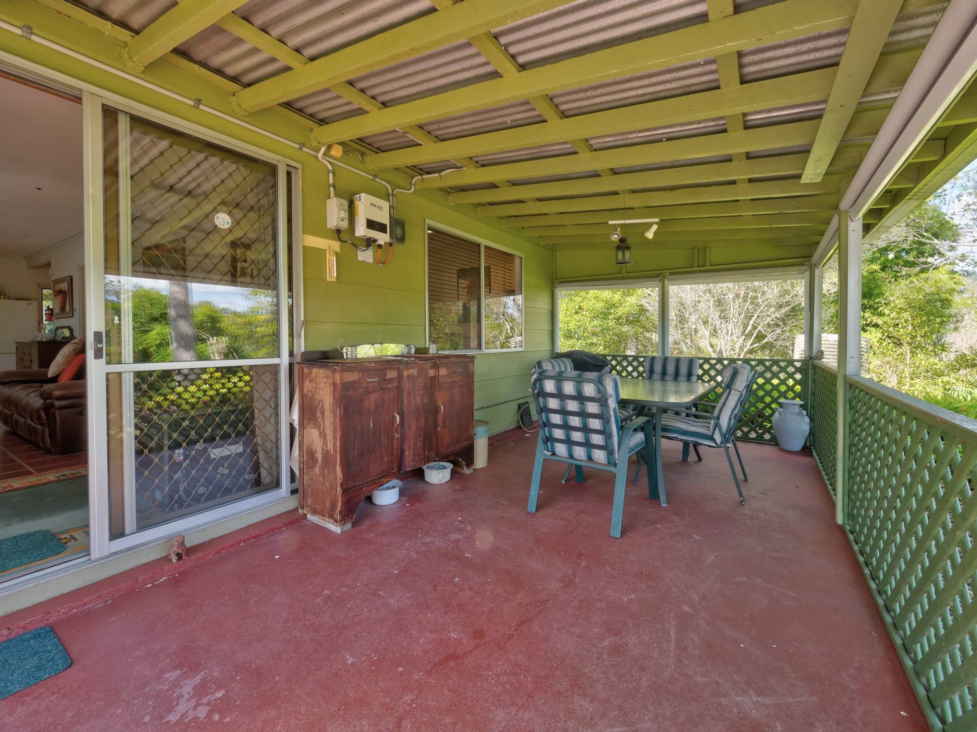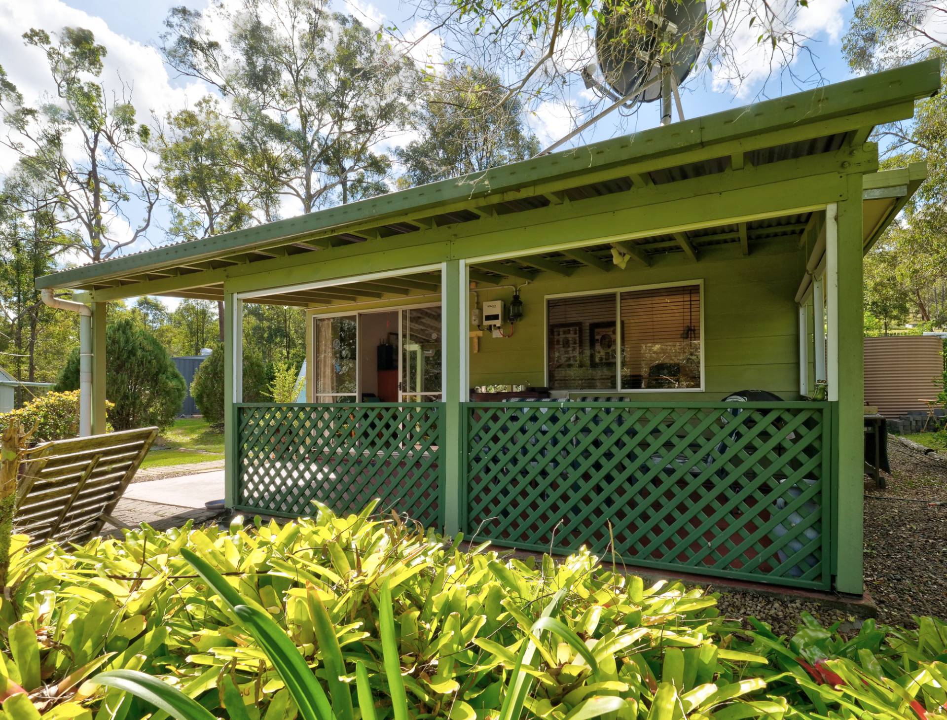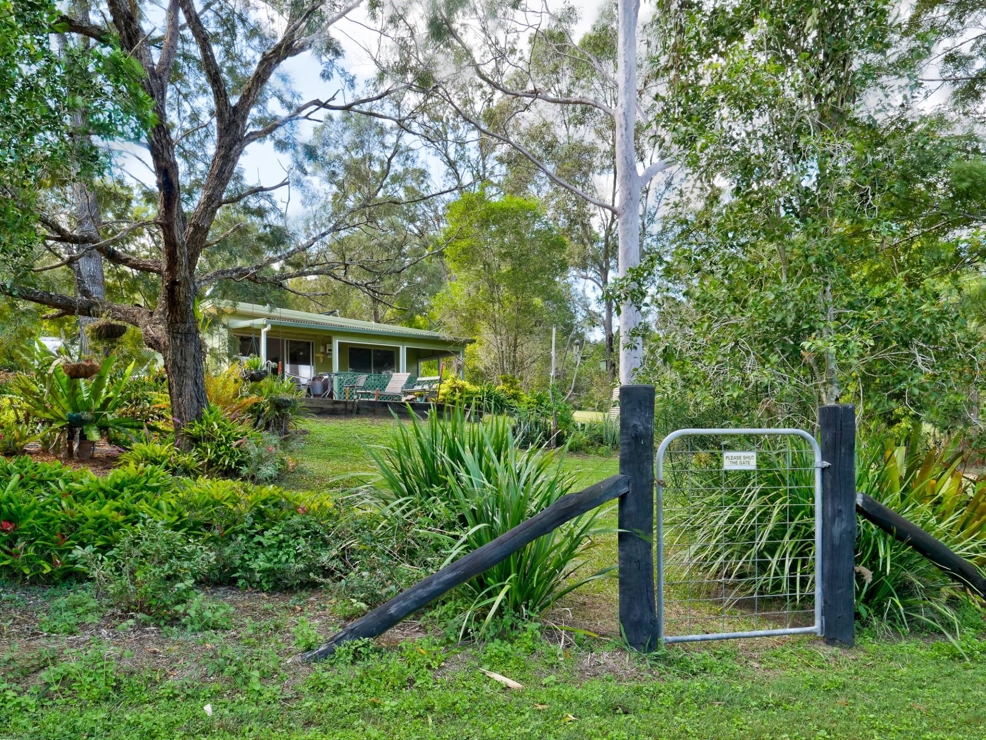 You enter the 11⁄2 acre (6,500m2) property via a long bamboo-lined driveway, with a cute cottage at the rear of the block. The front covered entertaining area takes in a view of the landscaped grounds. Inside, there is an open plan living room that includes the kitchen. It’s simple in layout & fitment, immaculate in maintenance & presentation. The floors are a concrete slab with cork tiles in a kitchen that has a freestanding electric stove. There is gas heating to warm the cottage in winter and a study nook that takes in the view (a great place to work).