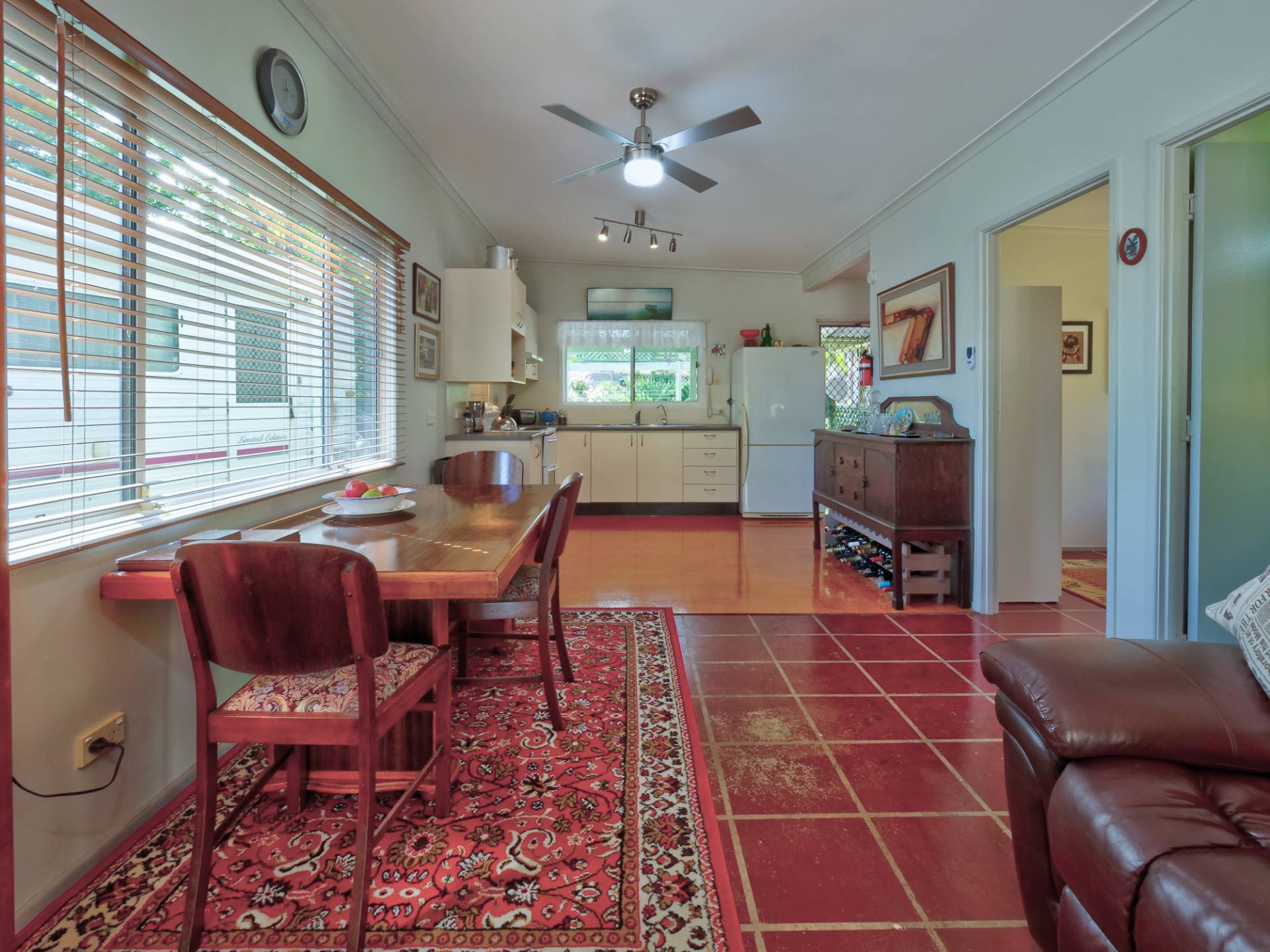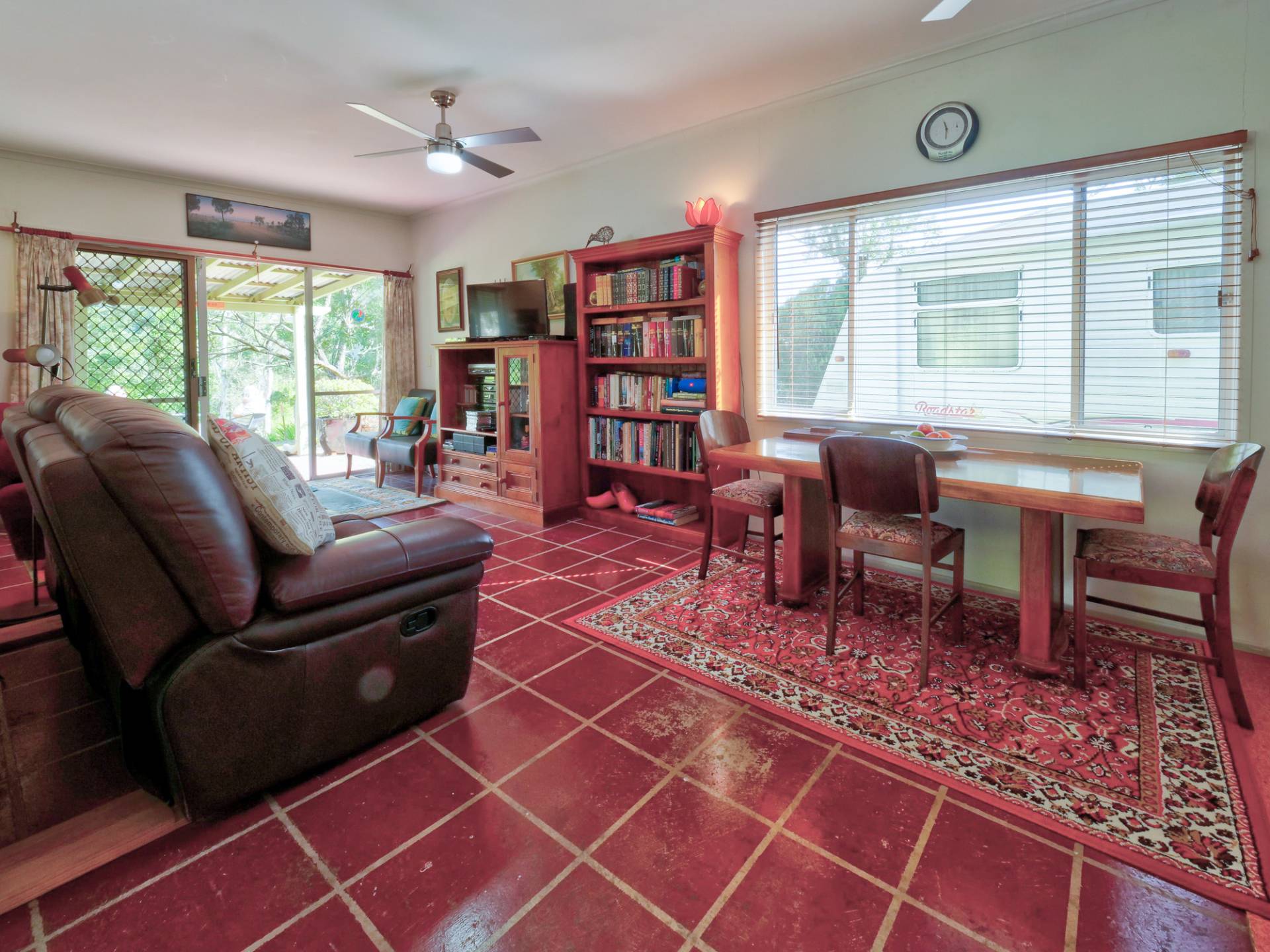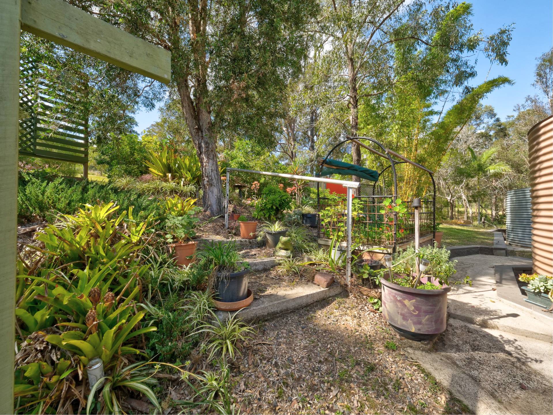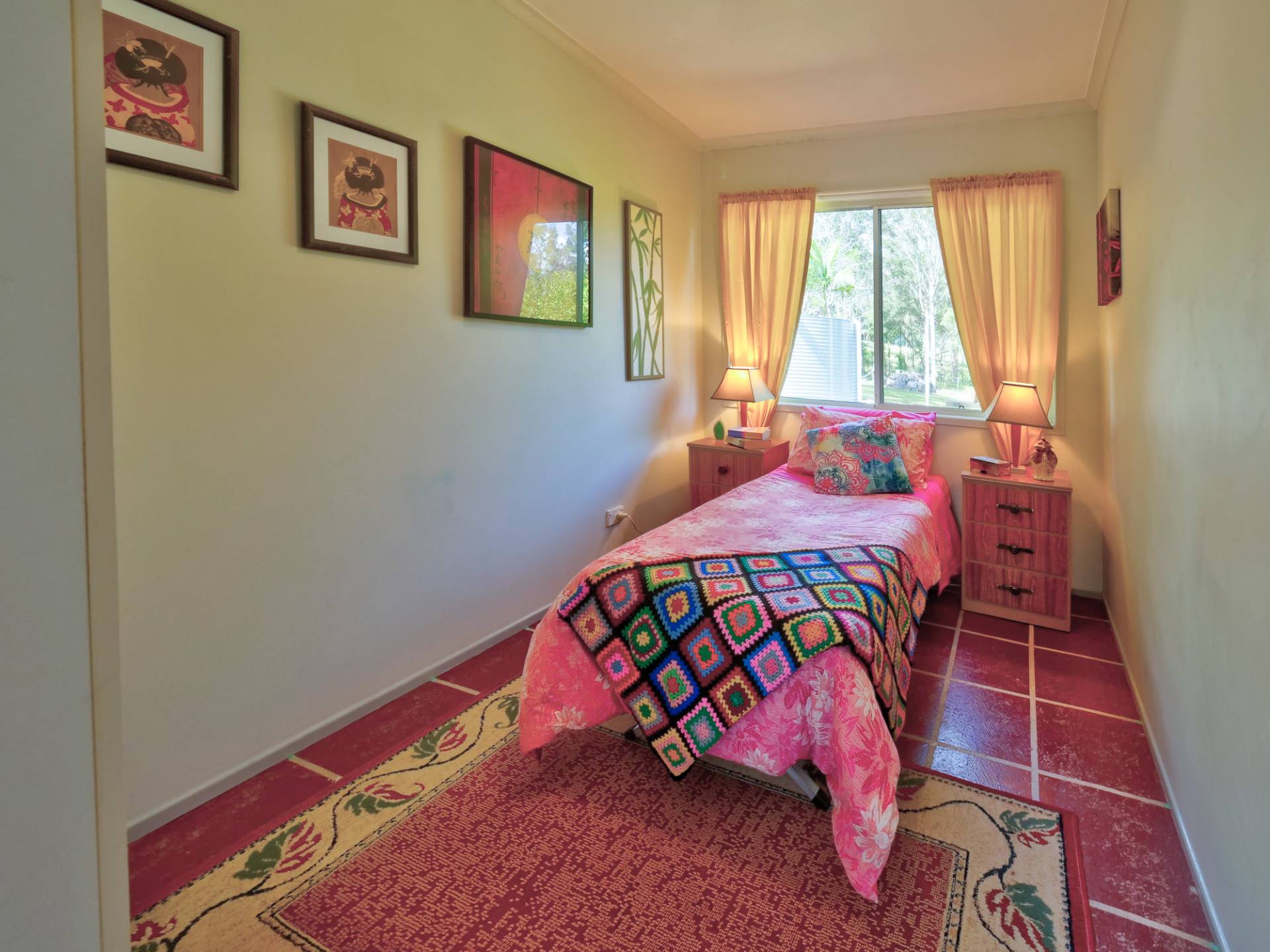 You enter the 11⁄2 acre (6,500m2) property via a long bamboo-lined driveway, with a cute cottage at the rear of the block. The front covered entertaining area takes in a view of the landscaped grounds. Inside, there is an open plan living room that includes the kitchen. It’s simple in layout & fitment, immaculate in maintenance & presentation. The floors are a concrete slab with cork tiles in a kitchen that has a freestanding electric stove. There is gas heating to warm the cottage in winter and a study nook that takes in the view (a great place to work).