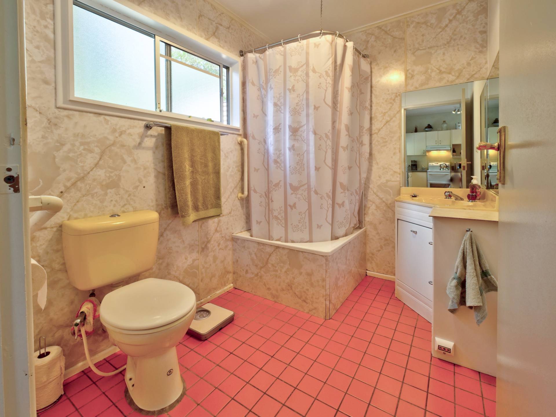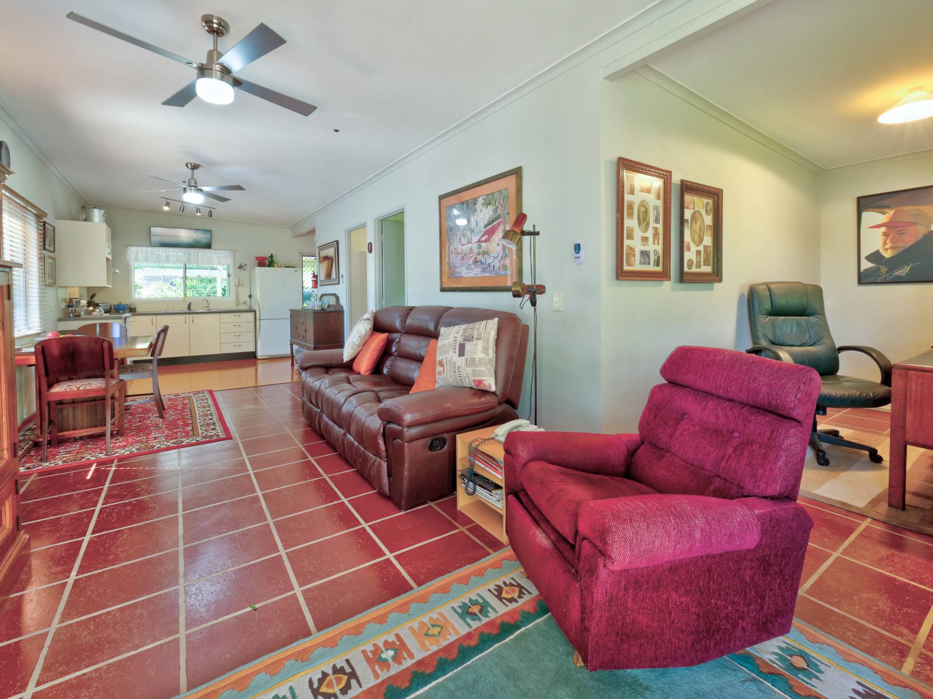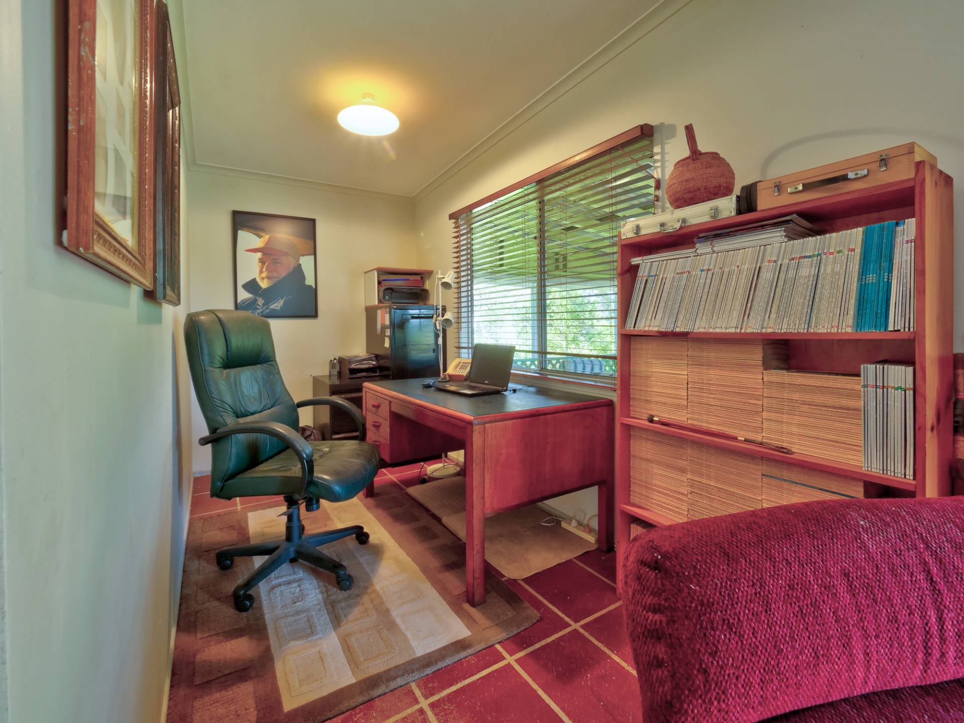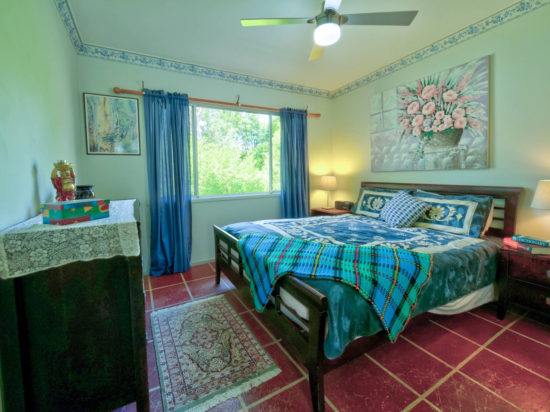 You enter the 11⁄2 acre (6,500m2) property via a long bamboo-lined driveway, with a cute cottage at the rear of the block. The front covered entertaining area takes in a view of the landscaped grounds. Inside, there is an open plan living room that includes the kitchen. It’s simple in layout & fitment, immaculate in maintenance & presentation. The floors are a concrete slab with cork tiles in a kitchen that has a freestanding electric stove. There is gas heating to warm the cottage in winter and a study nook that takes in the view (a great place to work).