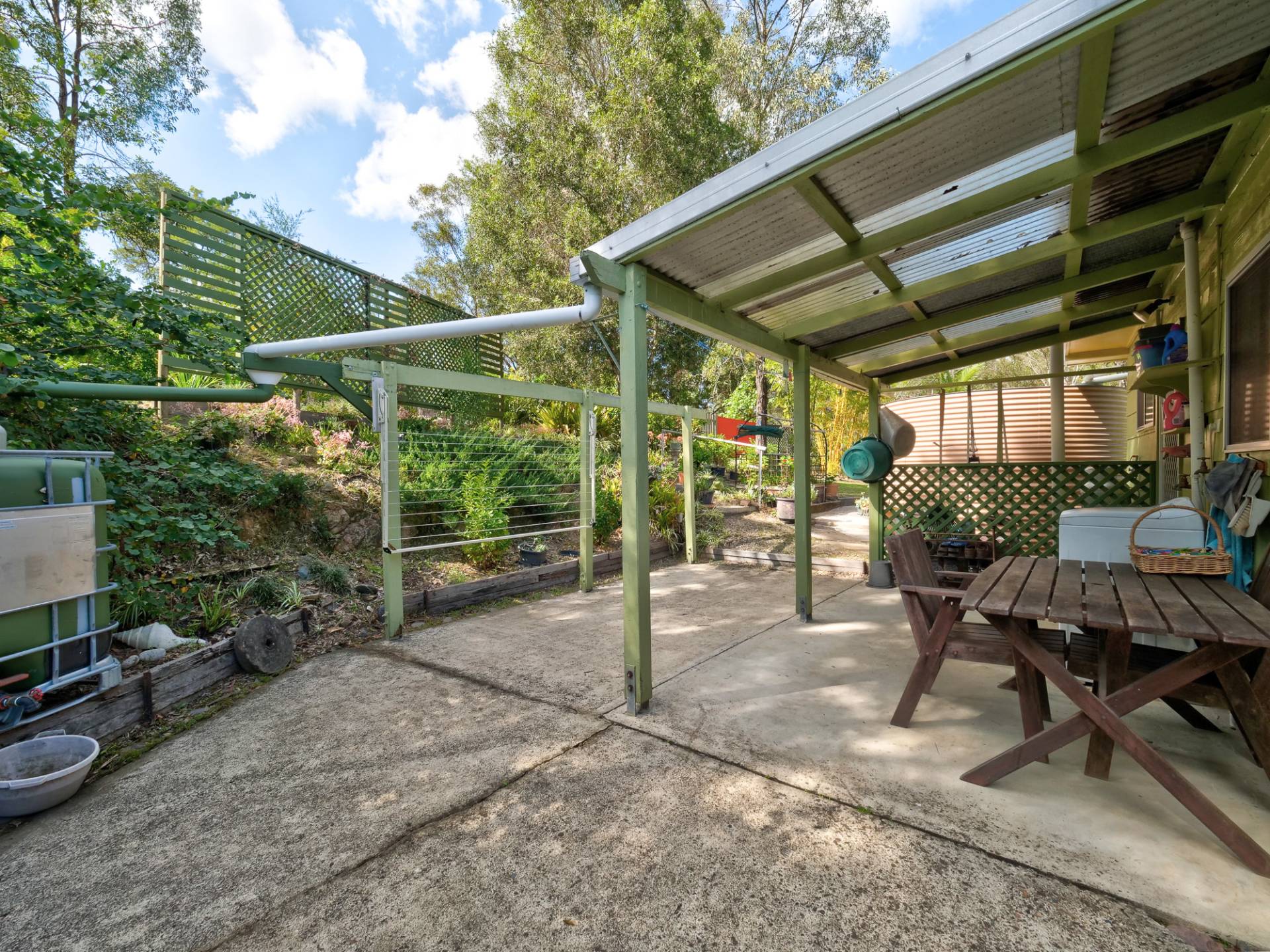 There are 2 bedrooms, with freestanding wardrobes, and one bathroom. Another sitting area, at the rear of the cottage, adds to the outside relaxation choices. Infrastructure includes retainer walls and good tank water storage. Solar power back to the grid is a bonus. Outbuildings include a double garage and a container-shed, complete with a single carport.