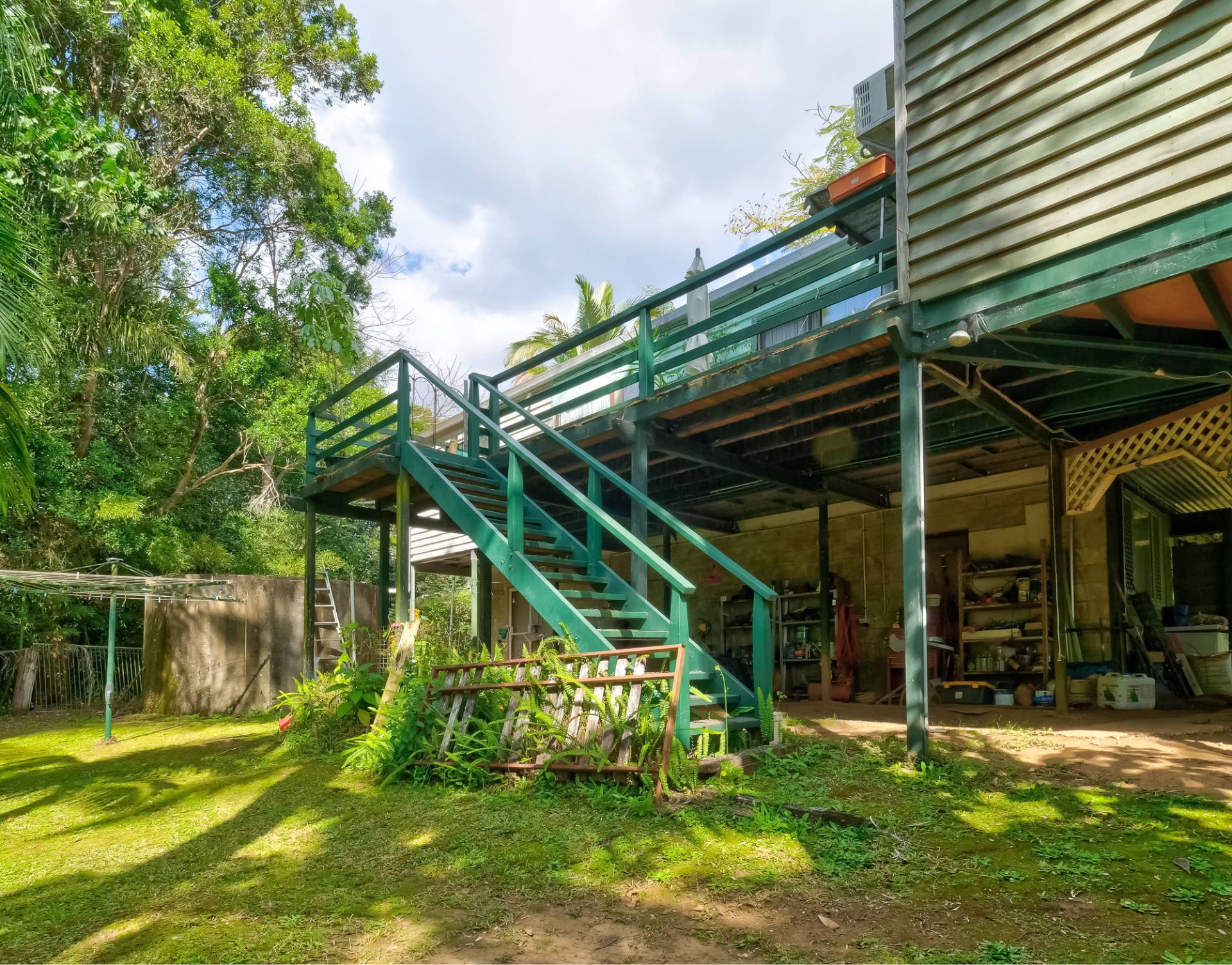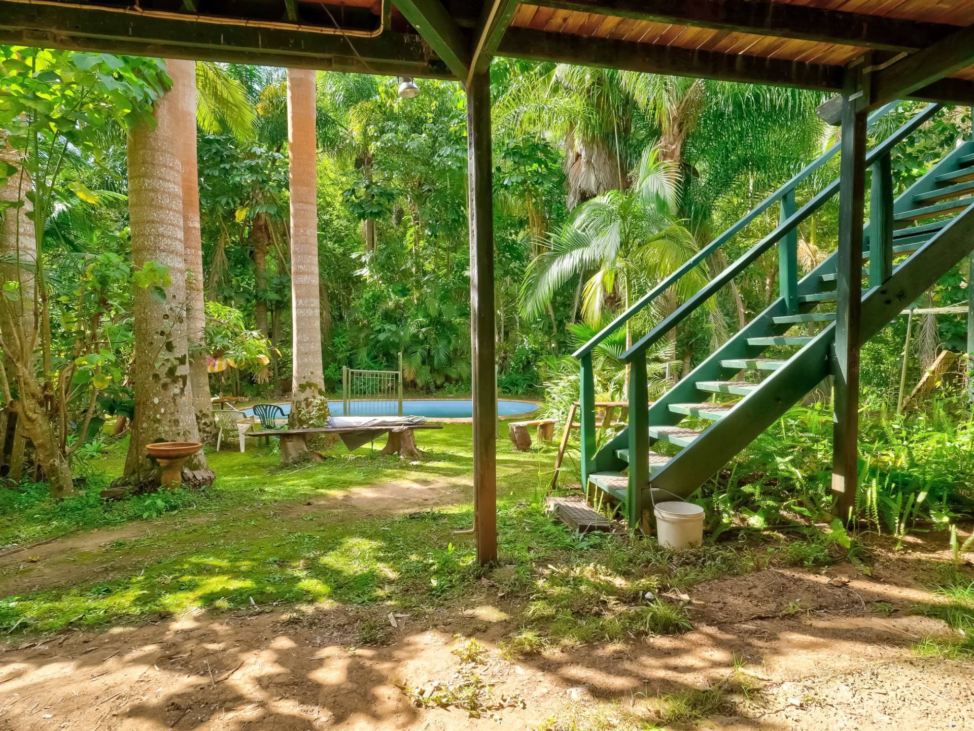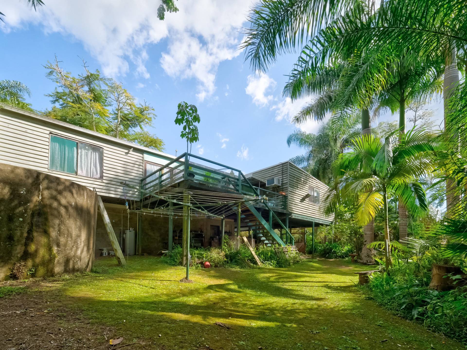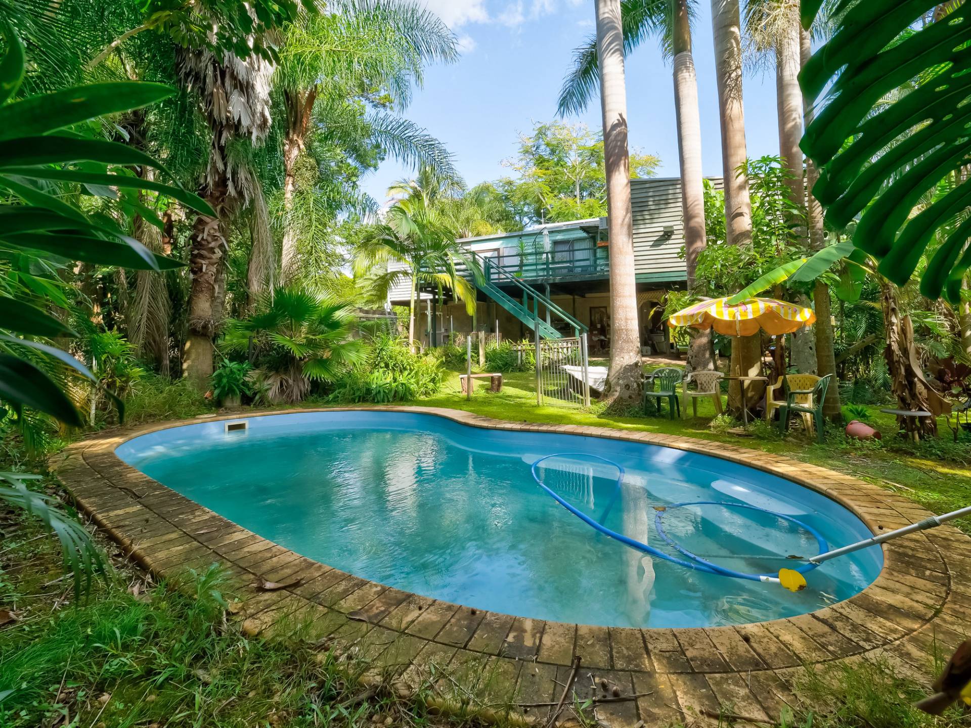 Downstairs, where the walls are solid block, has a self-contained flat, with full bathroom and kitchen facilities. The current configuration provides parking for 3 vehicles. The setting around the house and the pool is tropical, featuring palm trees and bamboo. Shaded tracks take you through the rainforest and past the creek, to the cleared sections of the block. Water from the bore on the property is drinkable quality.