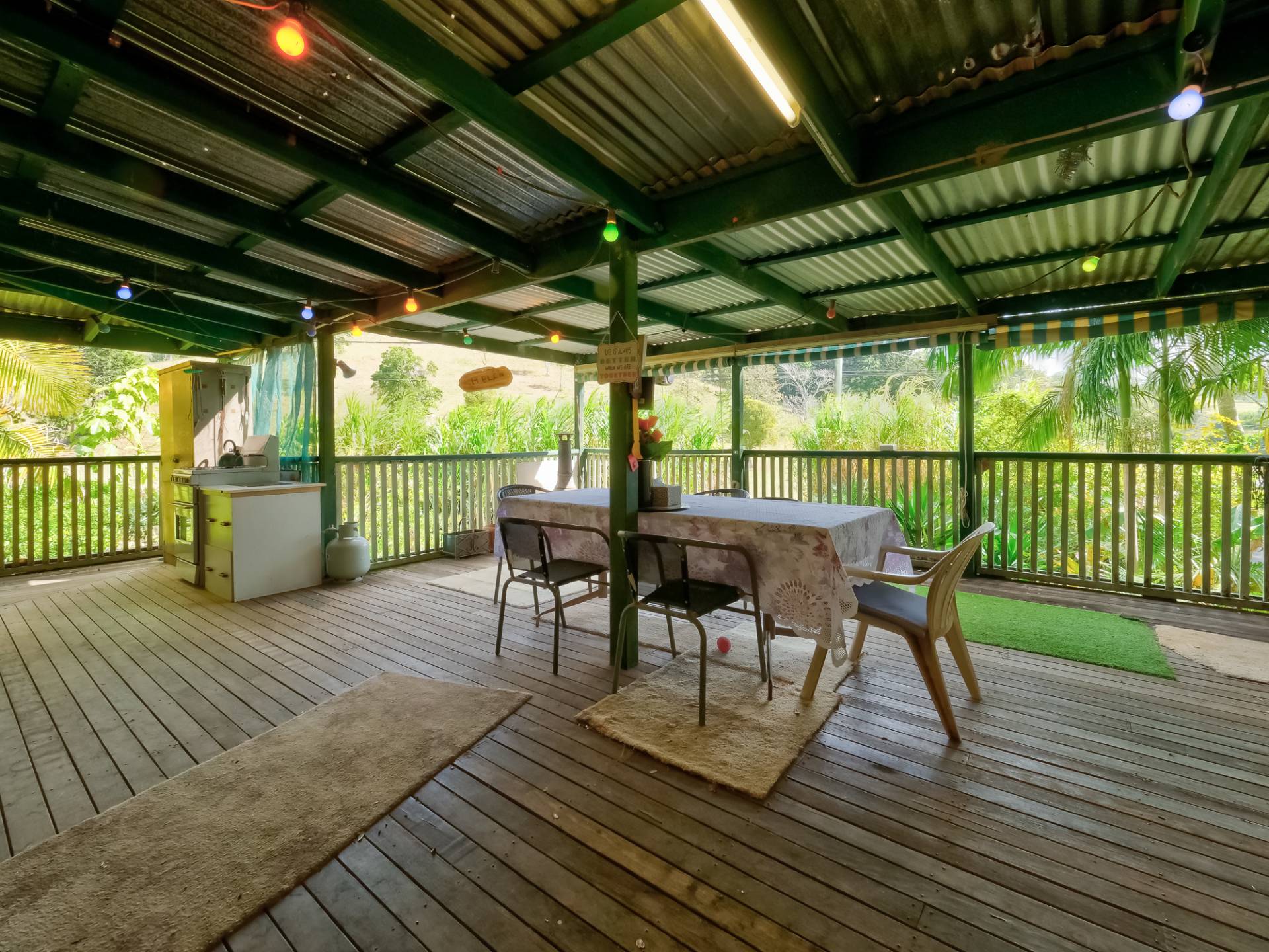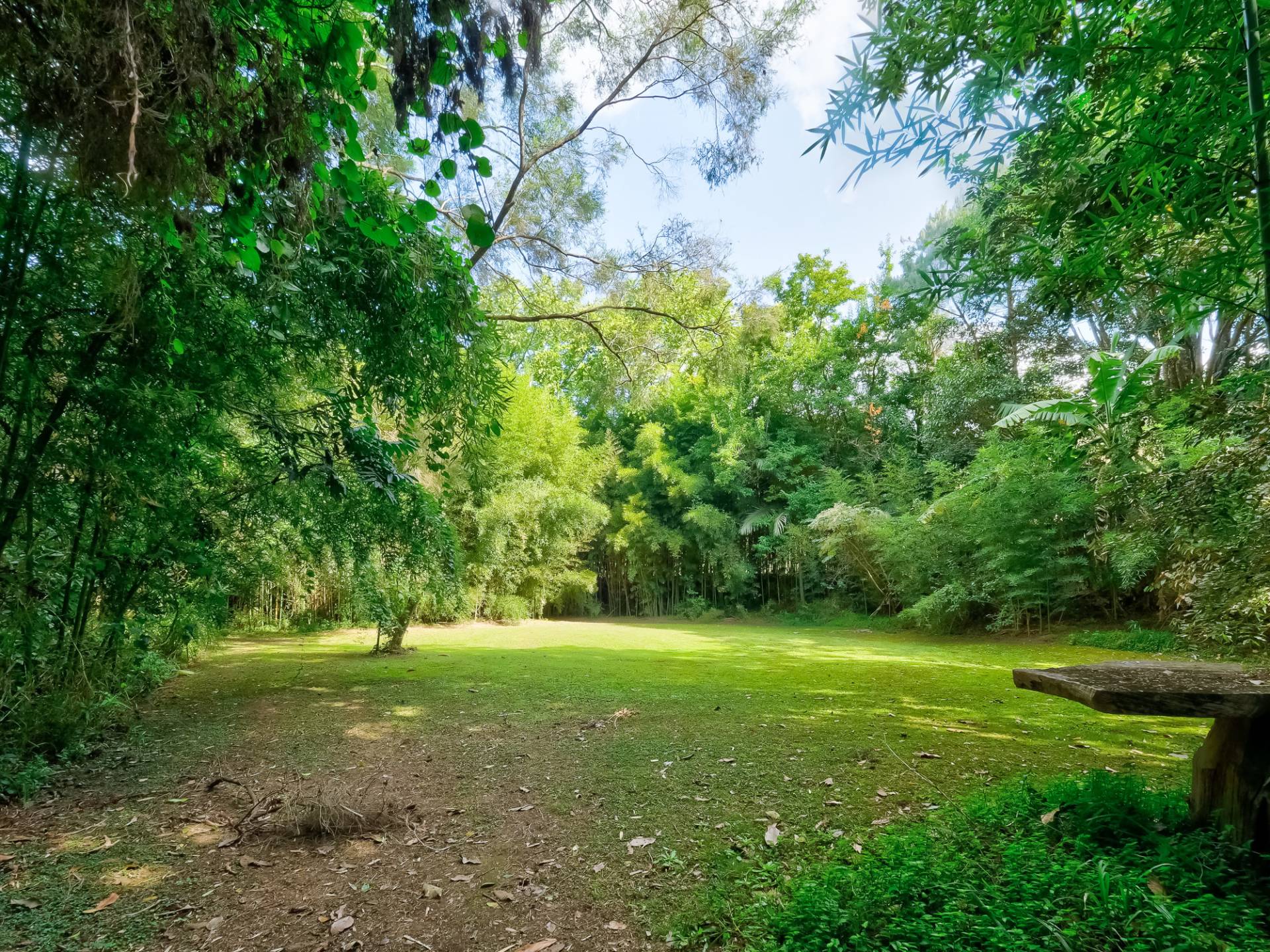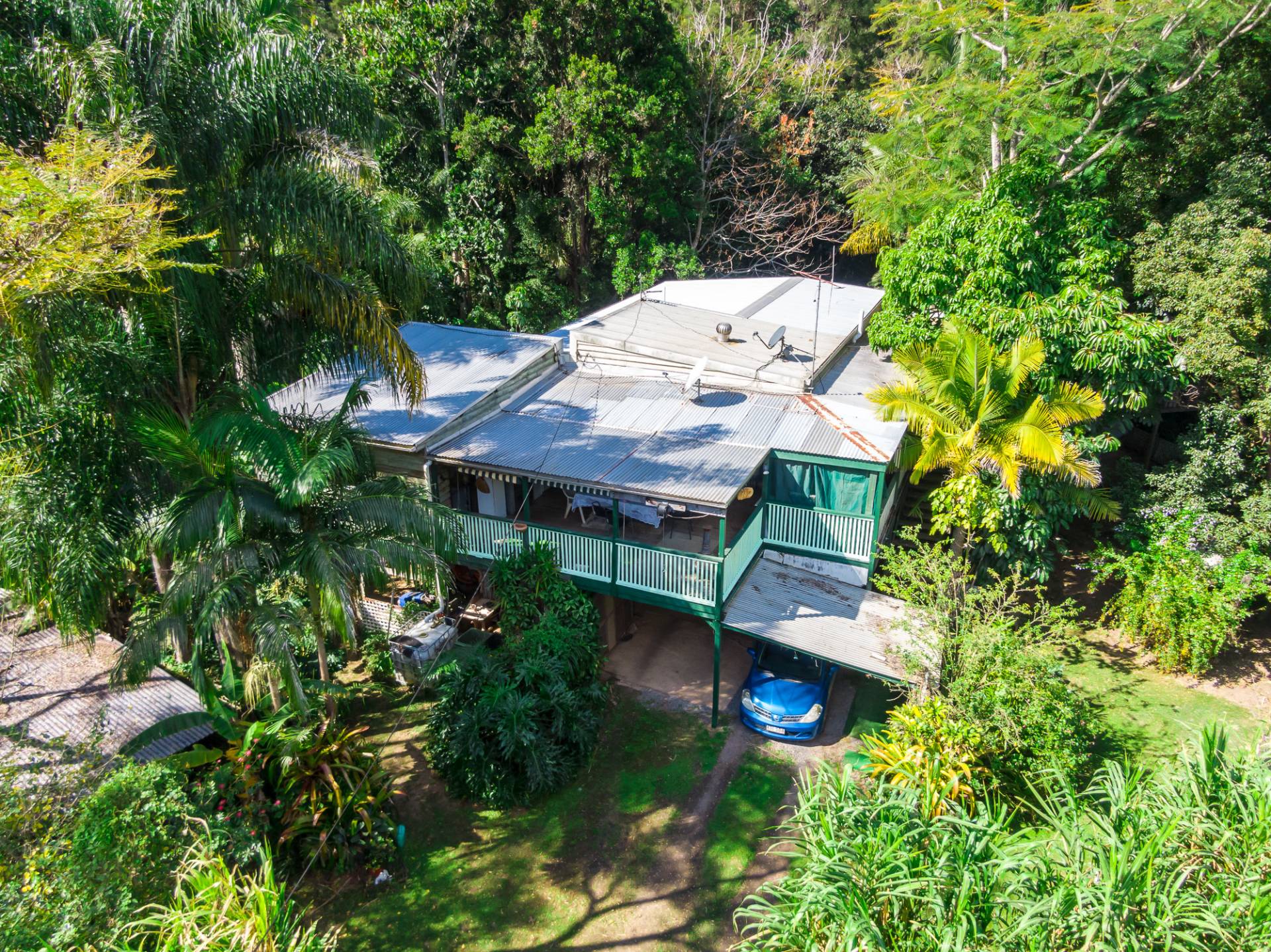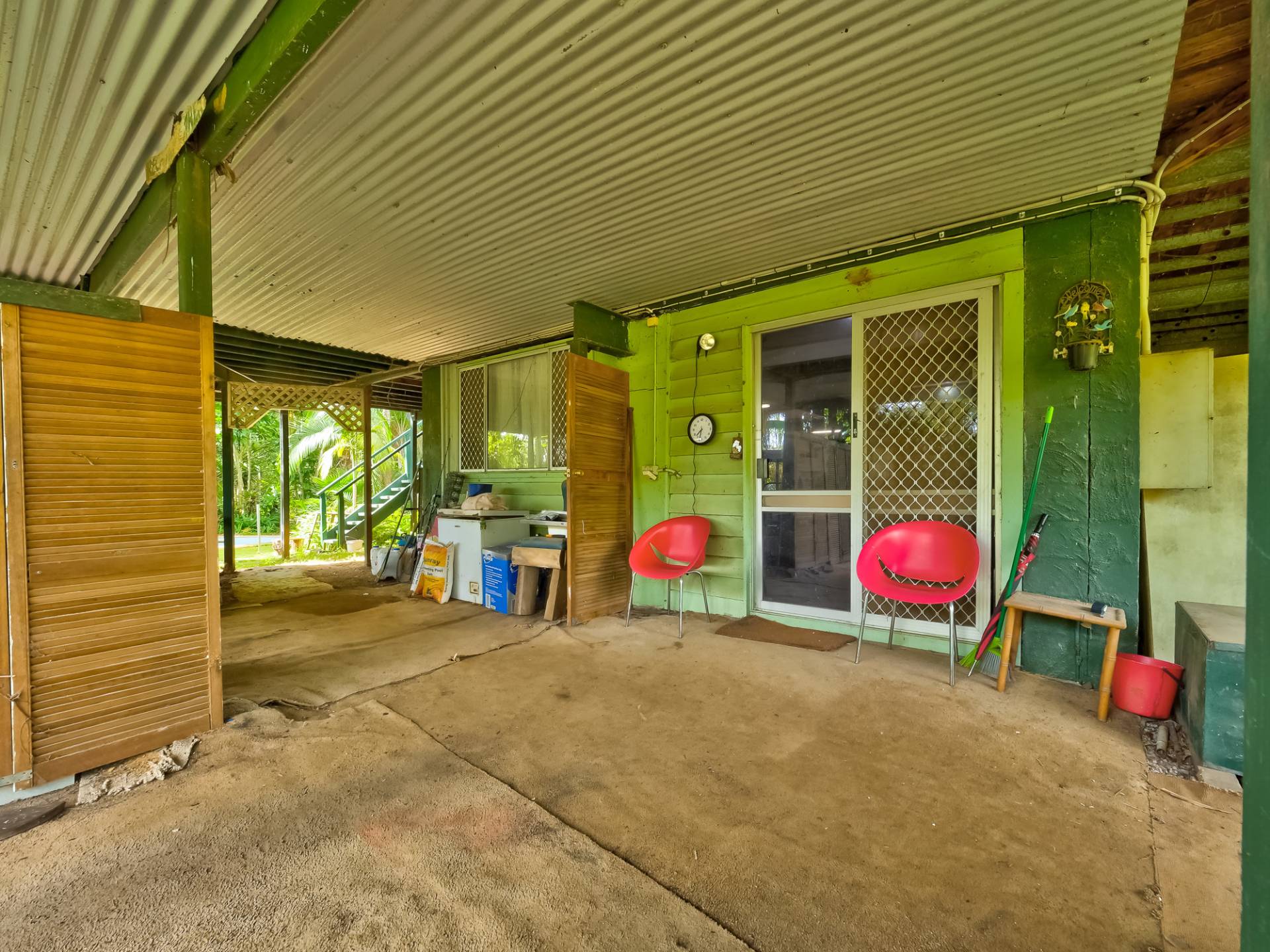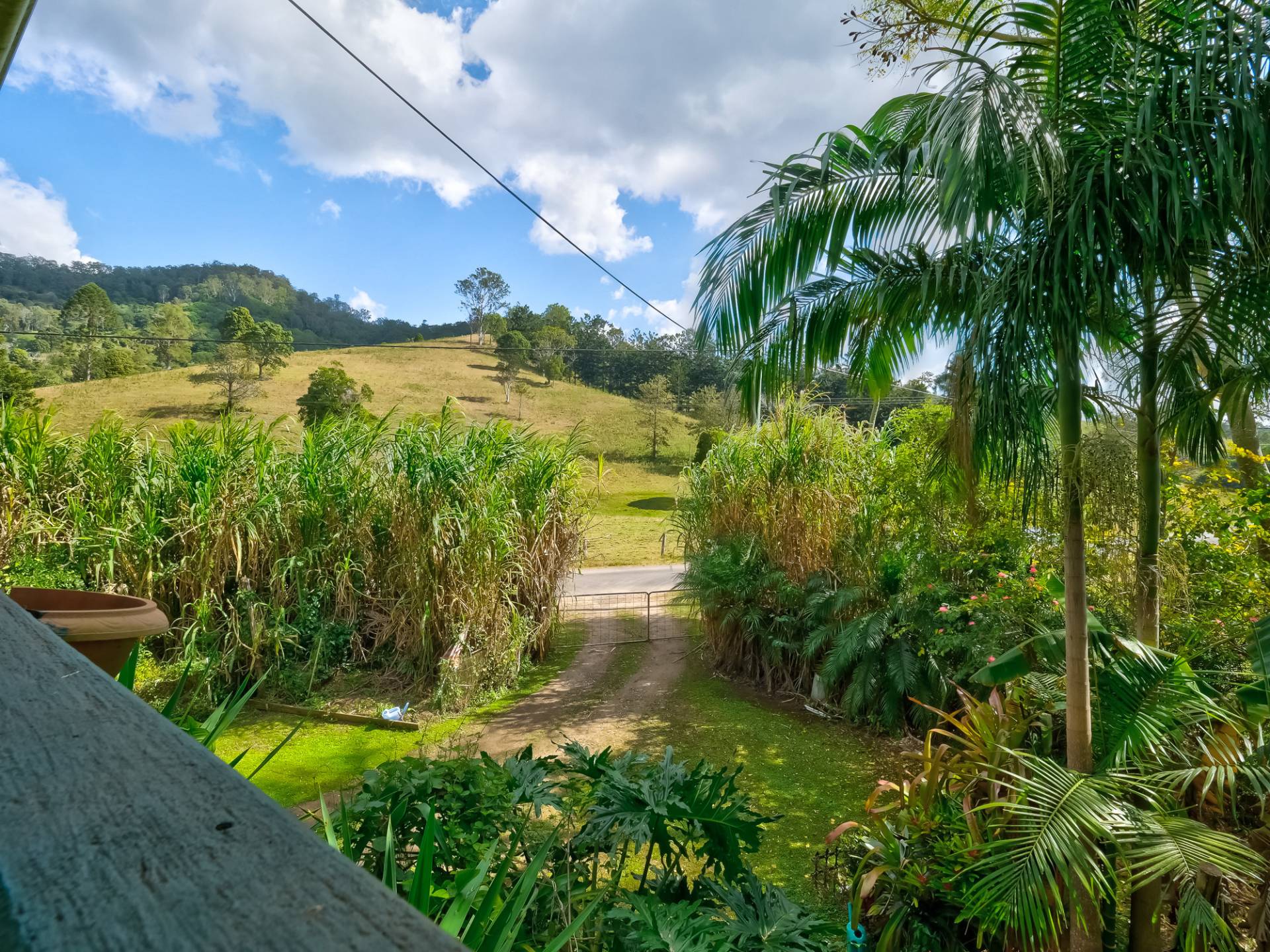 Downstairs, where the walls are solid block, has a self-contained flat, with full bathroom and kitchen facilities. The current configuration provides parking for 3 vehicles. The setting around the house and the pool is tropical, featuring palm trees and bamboo. Shaded tracks take you through the rainforest and past the creek, to the cleared sections of the block. Water from the bore on the property is drinkable quality.