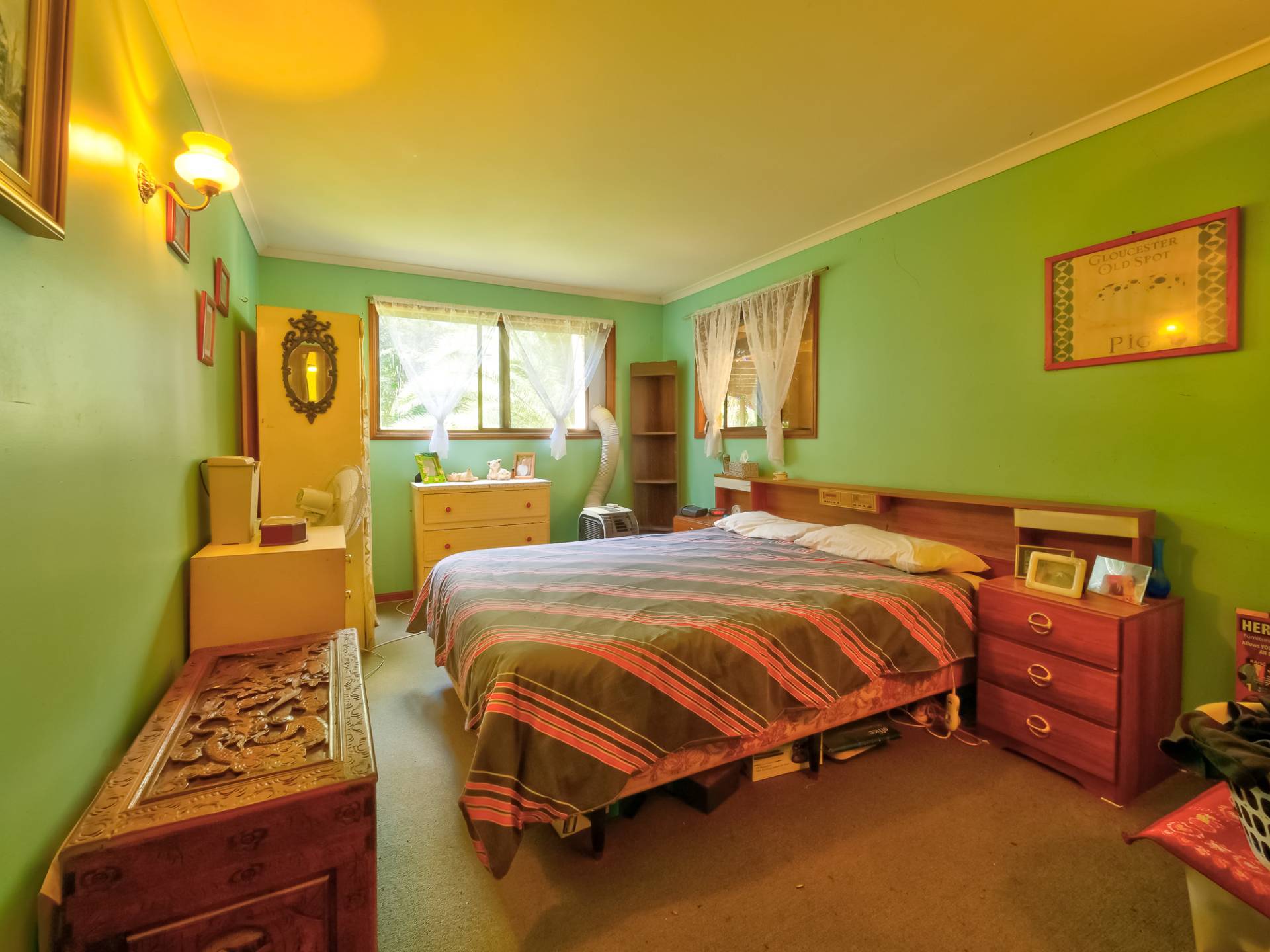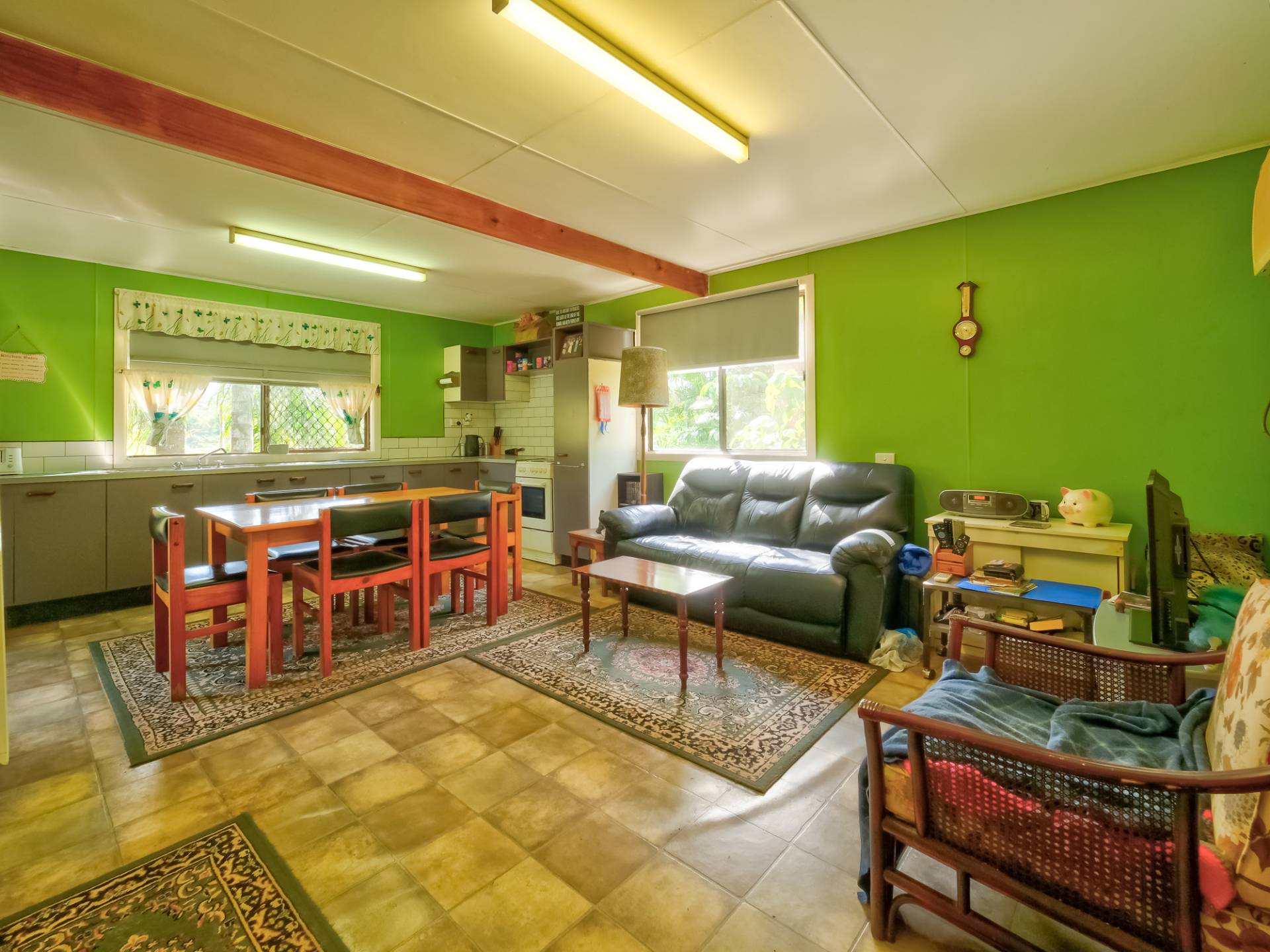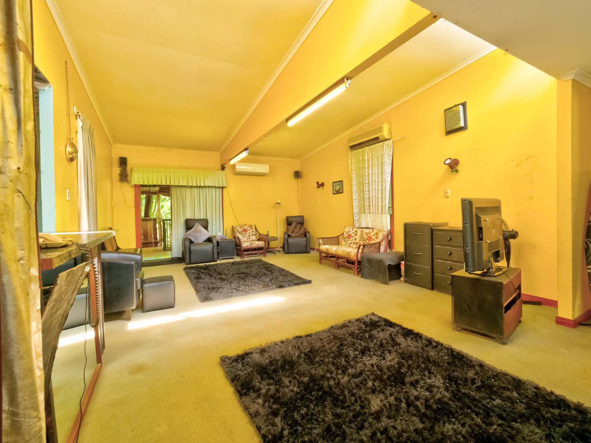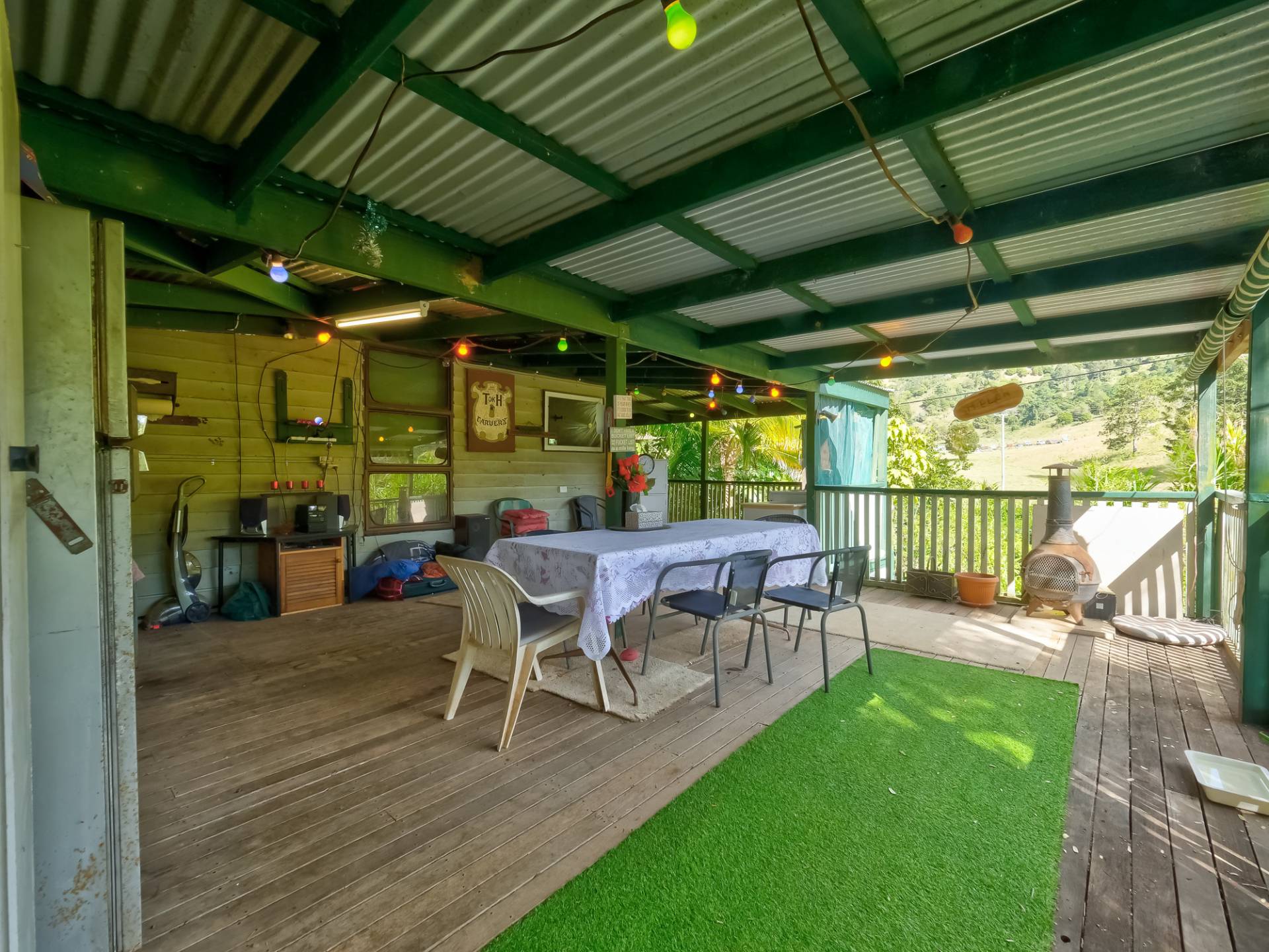 Downstairs, where the walls are solid block, has a self-contained flat, with full bathroom and kitchen facilities. The current configuration provides parking for 3 vehicles. The setting around the house and the pool is tropical, featuring palm trees and bamboo. Shaded tracks take you through the rainforest and past the creek, to the cleared sections of the block. Water from the bore on the property is drinkable quality.