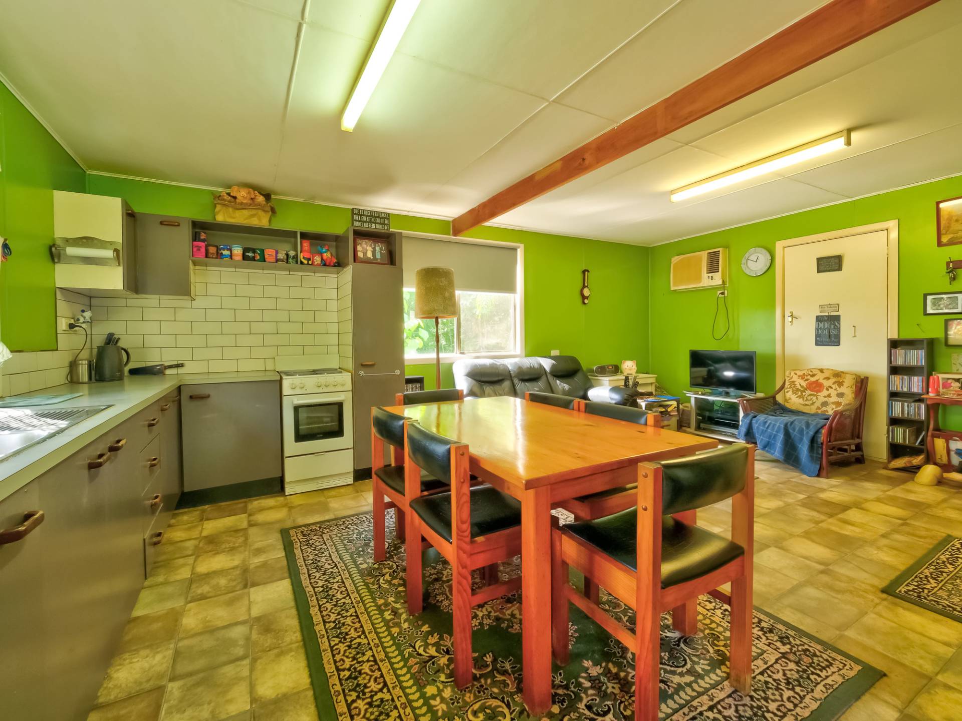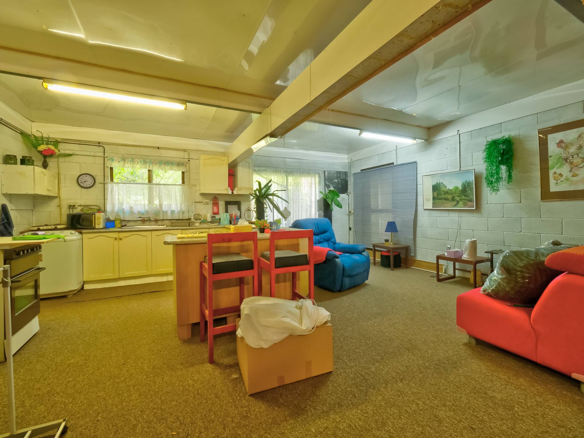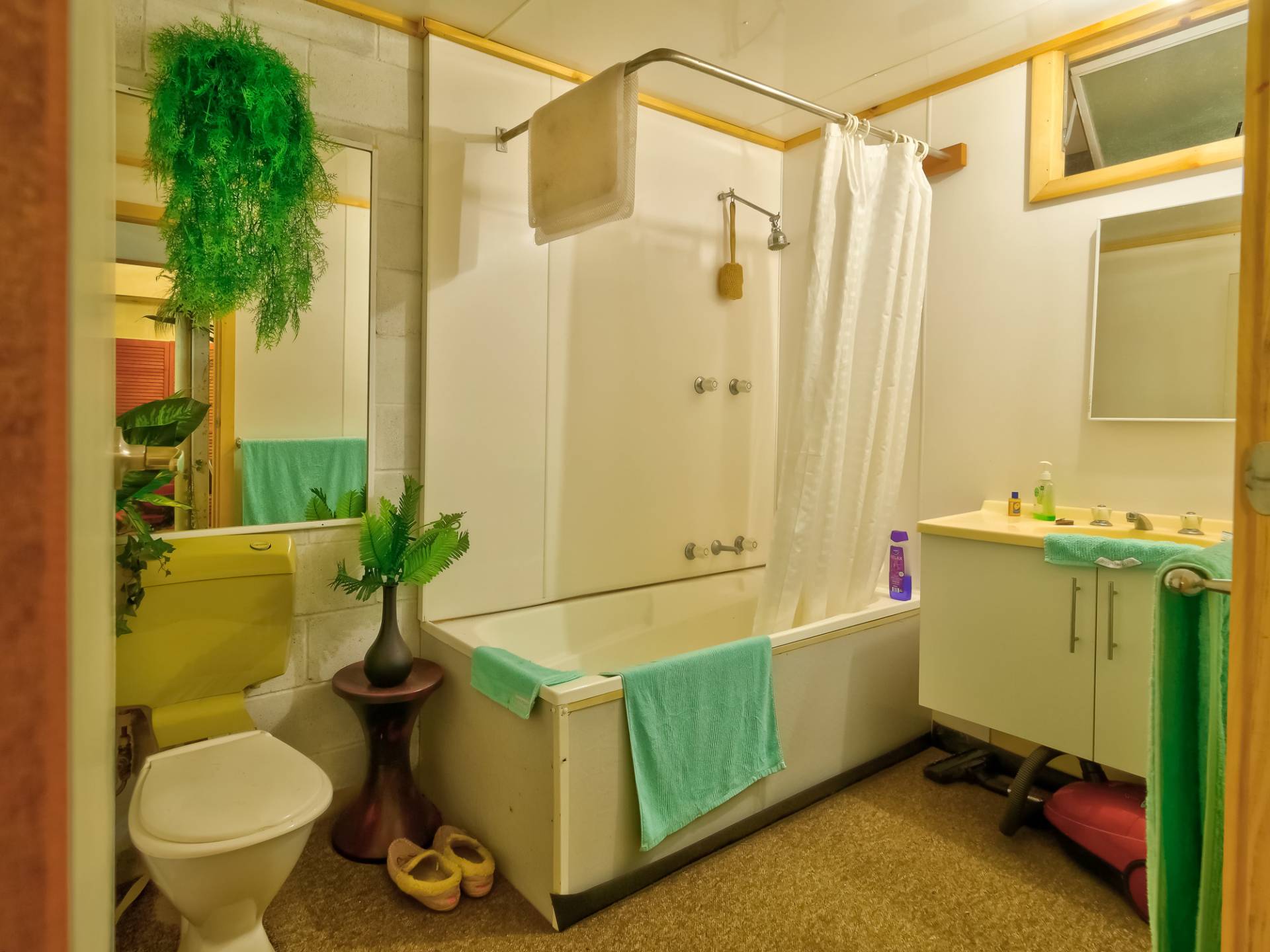 The quirky home has privacy from both vegetation and position. It was made to party! There’s as much living area outside as there is inside. The main house is upstairs where the stairs deliver us to an extensive decked entertaining area, complete with a built-in bar. The wall cladding is timber, in its various forms. Inside, we enter a kitchen/family room that features electric cooking and plenty of bench and storage space. The loungeroom is generous in size and still has the old kitchen that now serves as a bar. Both living rooms are air conditioned. There are two very generous sized bedrooms and one bathroom.