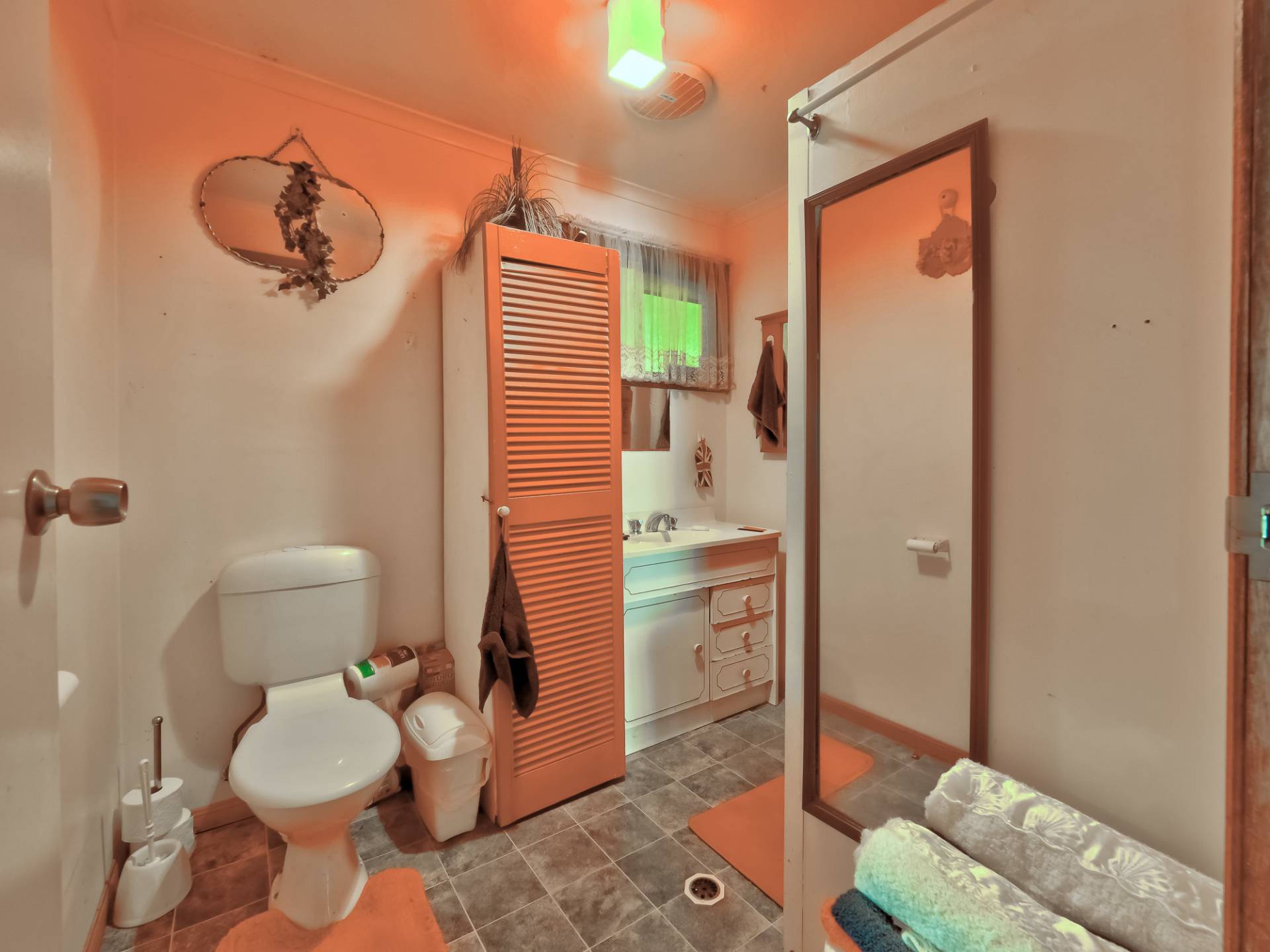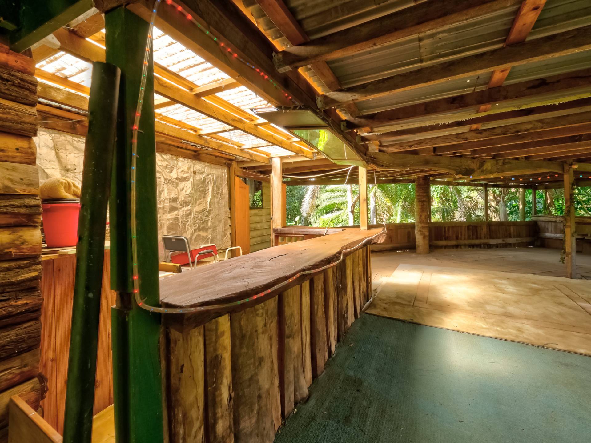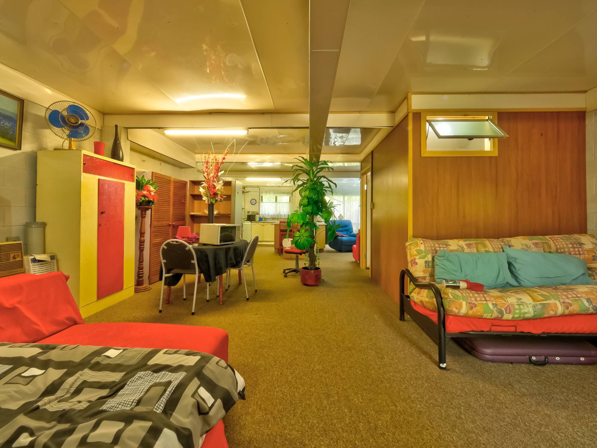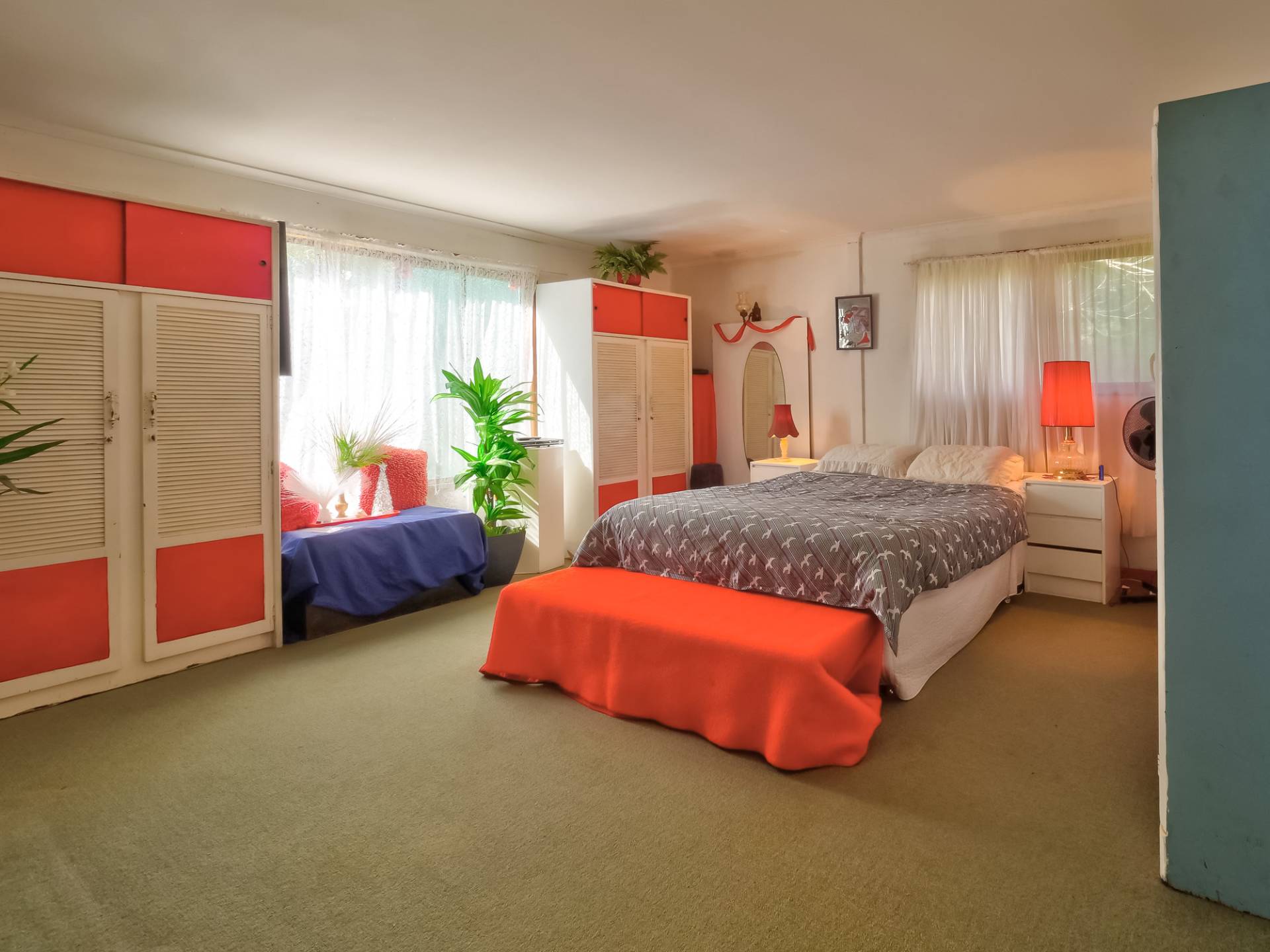 The quirky home has privacy from both vegetation and position. It was made to party! There’s as much living area outside as there is inside. The main house is upstairs where the stairs deliver us to an extensive decked entertaining area, complete with a built-in bar. The wall cladding is timber, in its various forms. Inside, we enter a kitchen/family room that features electric cooking and plenty of bench and storage space. The loungeroom is generous in size and still has the old kitchen that now serves as a bar. Both living rooms are air conditioned. There are two very generous sized bedrooms and one bathroom.
