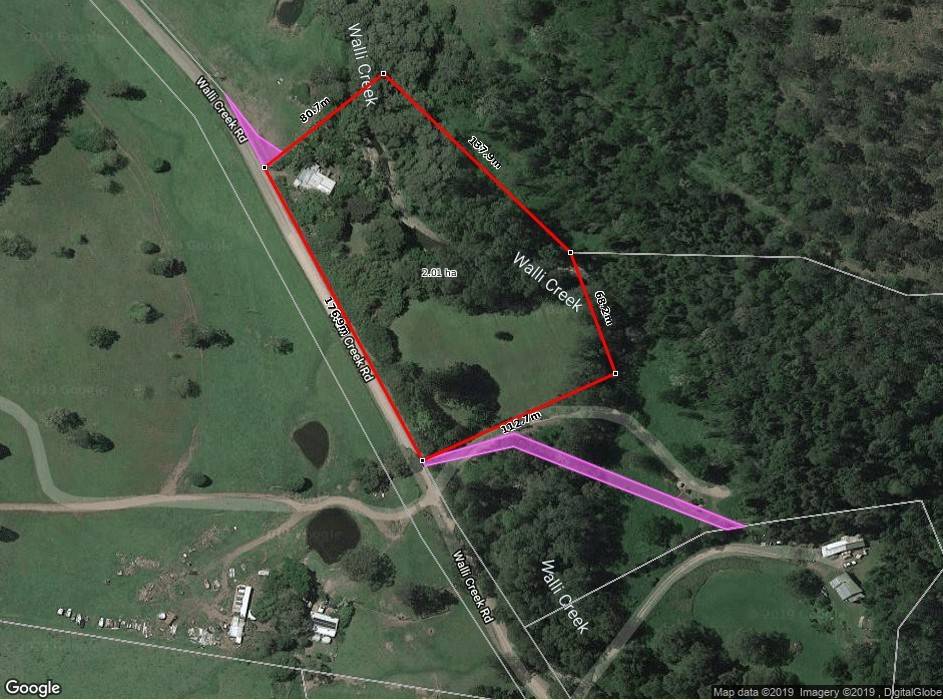 The 5-acre (2.01 ha) block at 105 Walli Creek Rd has some mature palms and tropical plants as well as some remnant rainforest and a creek (Walli Creek). What a setting!
