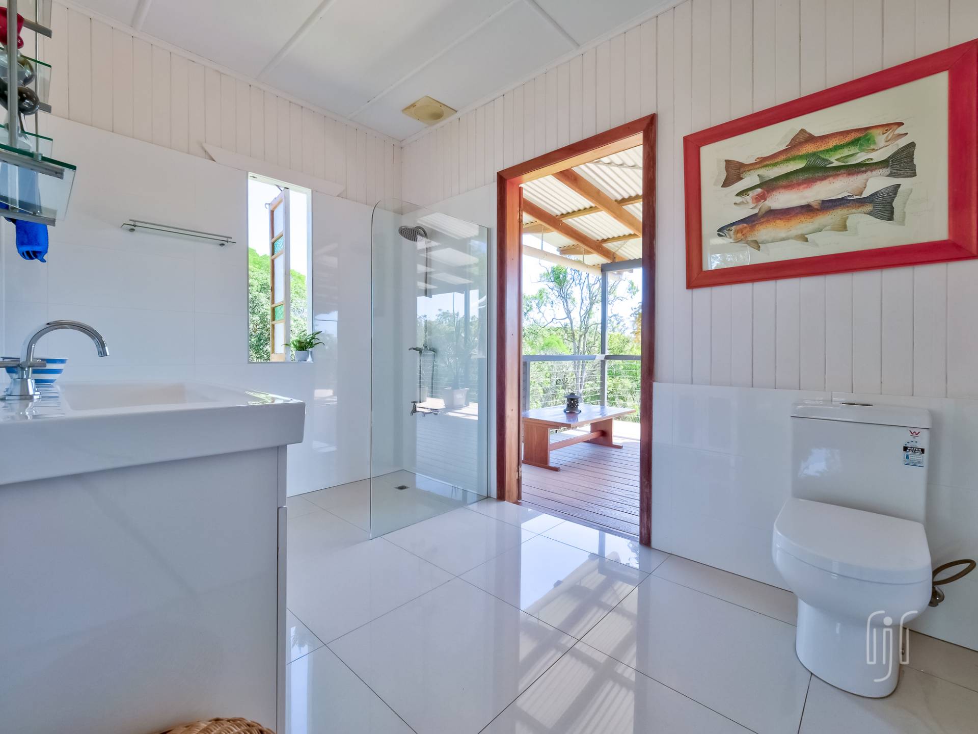 The kitchen features timber open-shelf storage cupboards complemented by a suspended ladder for hanging pots. It also features timber benchtops, a freestanding electric stove and air conditioning. There are two large bedrooms and a bathroom with a modern fit-out that includes a walk-in shower. The kitchen and bathroom both have direct access to a north-facing, full-length deck with a great view.
