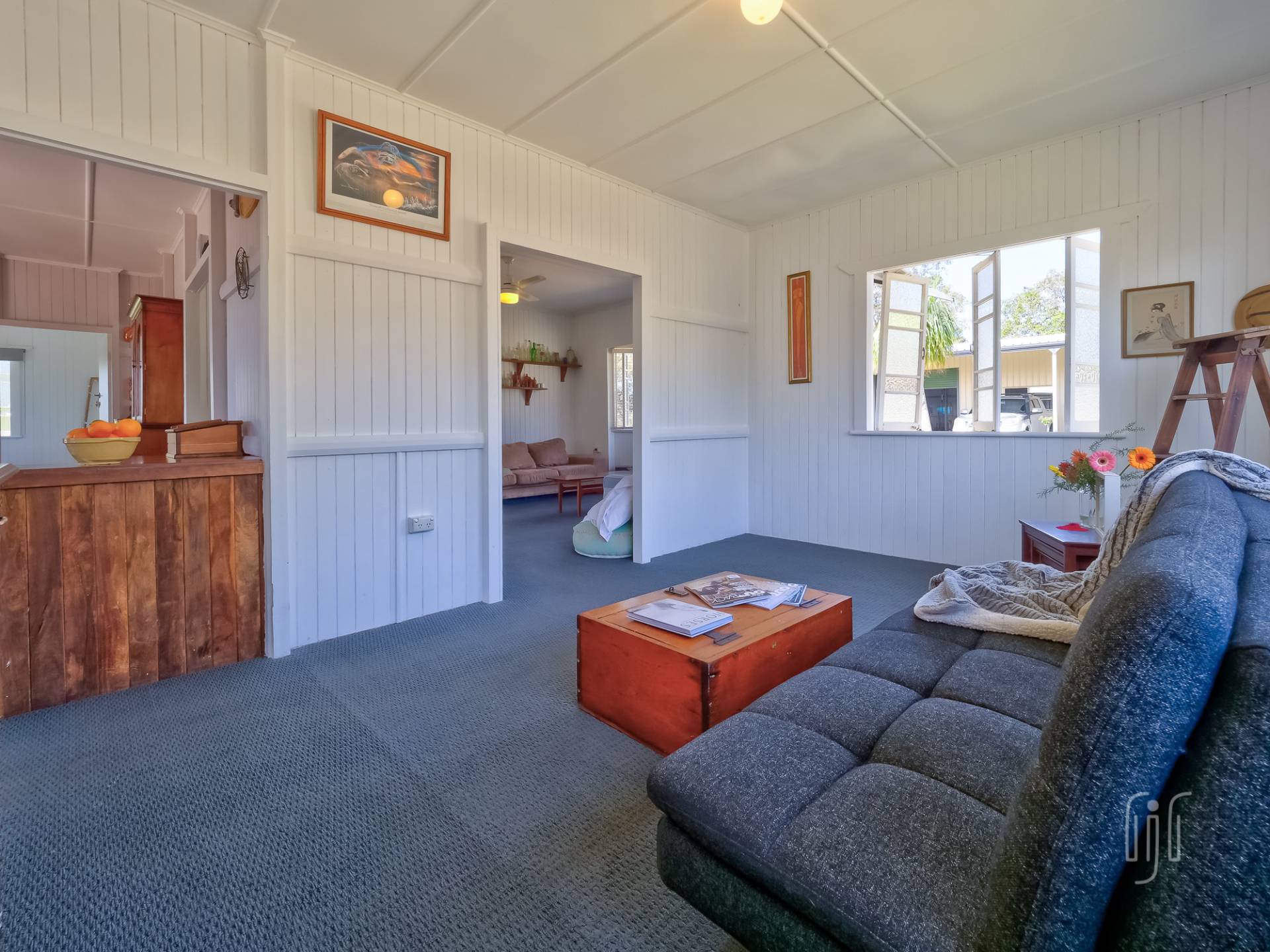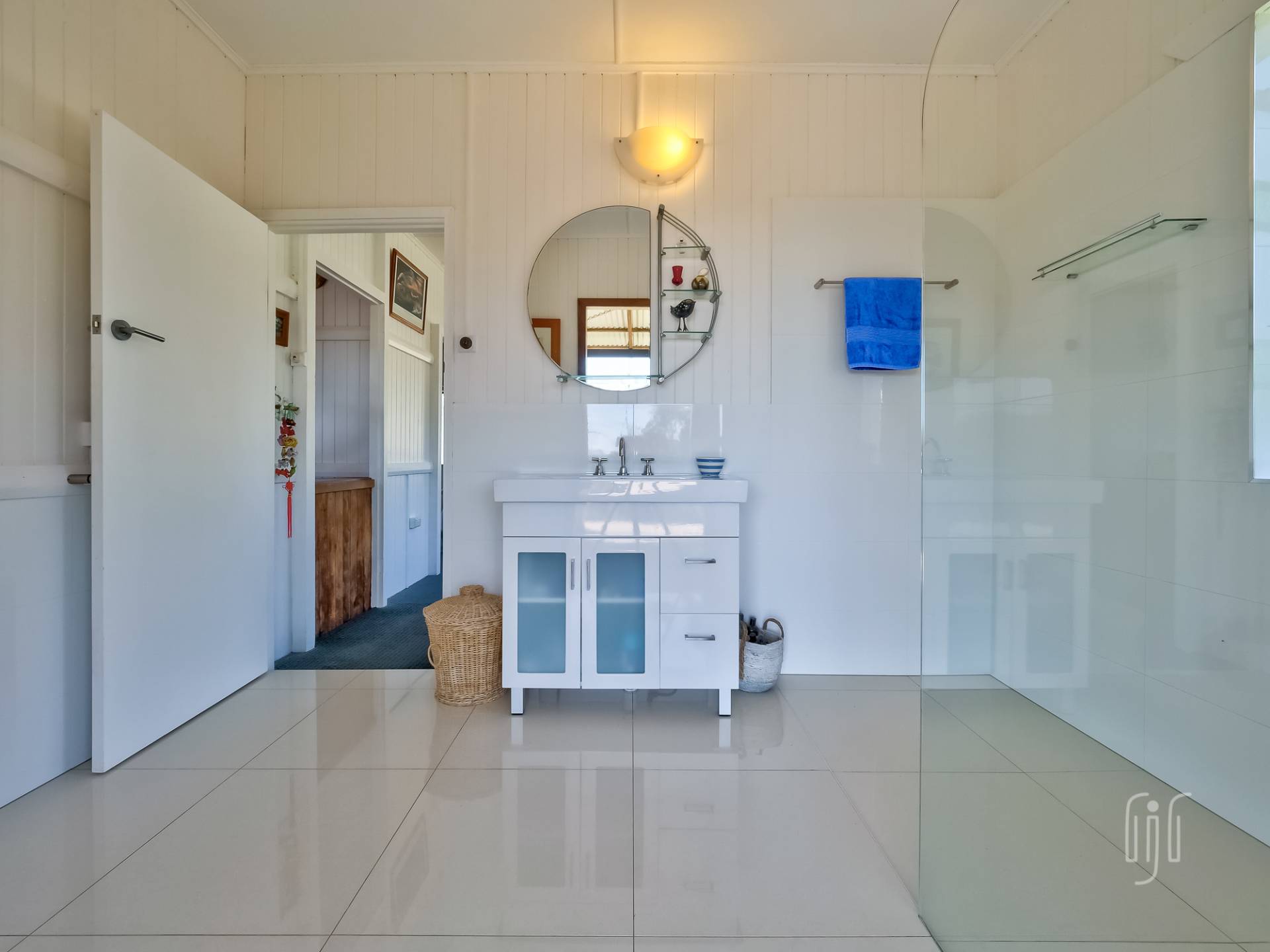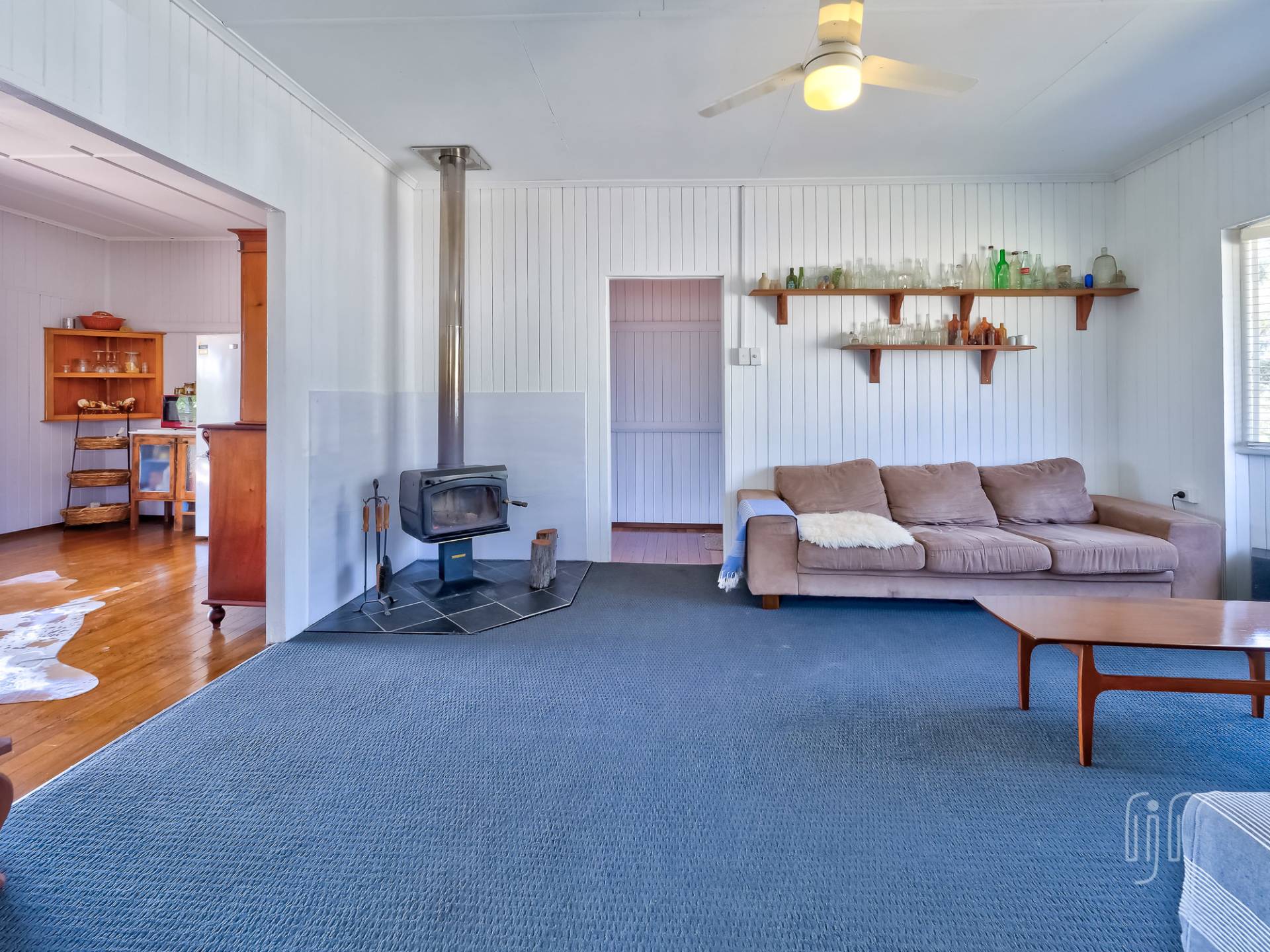 The renovated, weatherboard-clad Queenslander was relocated to this site and therefore, has new stumps and roof because of the move. You enter a short hallway that leads to either the lounge or kitchen. The lounge has the style with a large bay window, full of casement windows, and slow combustion heating. There are two semi-separated living areas. The loungeroom being the first plus a second light-filled day-room, with casement windows on two sides.