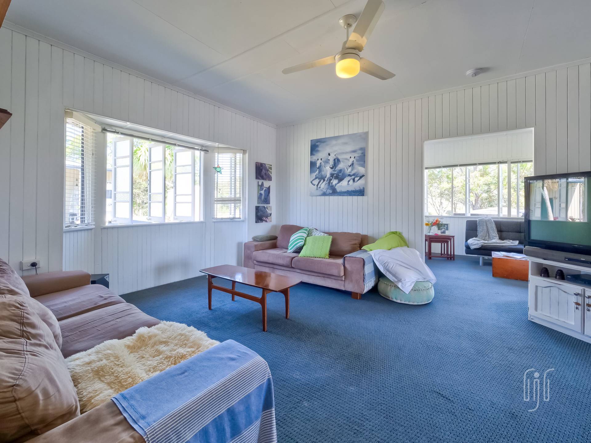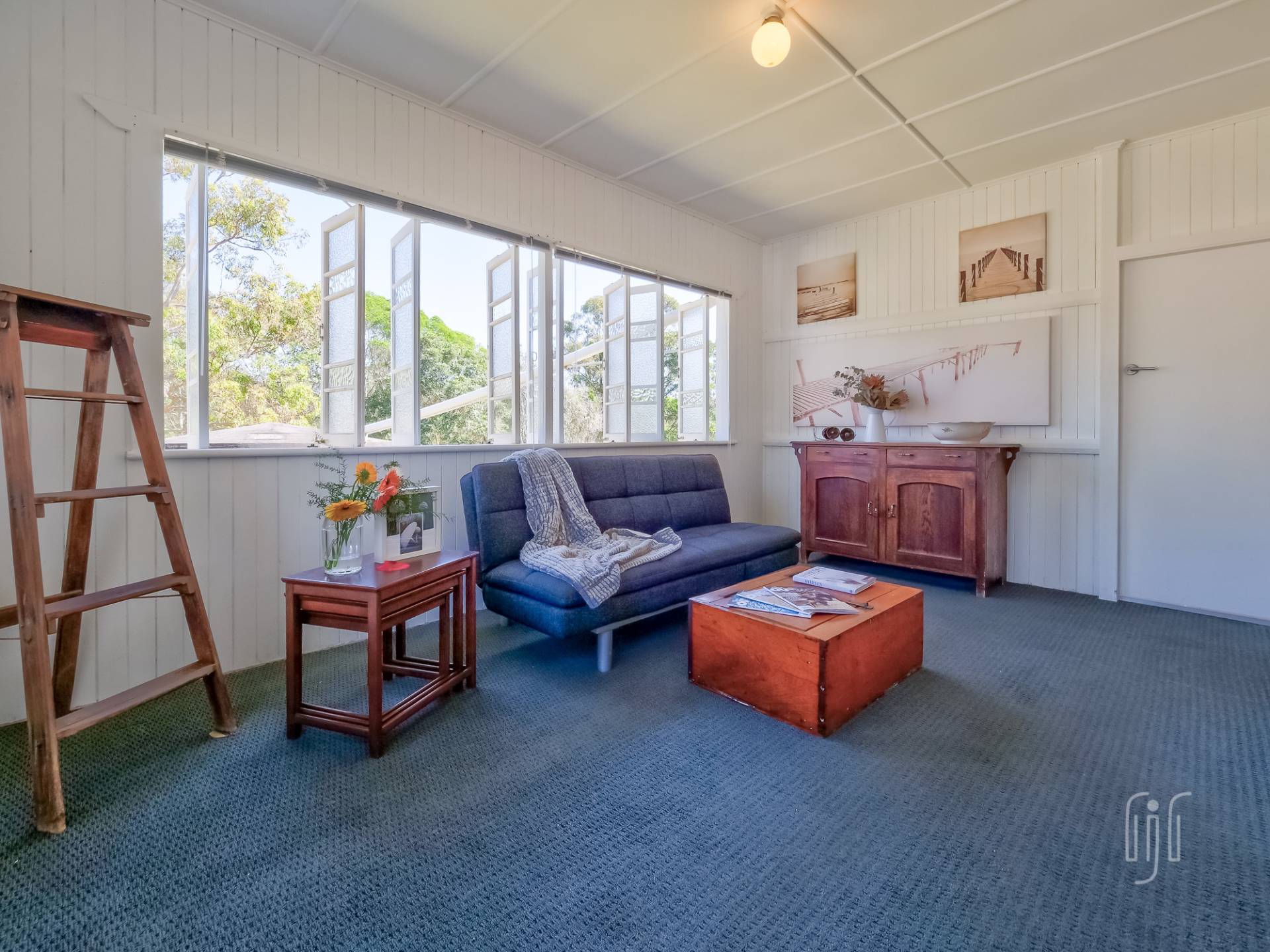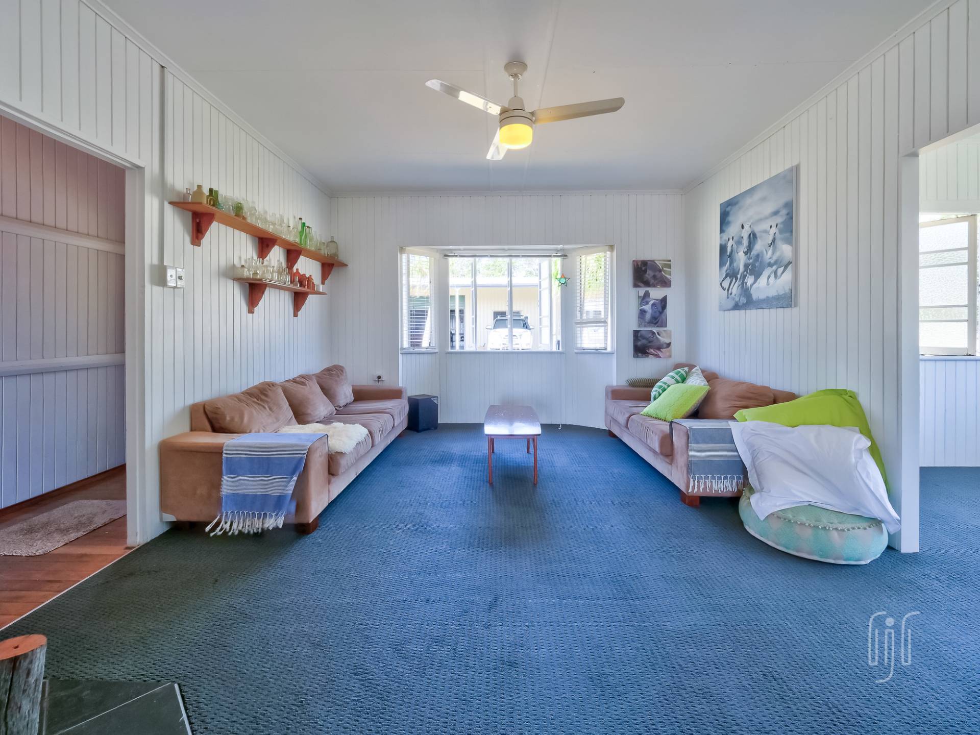 The renovated, weatherboard-clad Queenslander was relocated to this site and therefore, has new stumps and roof because of the move. You enter a short hallway that leads to either the lounge or kitchen. The lounge has the style with a large bay window, full of casement windows, and slow combustion heating. There are two semi-separated living areas. The loungeroom being the first plus a second light-filled day-room, with casement windows on two sides.