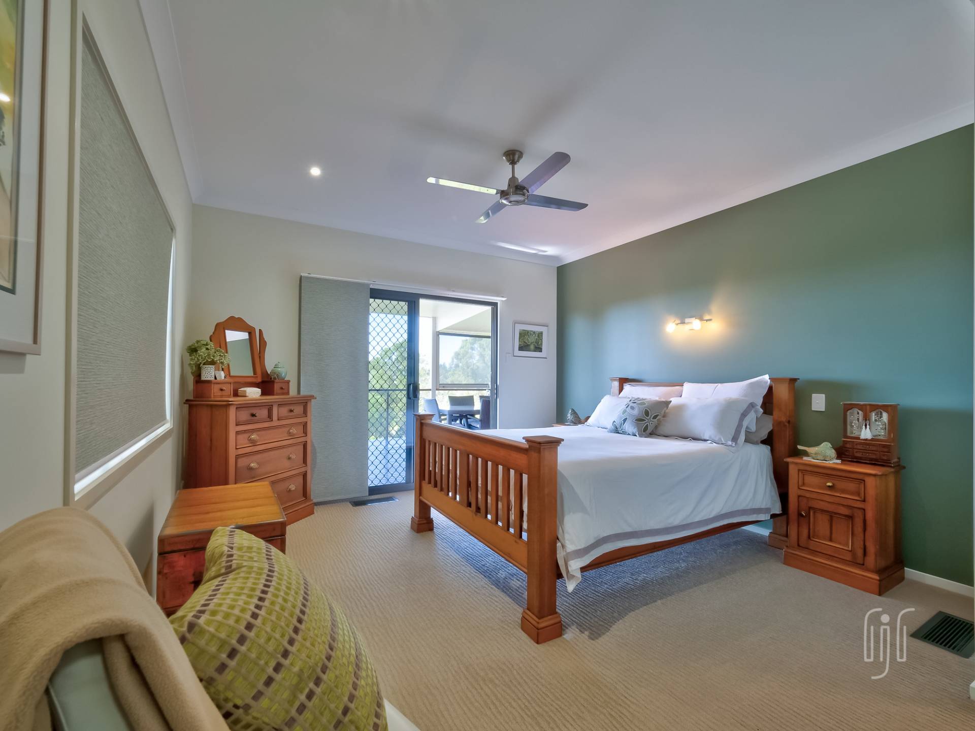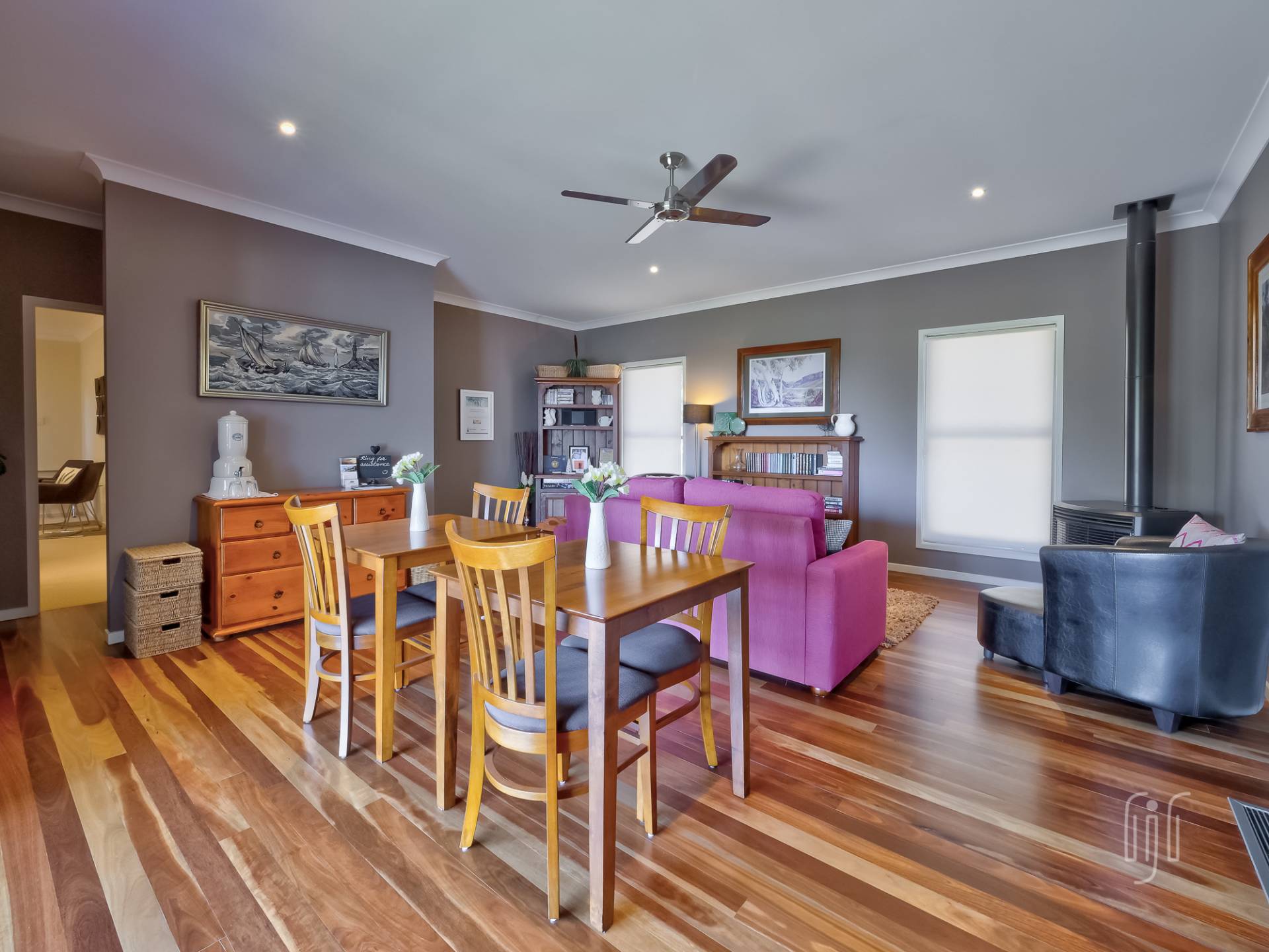 The second living area could be a guest loungeroom in the Bed & Breakfast or the formal lounge in a family home. It also has gas heating & polished timber floors, and gives access to the other two en-suited bedrooms. These bedrooms have individual access from the side veranda. The whole house enjoys ducted reverse cycle air conditioning.