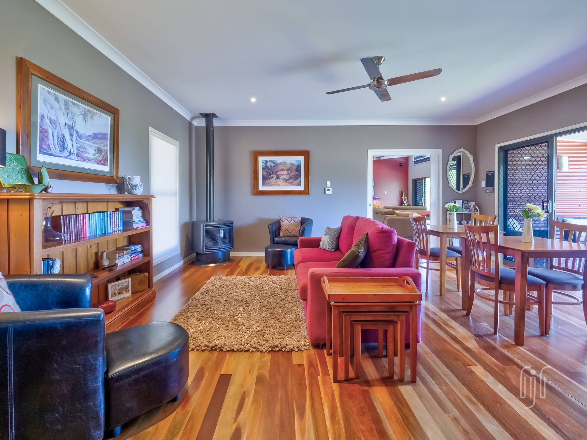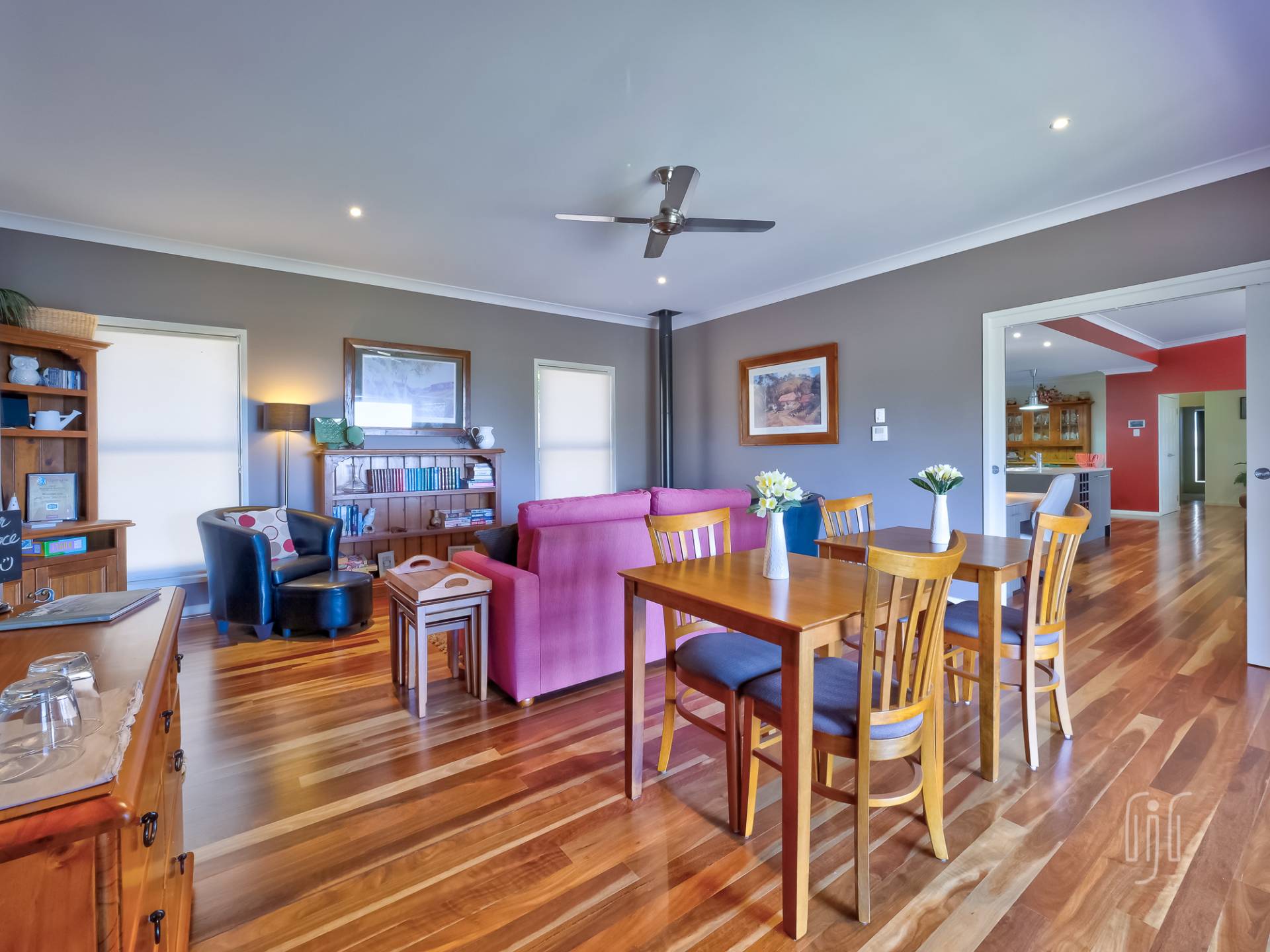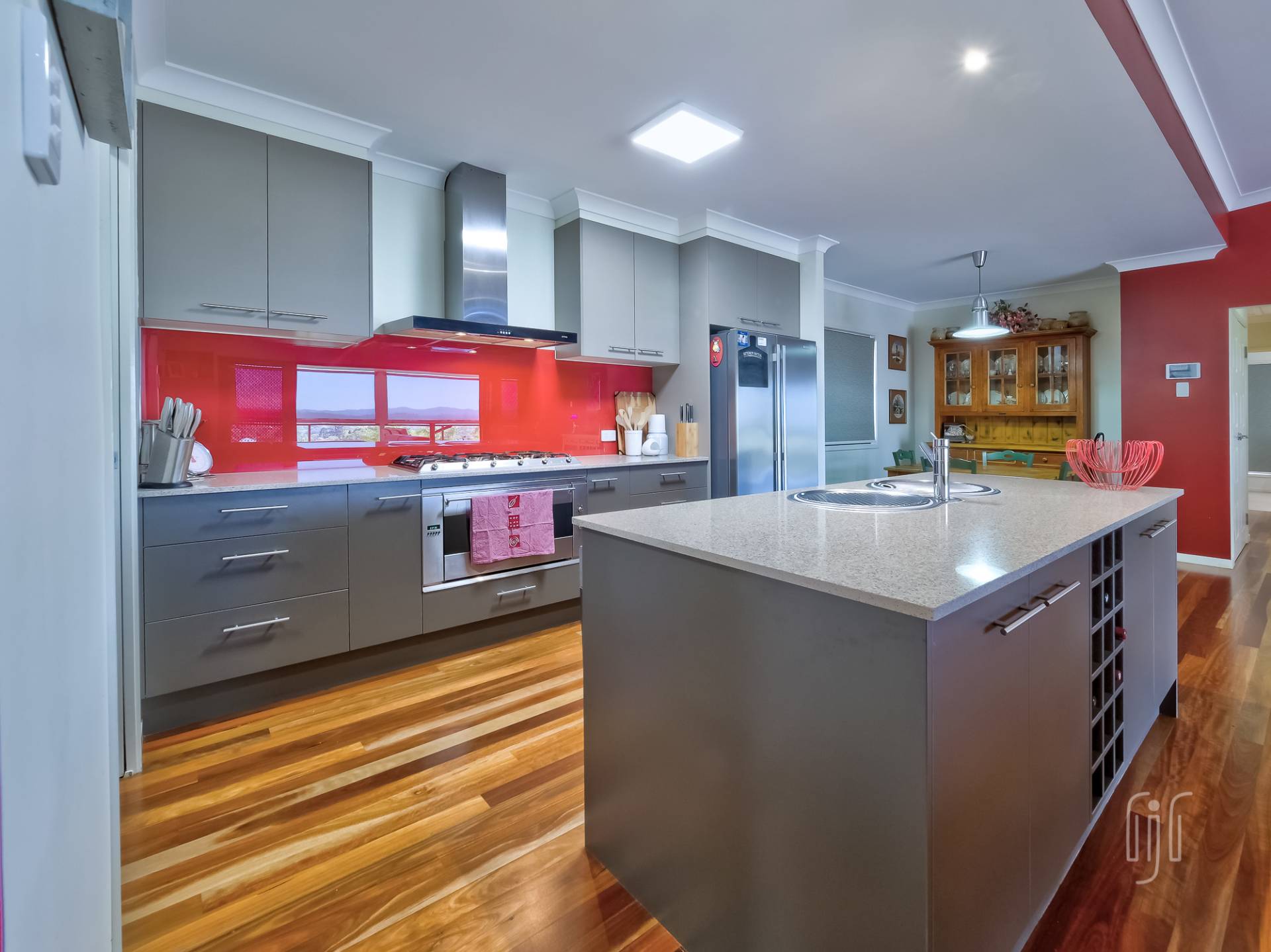 Externally, the striking modern-design features contrasting materials (Colorbond & Hardiplank), and bold colours (grey & red). A wide full- length front veranda takes in the view and extends the living area, for both owners and their guests. Internally, the home is cleverly divided between the two living areas.