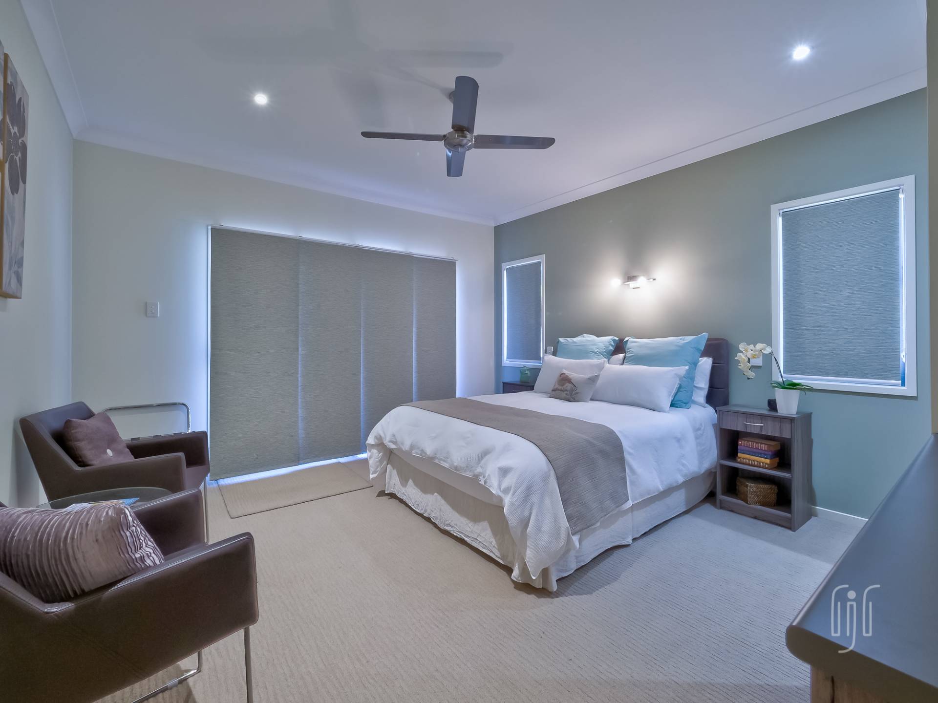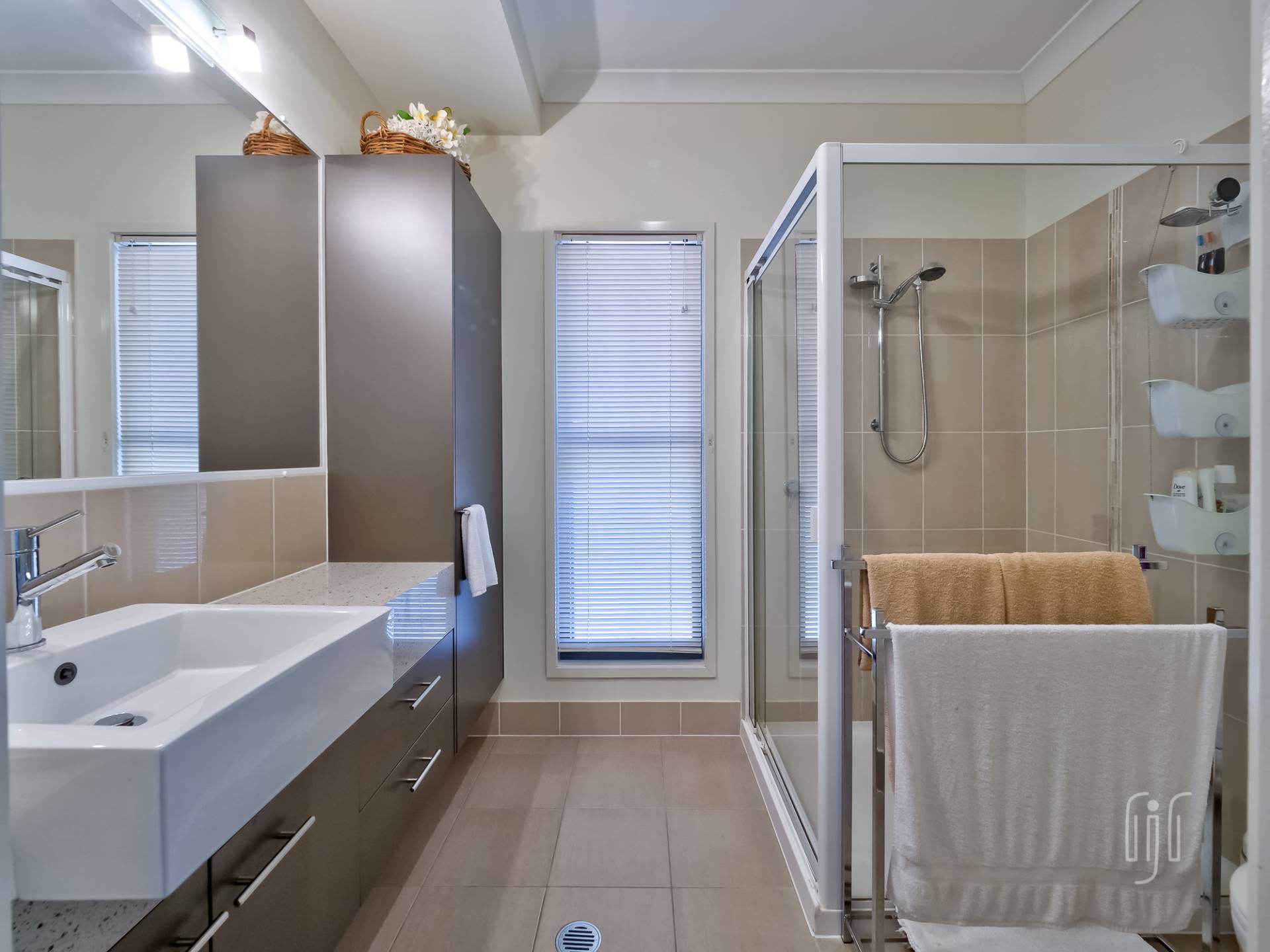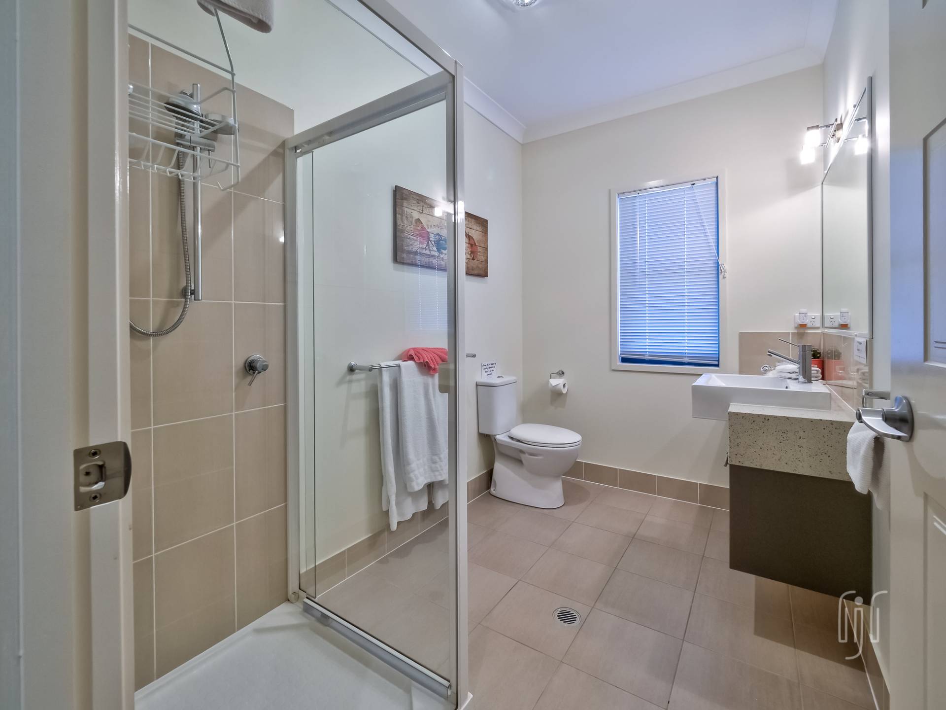 Externally, the striking modern-design features contrasting materials (Colorbond & Hardiplank), and bold colours (grey & red). A wide full- length front veranda takes in the view and extends the living area, for both owners and their guests. Internally, the home is cleverly divided between the two living areas.