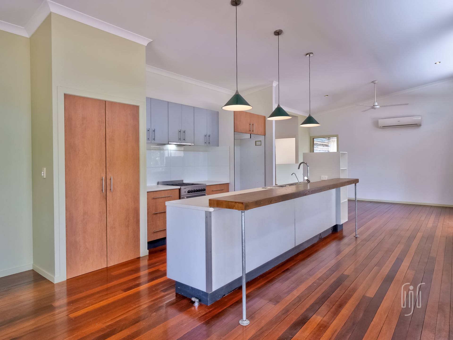 The air conditioned, open plan living area has a kitchen as the centre. The island bench, with a unique breakfast bar, splits the living area ... lounge one end, dining at the other. The kitchen has gas cooking and a dishwasher, the living room has vaulted ceilings, the whole house has polished timber floors!