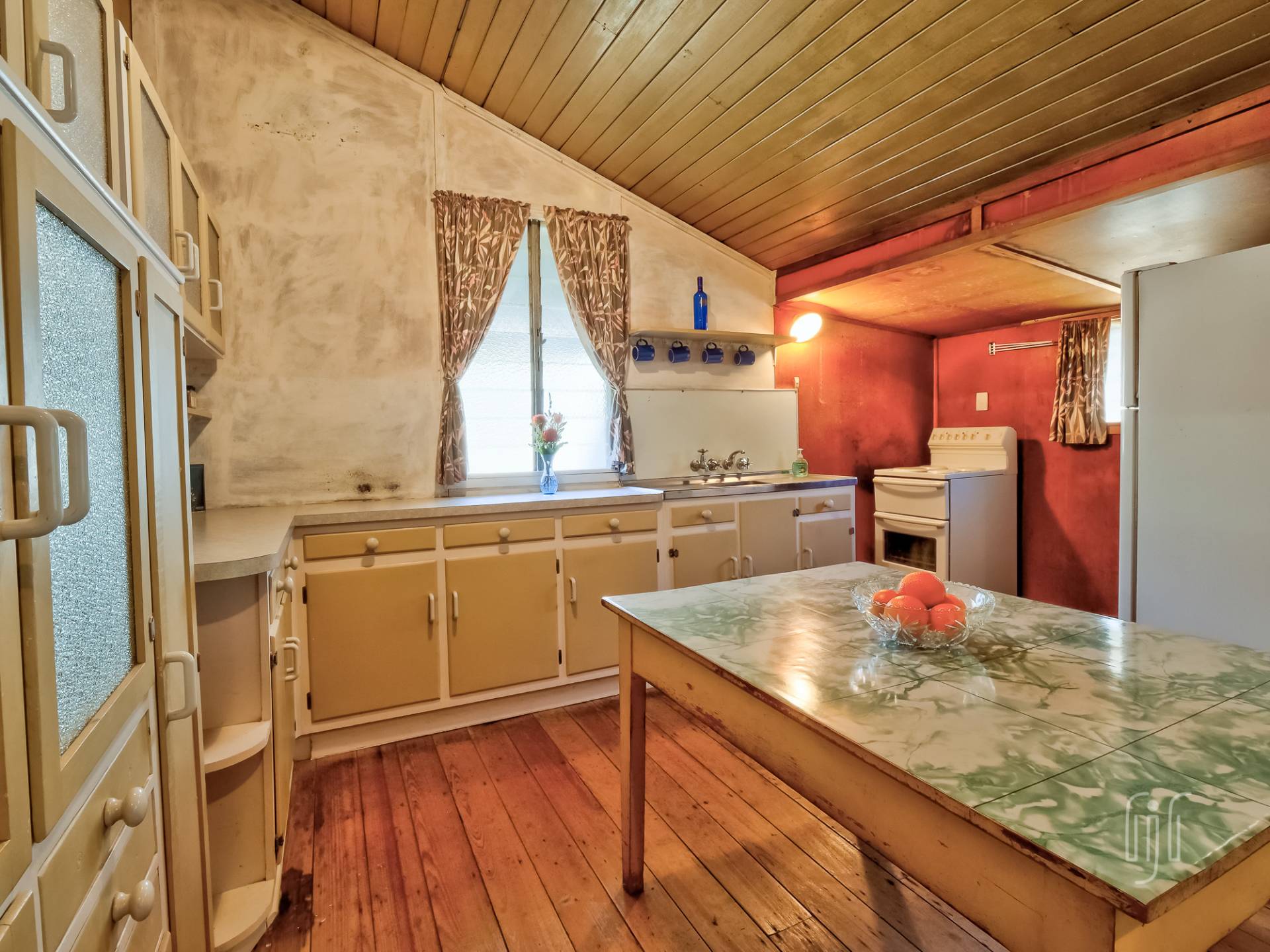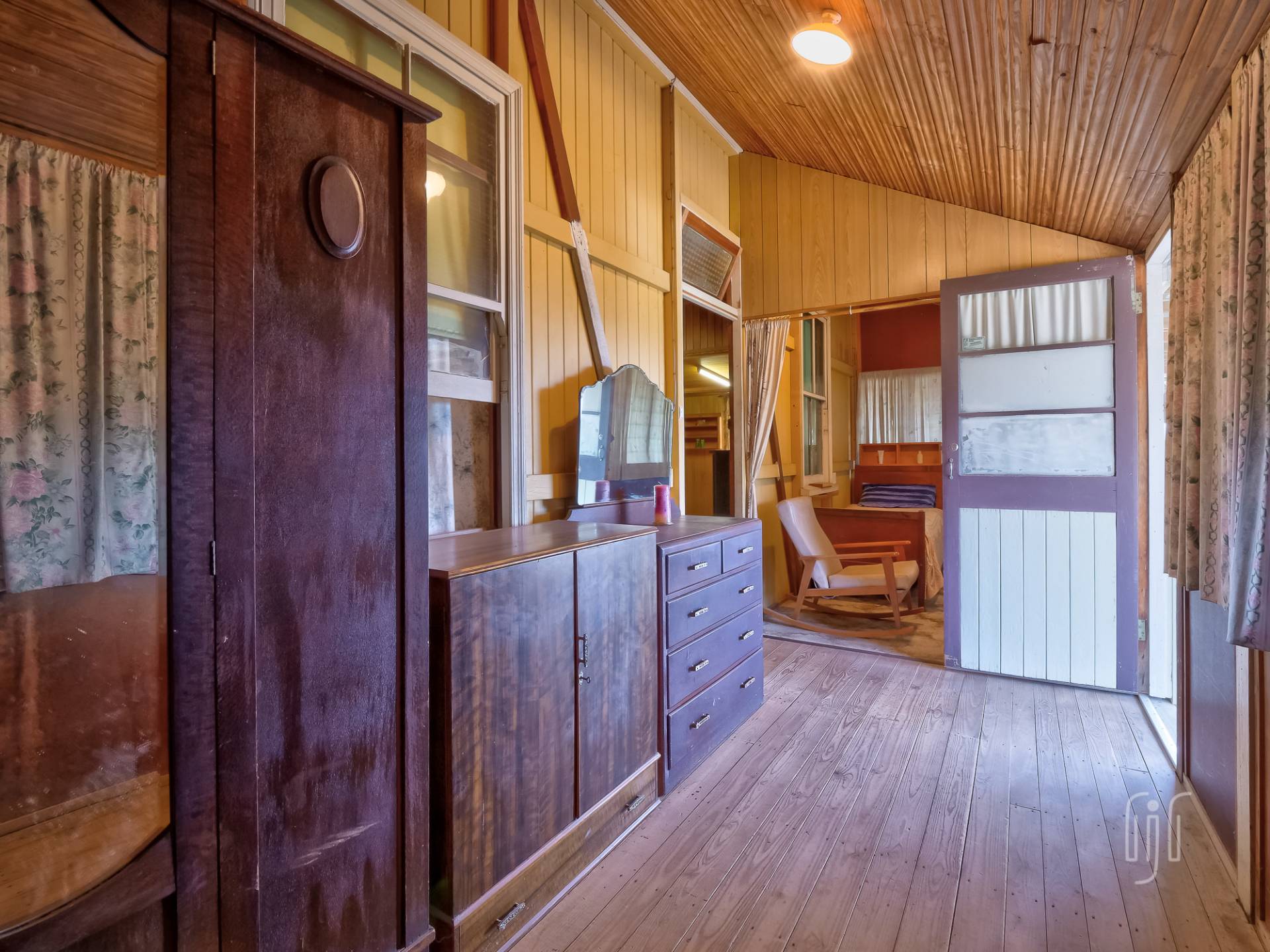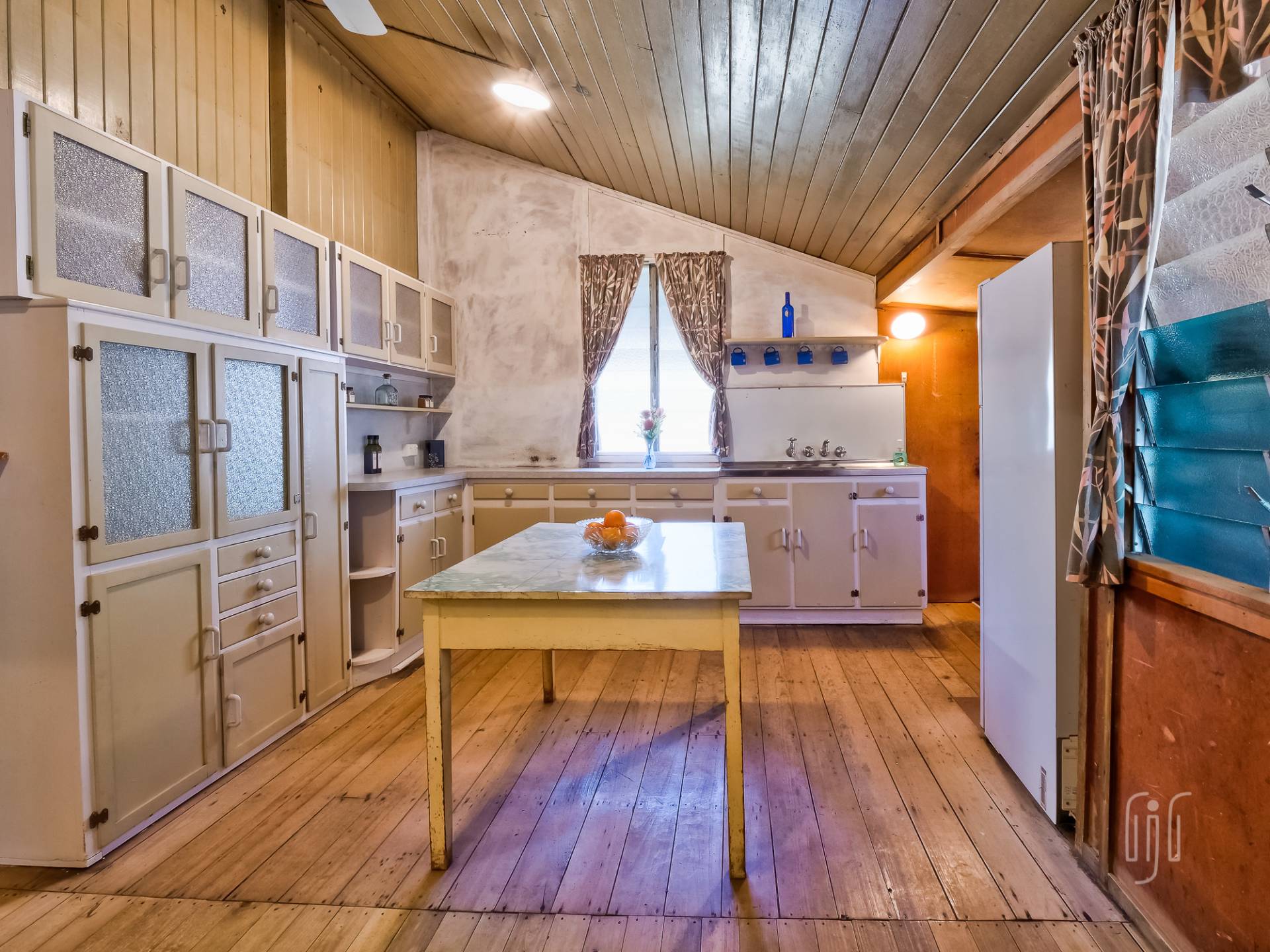 The 180 deg north-easterly view is spectacular from the L-shaped front deck. It’s from here that you enter a small reception room/sleepout before continuing through to a main living area, big enough to accommodate both lounge and dining. This room has high ceilings, picture rails, and a built-in cupboard. Most of the house has genuine timber panelling. Some of the old floorcoverings have been removed to reveal the original timber floor boards. All the windows are either double hung or louvred.