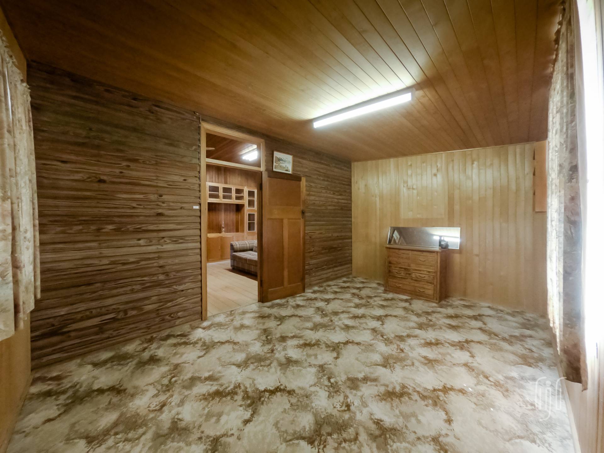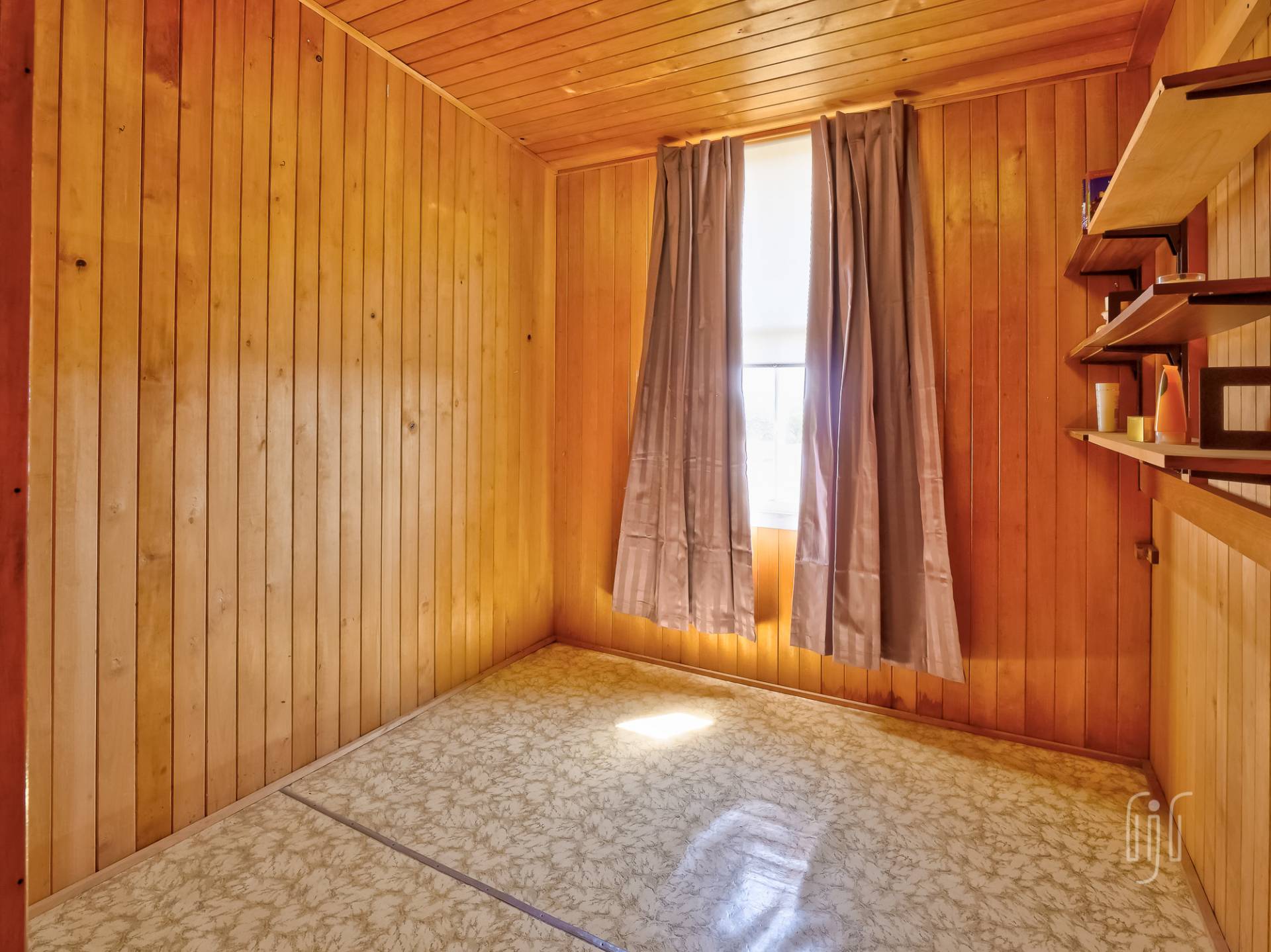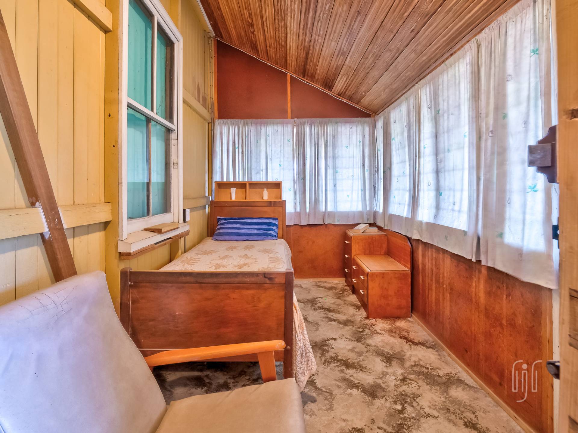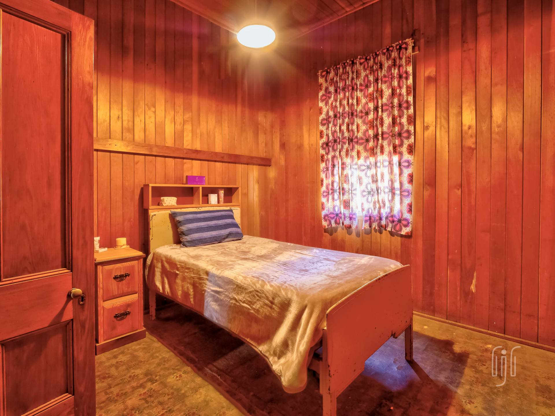 The 180 deg north-easterly view is spectacular from the L-shaped front deck. It’s from here that you enter a small reception room/sleepout before continuing through to a main living area, big enough to accommodate both lounge and dining. This room has high ceilings, picture rails, and a built-in cupboard. Most of the house has genuine timber panelling. Some of the old floorcoverings have been removed to reveal the original timber floor boards. All the windows are either double hung or louvred.
