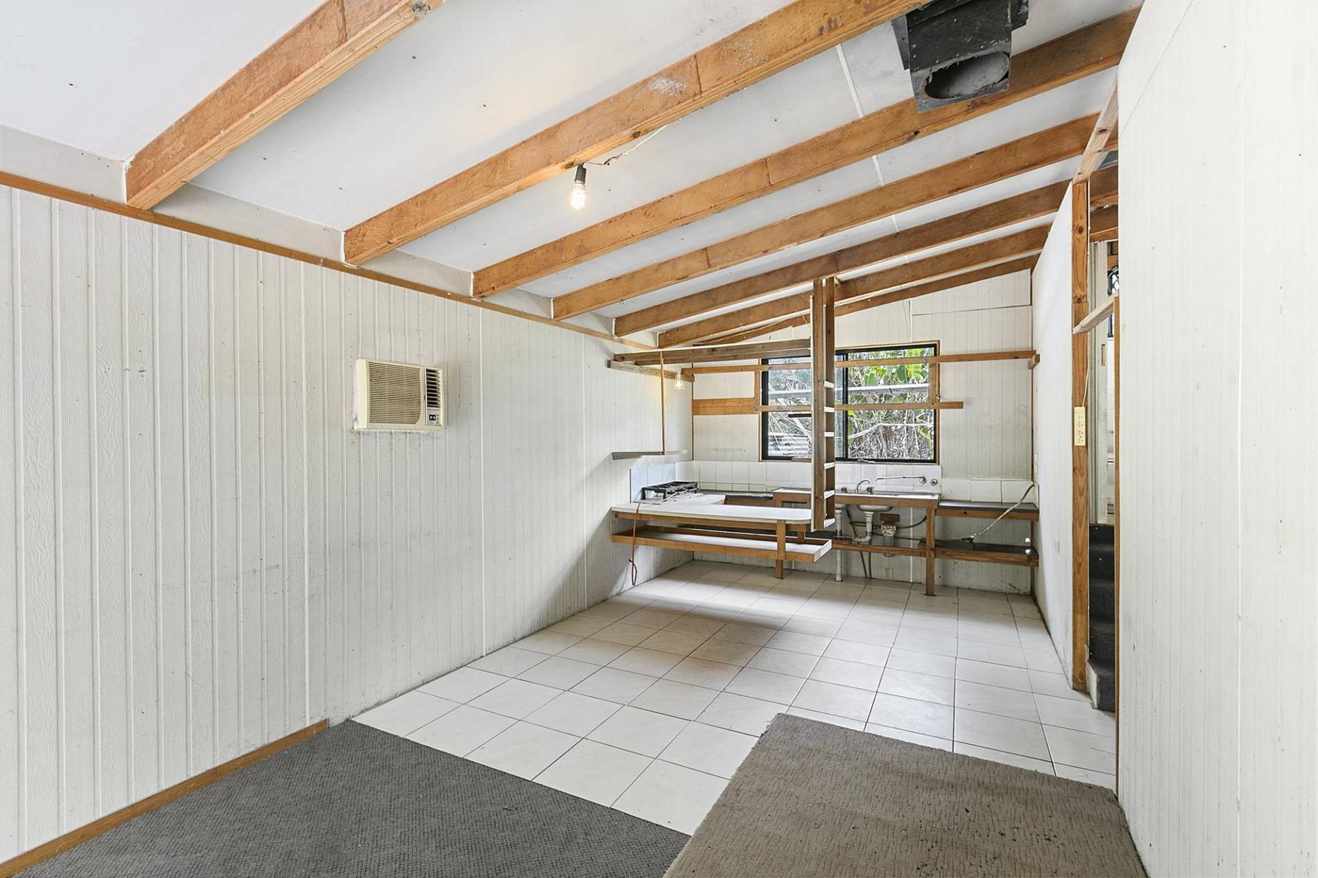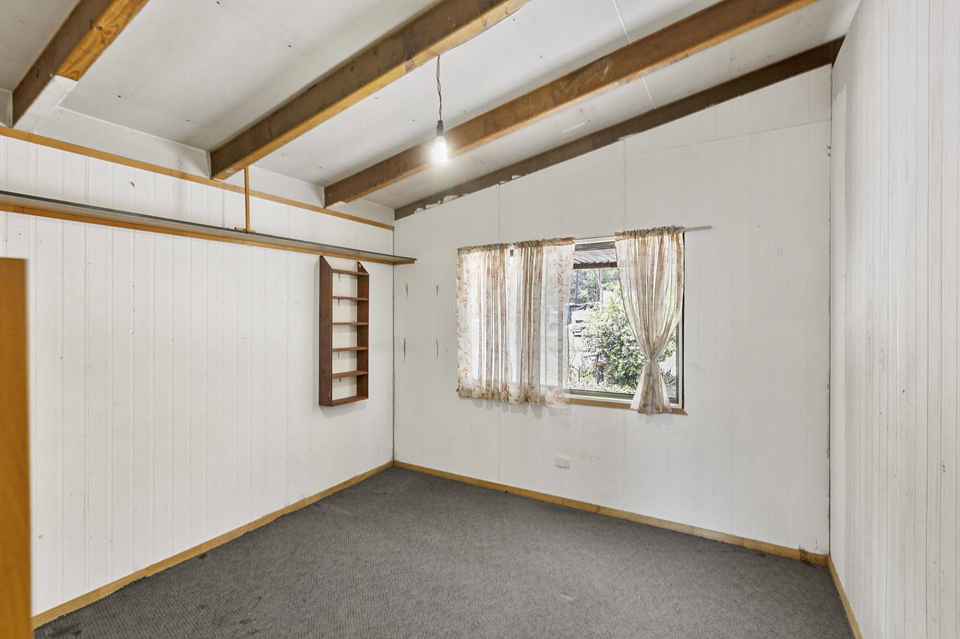 The weekender on this property is akin to a liveable shed. There’s a veranda out the front and living area inside that includes an “agricultural style” kitchen with open shelving and some gas burners. There are two bedrooms and bathroom facilities. Some of the walls are only partly lined.