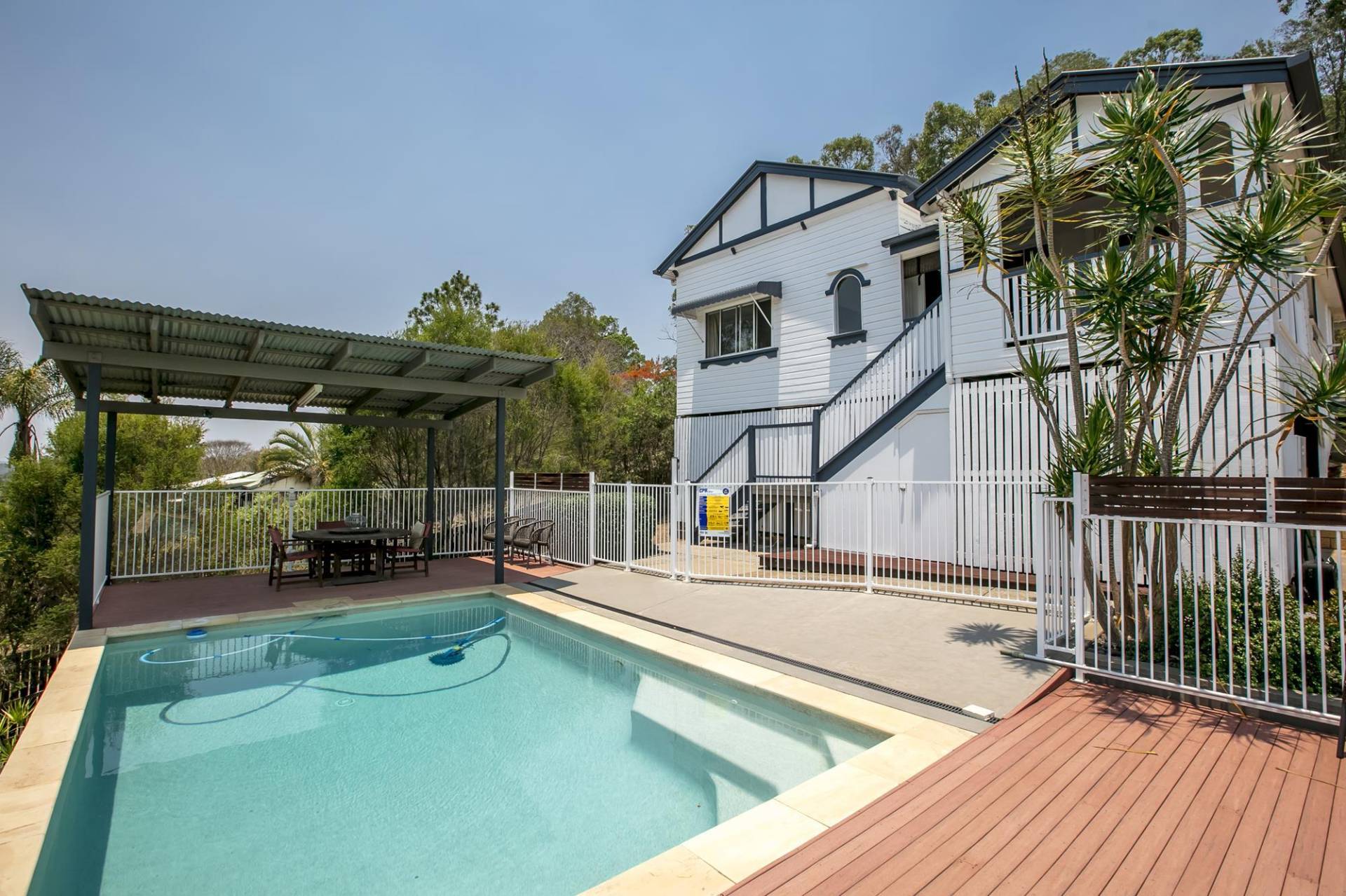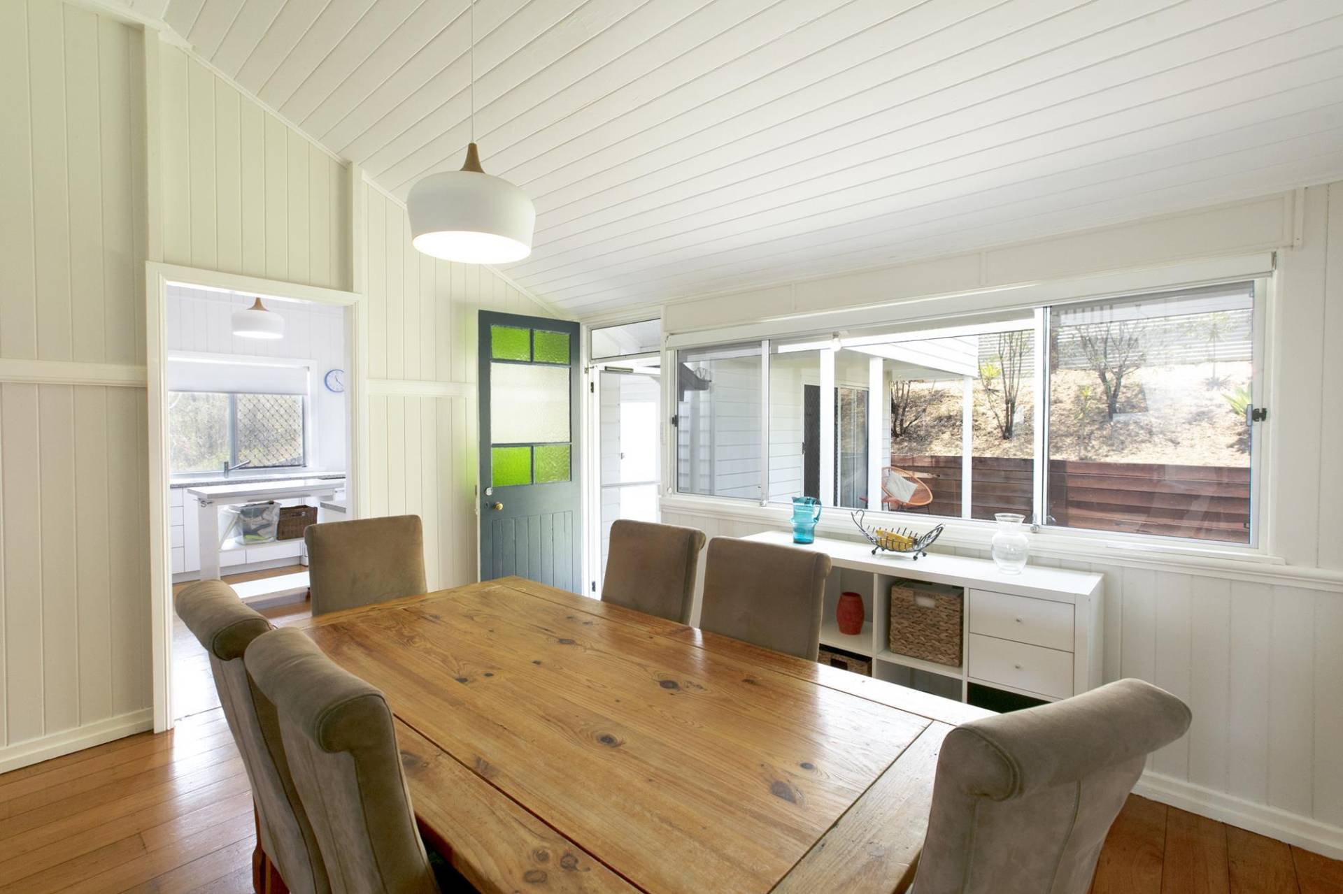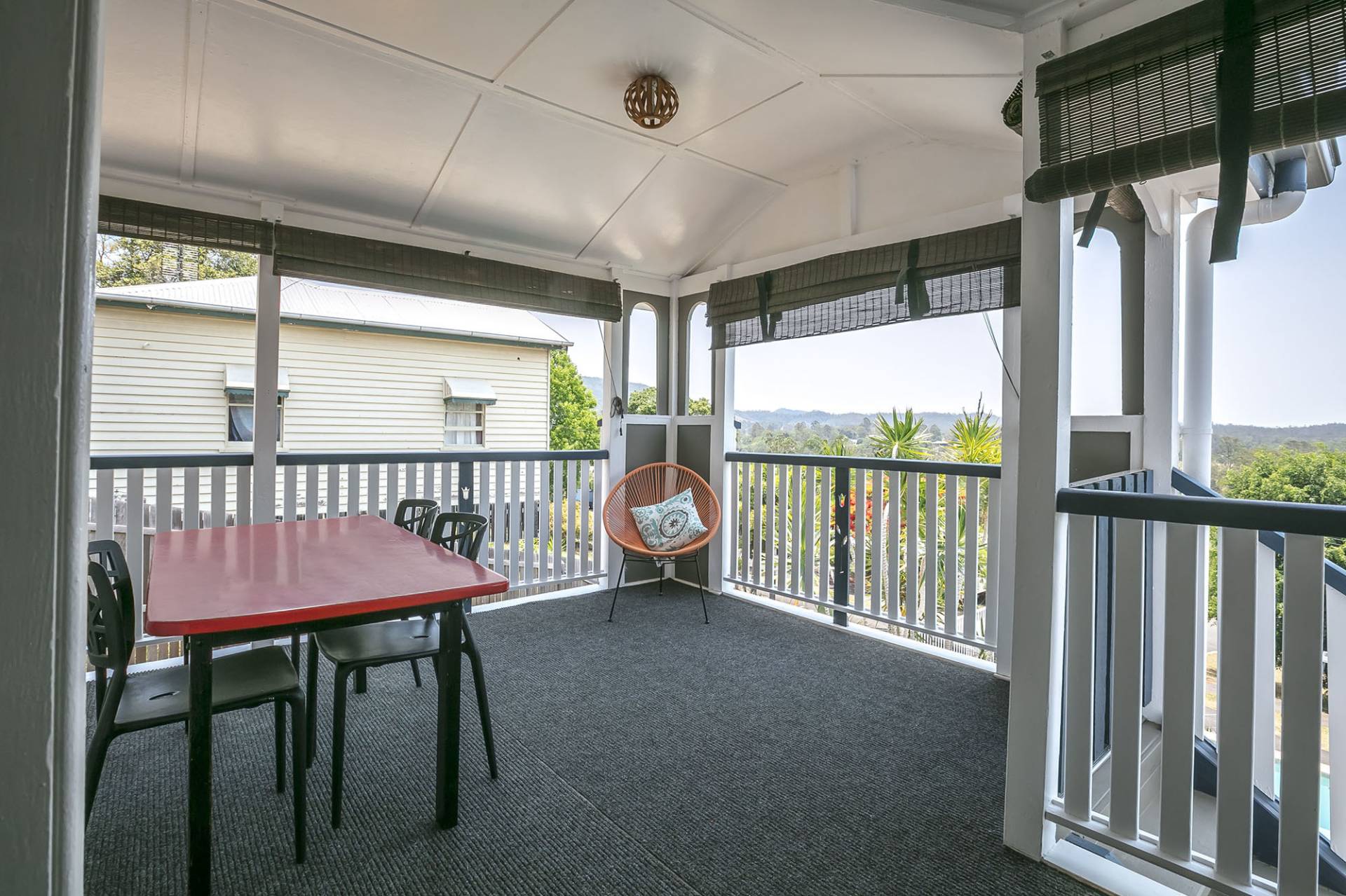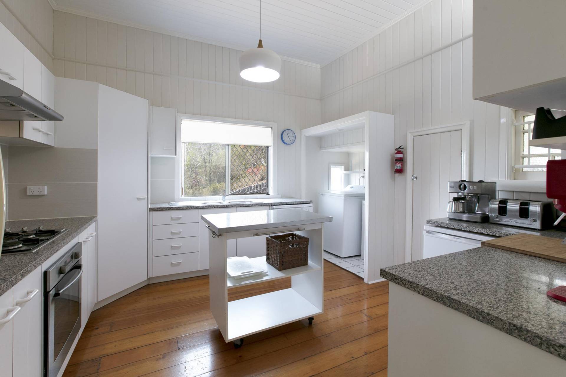 The front stairs at the house lead to a wide front veranda with an awesome northerly view over the pool, the village and beyond. Inside, it’s an immaculately presented Queenslander with all the usual features: high ceilings, timber walls & ceilings, period trims and polished timber floors. There are also modern touches like air conditioning!